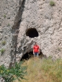Karel se vydrápal na protější svah kvůli fotce v horním okně, kam se ale nakonec stejně nedostal. Situaci kontrolujeme z dálky pomocí maximálního zoomu, abychom nemuseli na slunce.