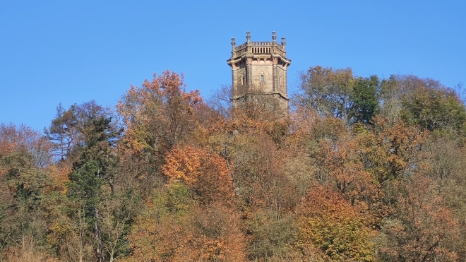 Mne modrá vede okruhem V. Levého k zvoničce do Tupadel, odkud projedu Hlubokým dolem k dolu Vidímskému. Nad barvami hořící stráň se pyšně vyvyšuje rozhledna zámečku Slavín, kde je dnes meditační centrum. V údolí pod skalami vyplaším kvarteto laní, které přede mnou prchají do prudkého svahu. Jejich ladný pohyb sledují dokud mi nezmizí z dohledu.