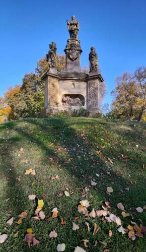 Barokní sochařské dílo z počátku 18. st. zobrazuje sv. Šebestiána, Martina a Rocha. Nad podstavcem se zvedá štíhlý nástavec vrcholící sochou sv. Mikuláše Tolentínského.
