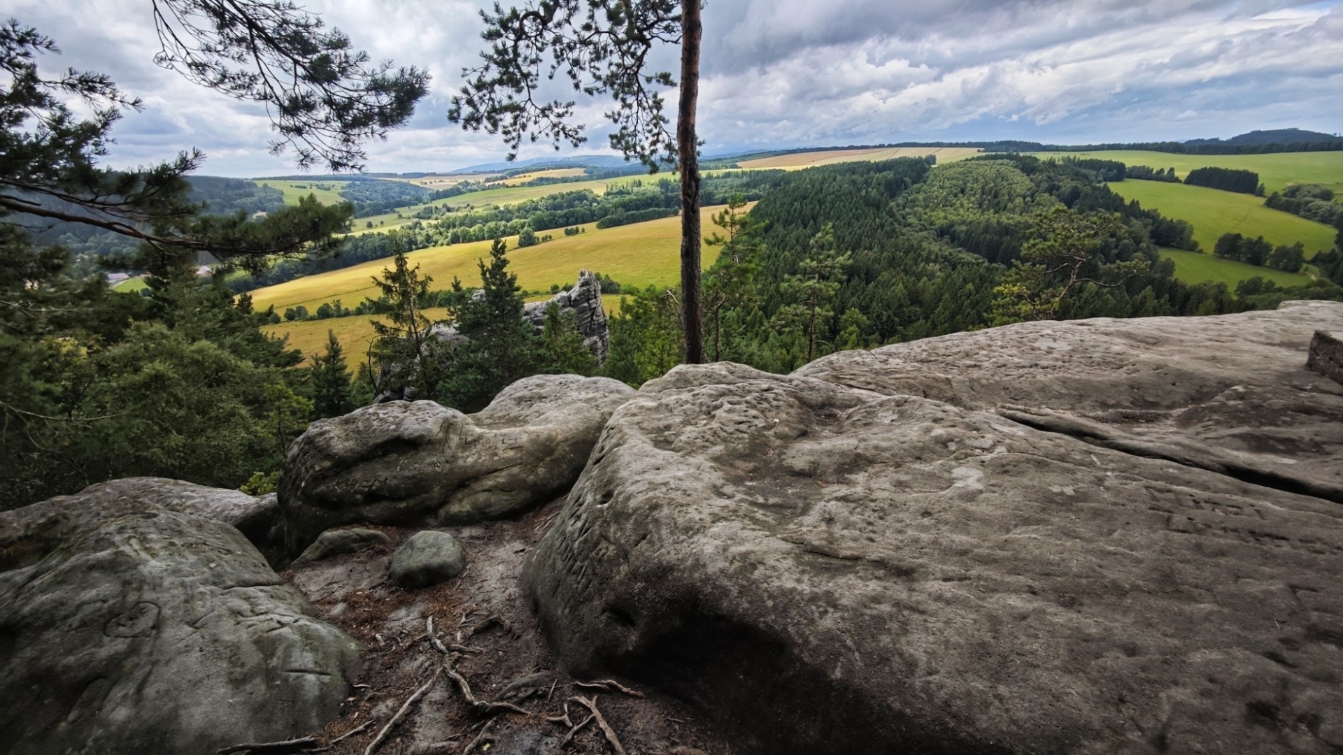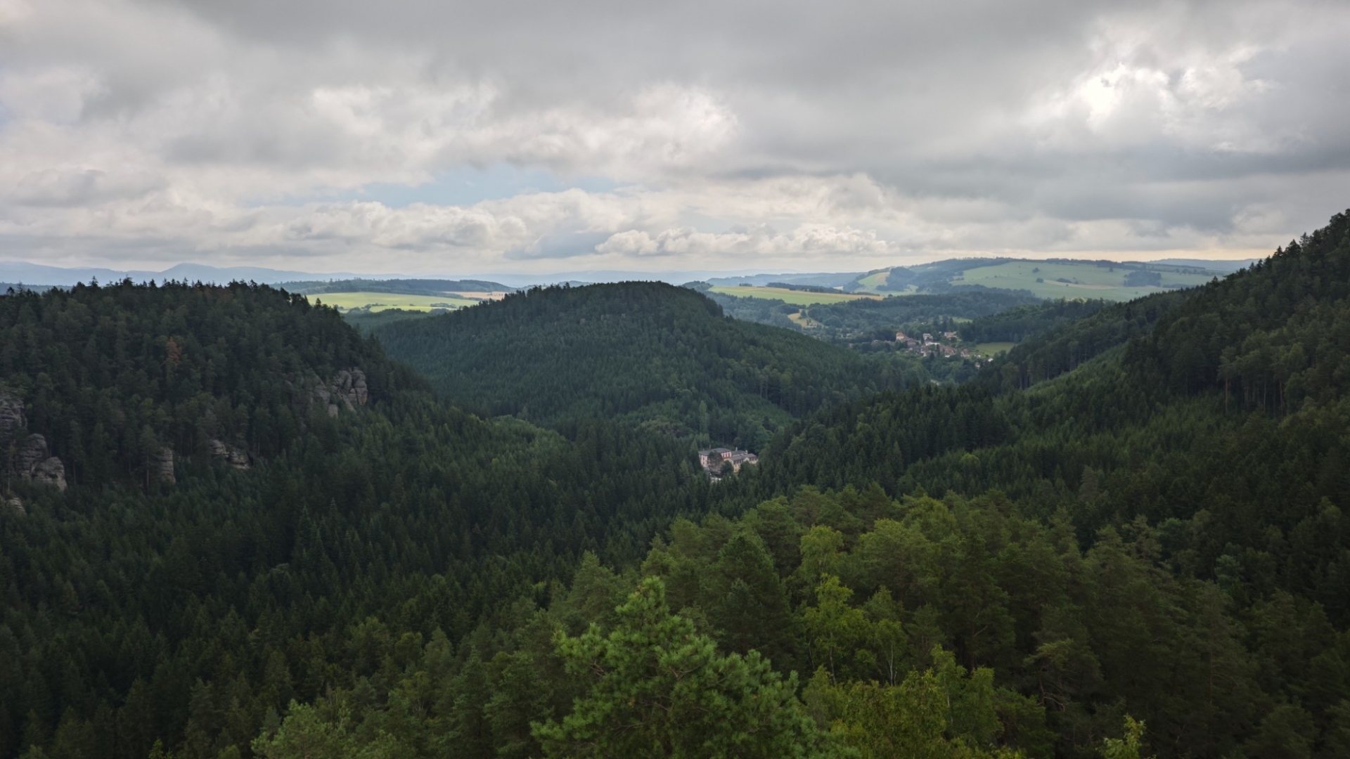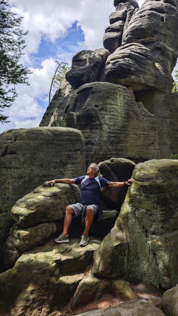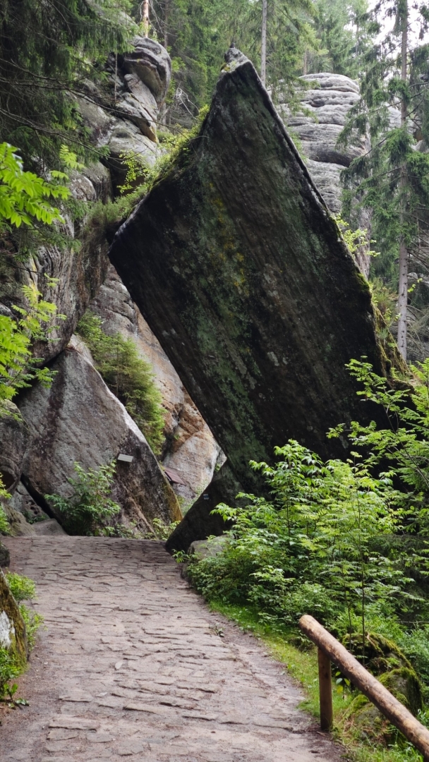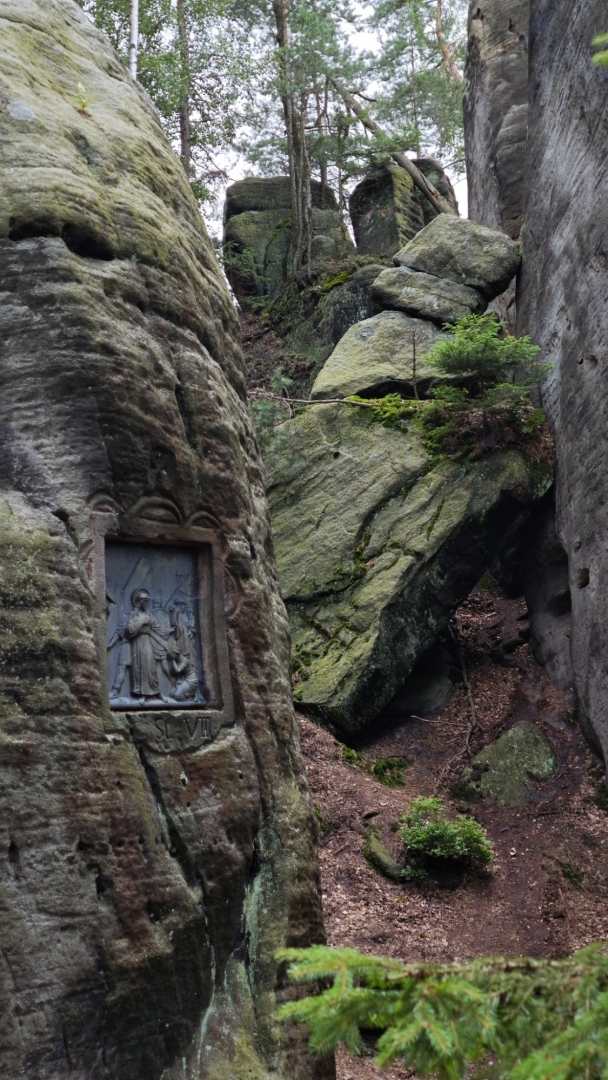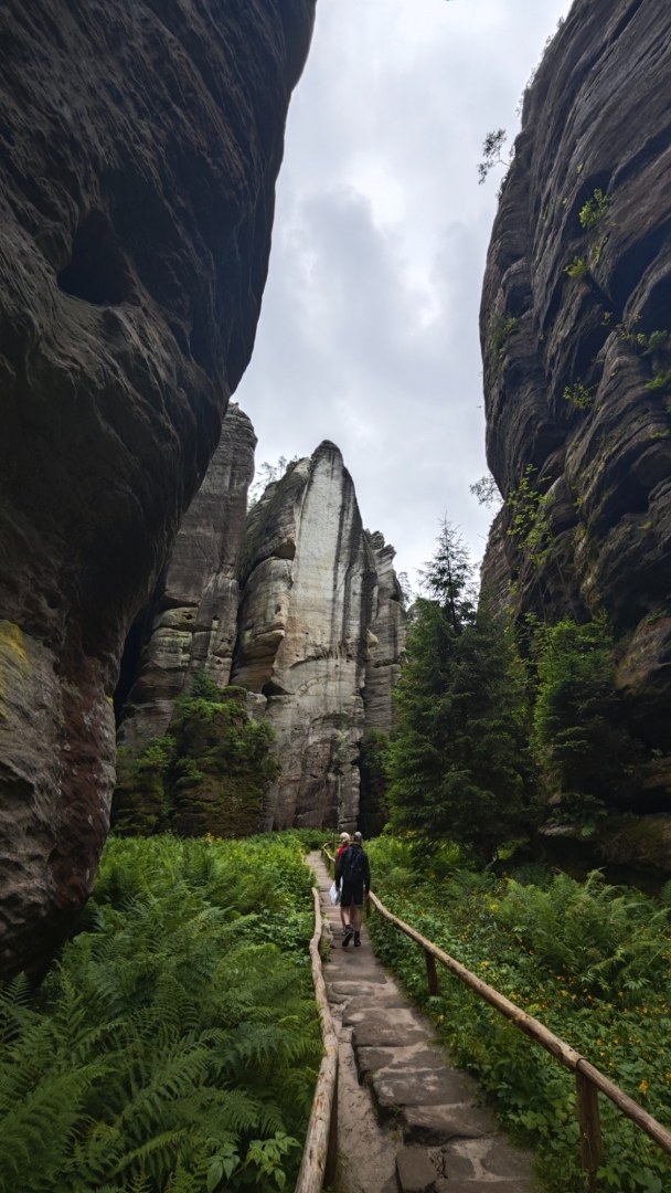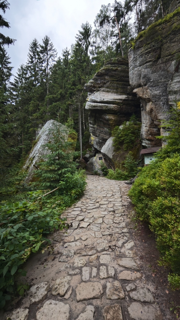 V noci foukal silný vítr, pršelo a já místo spánku poslouchal zvuky z okolí. Zabral jsem až když za otevřeným oknem začaly první ptačí zpěvy. A vzhůru jsem byl za necelé dvě hodiny znovu. Ale jeden den bez spánku se dá vydržet. Po snídani jdeme zjistit, jestli si můžeme rezervovat lístky středeční noční prohlídku Broumovského kláštera. To se daří, takže vyrážíme do Teplických skal. Na rozdíl od celodenně obsazeného parkoviště v Adršpachu, zde snad volno bude, ač mnozí Teplické skály v létě před Adršpašskými upřednostňují. Čekáme, že v nich nebudou davy.