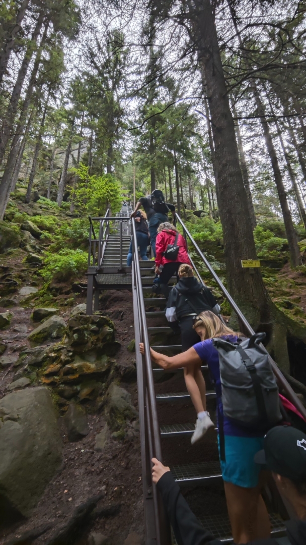 První výraznější fyzickou zatěží je výstup na zříceninu hradu Střmen. Kdysi opevněný strážní hrádek chránil území před Slezany, než Karel IV připojil Slezsko k Českým zemím. Po husitských válkách se poničené strážní Hrady staly útočištěm pro loupeživé bandy a proto byly zbořeny. Střmen byl jedním z nich. Dole železné, nahoře dřevěné schody i samotný průlez skalní průrvou na malou rozhledovou plošinu si pro velký zájem turistů musíme vyčekat. Nevšední zážitek ale za malé nepohodlí stojí.
