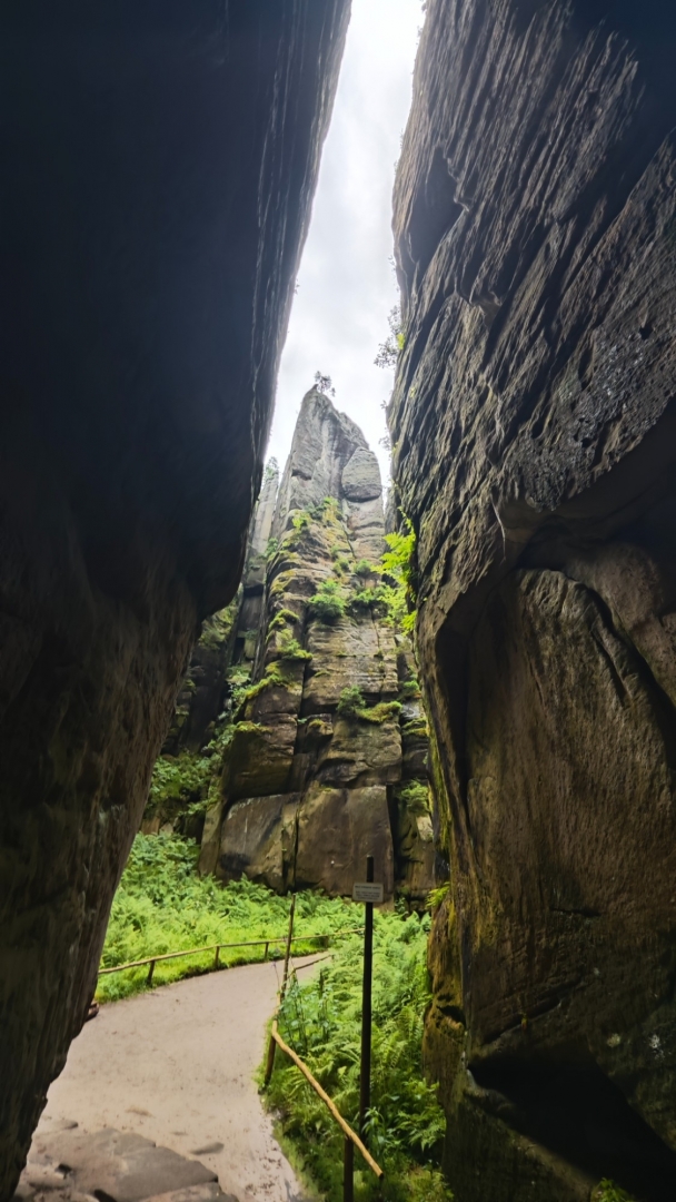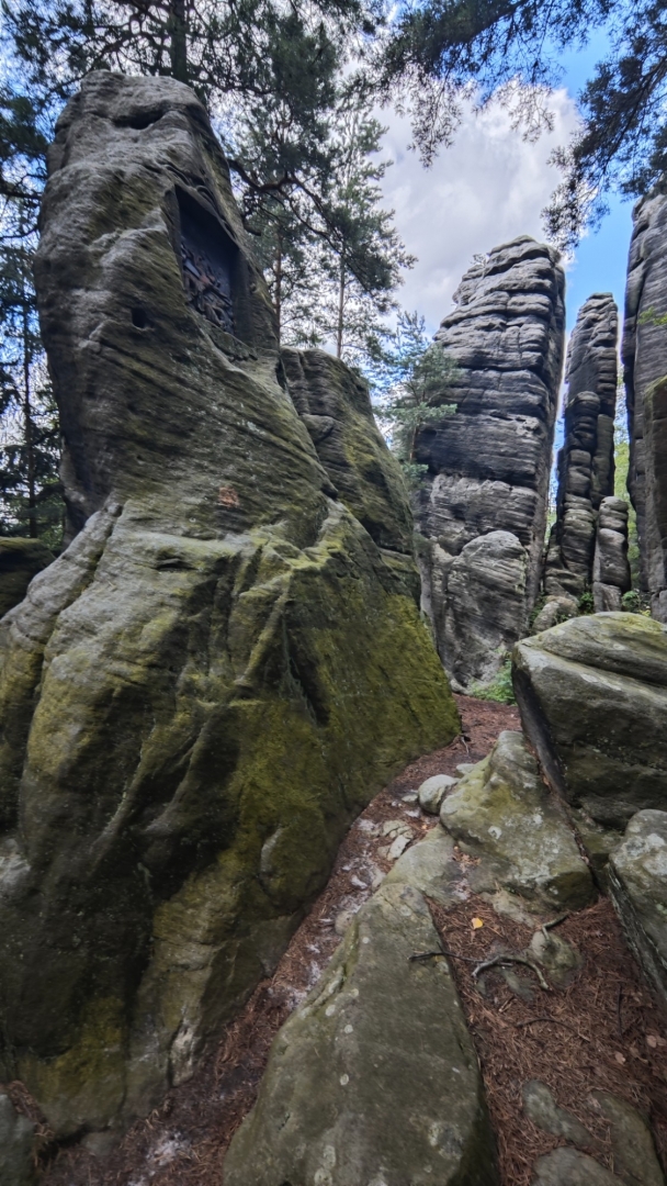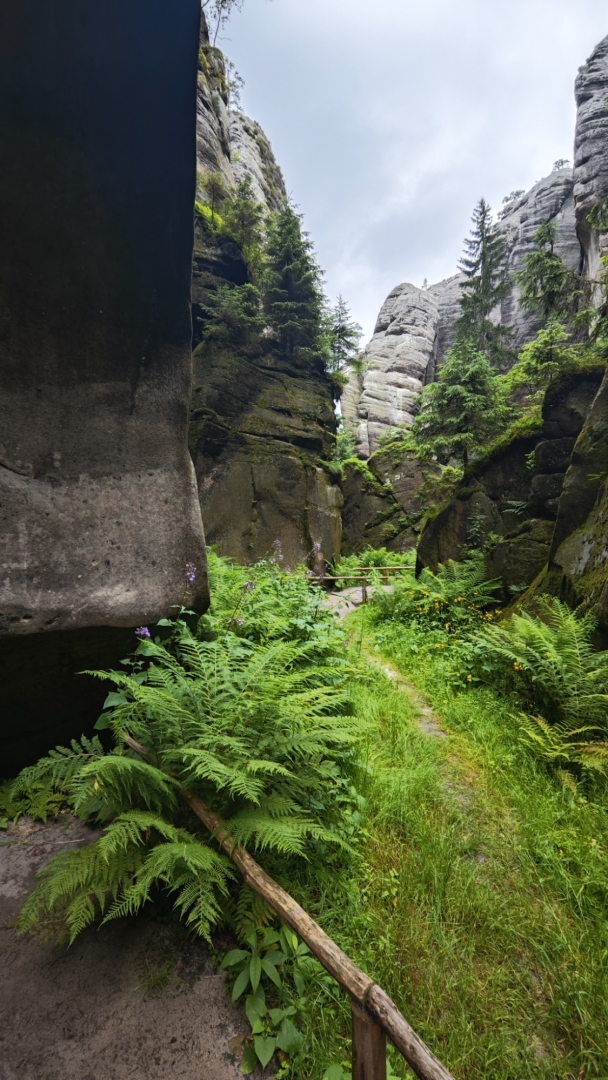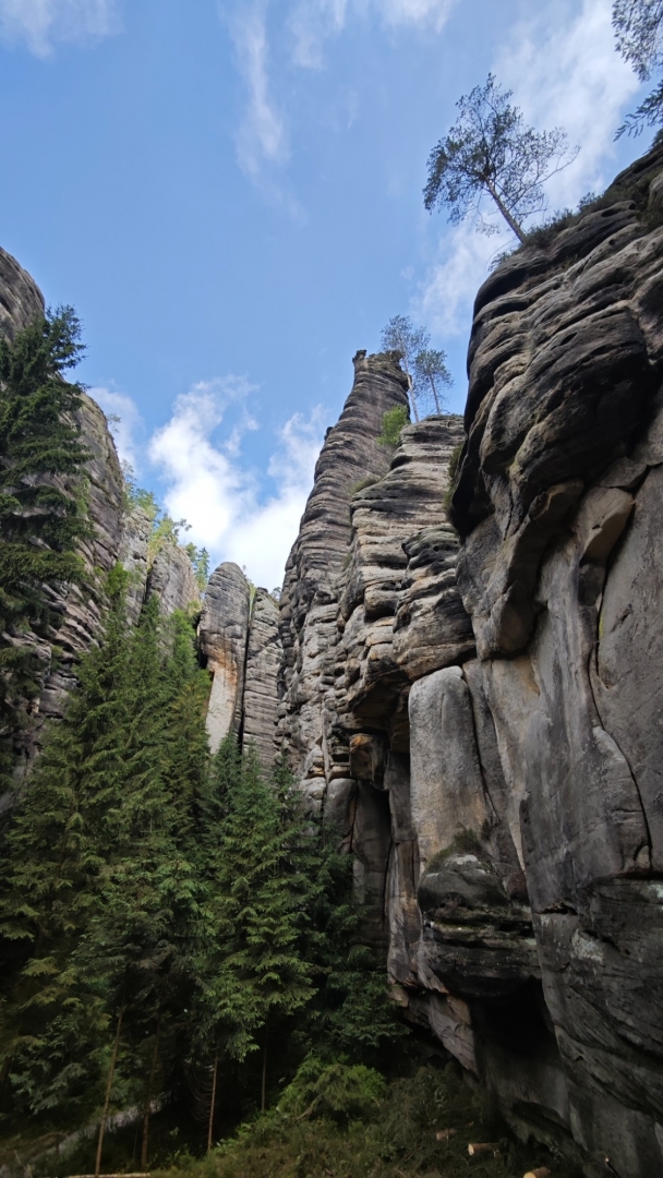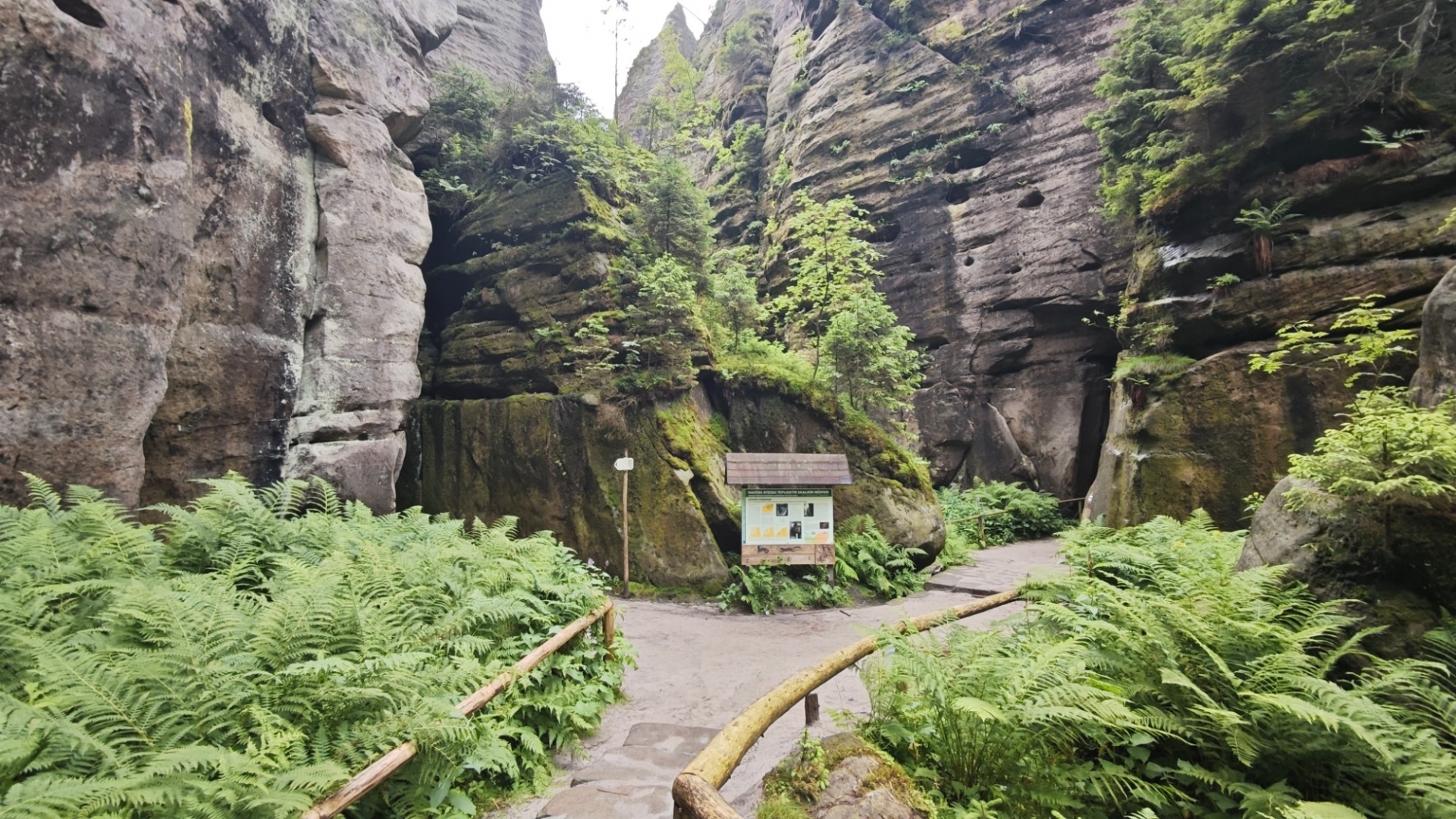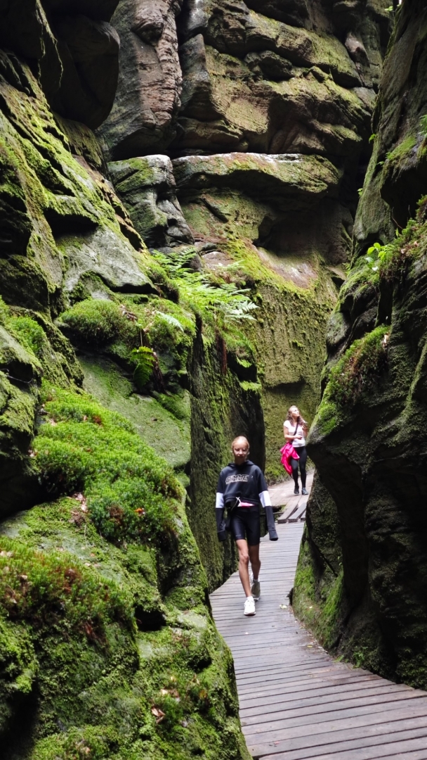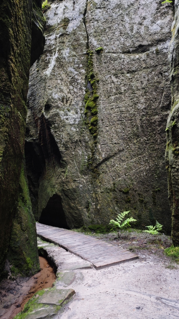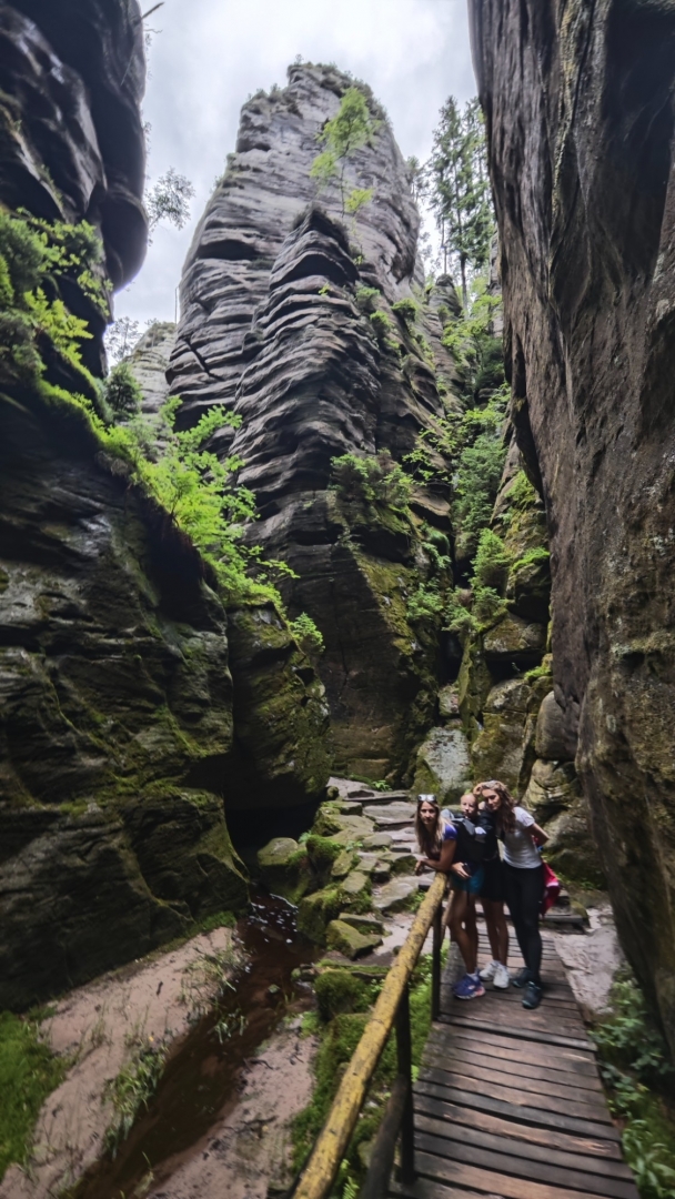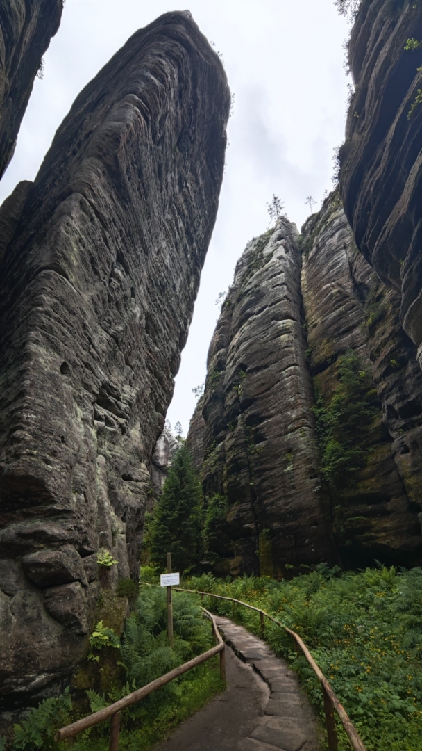 Za Skalní bránou se dostáváme mezi vysoké věže, z nichž většina nese nějaký název. Na vás pak je, abyste ho správně přiřadily. Rozsáhlé skalní město tvoří skalní pískovcové stěny, mezi kterými procházíme úzkými soutěskami. Uvnitř nich je chladno i v nejparnějším létě. Čirá voda potůčku dodává vláhu svěže zeleným mechům a kapradinám. Užíváme si krásný okruh modré značky, jež vede těmi nejhezčími pasážemi skal. Ty tvoří spolu s Adršpašskými skálami jedno z největších ucelených skalních území u nás.