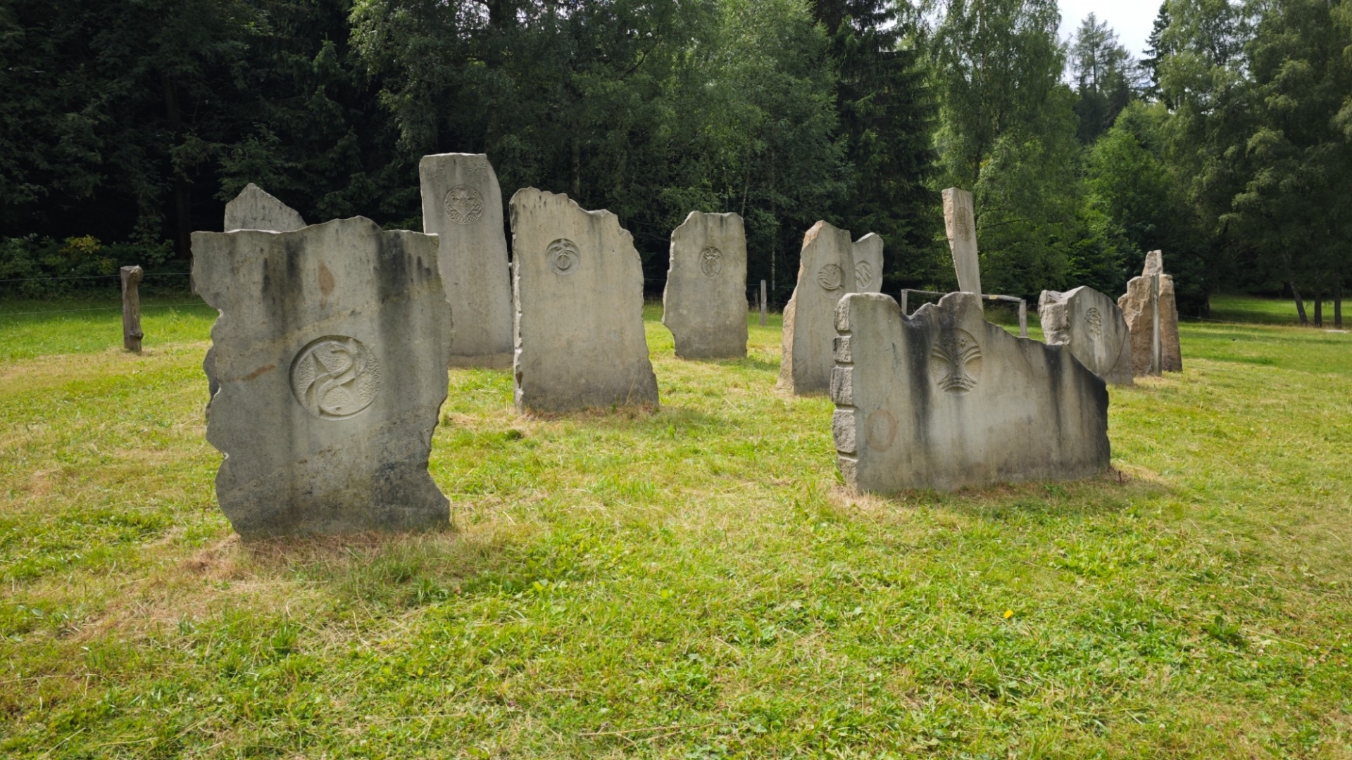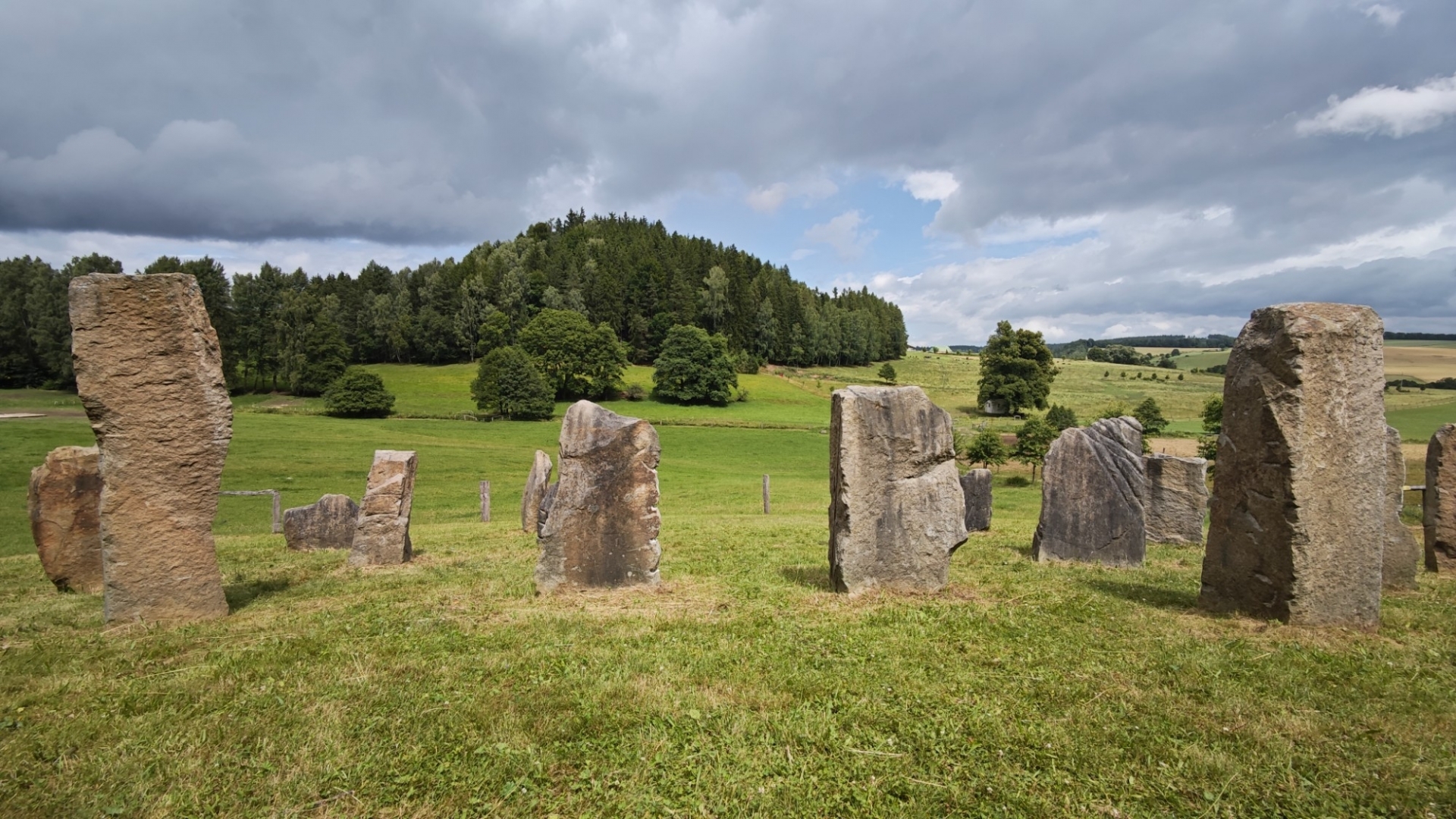 Neustále koketujeme s přechodem do "Ádru" Vlčí roklí, která obě skalní města spojuje. Nakonec však zvítězí alternativa. Přejezd do obce Zdoňov a výstup na Křížový vrch (667 m n. m.). To mne těší, protože jsem na něm nikdy nebyl. Přírodní rezervace zde chrání dvě pásma skal. Jižní věže s Křížovým hřbetem a na severu členité skály Zdoňovského oblouku. Ve skalách můžeme zahlédnout i vzácného sokola stěhovavého. Stoupáme k Zdoňovským menhirům, jednomu z projektů věnovanému poctě říši zvířat. Známe již podobné místo na loučce, které jsme shlédli nedaleko šumavského Vimperku. Pěčnovské kamenné řady jsme mohli loni na podzim obdivovat v tajemné atmosféře mlžného oparu a fotky tak vyšly náramně. Otisk slovinského velvyslance UNESCO Marka Pogačnika je dobře patrný i zde.