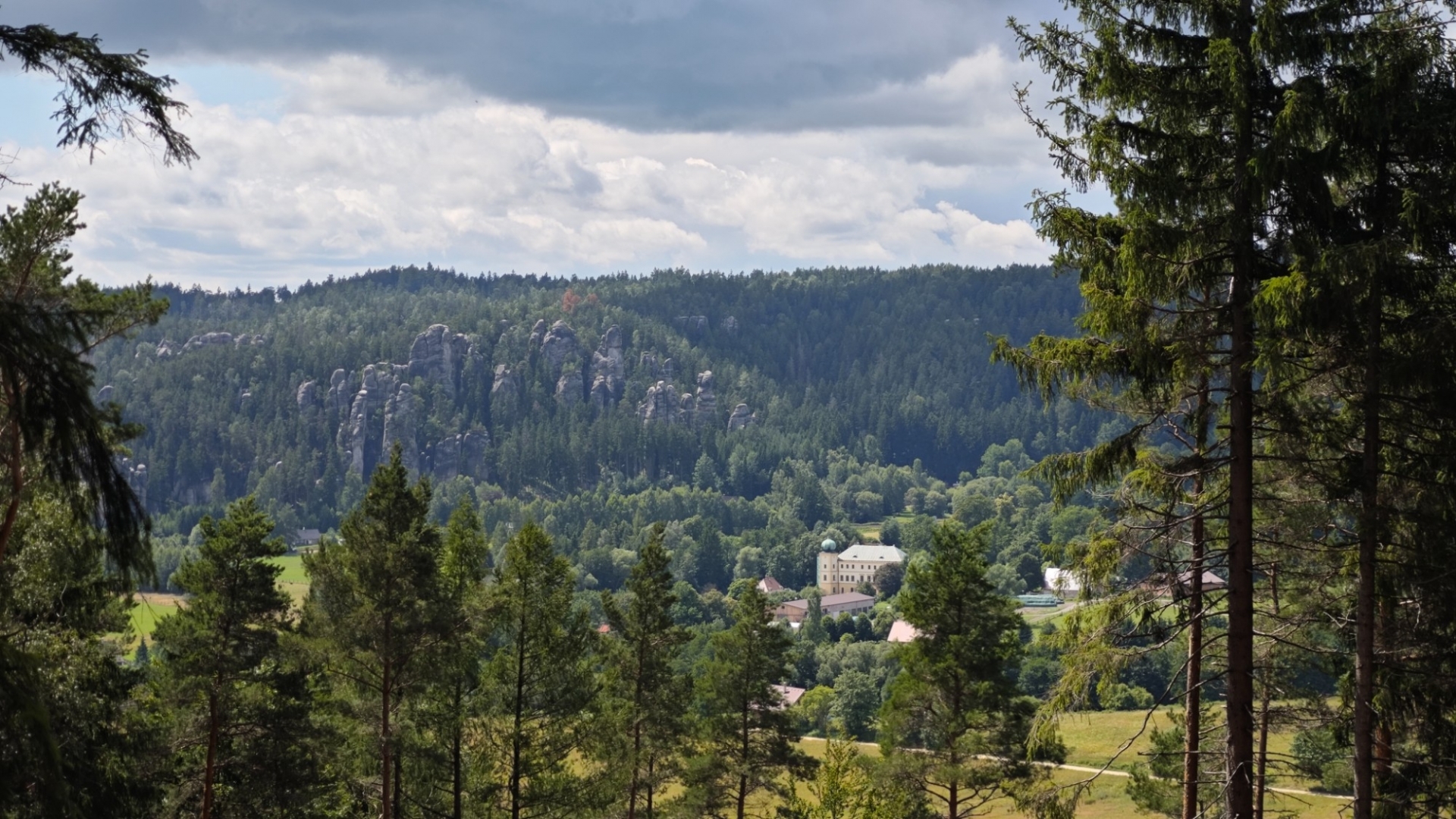 Zámek Adršpach a Ardšpašské skalní město z Křížové hory.