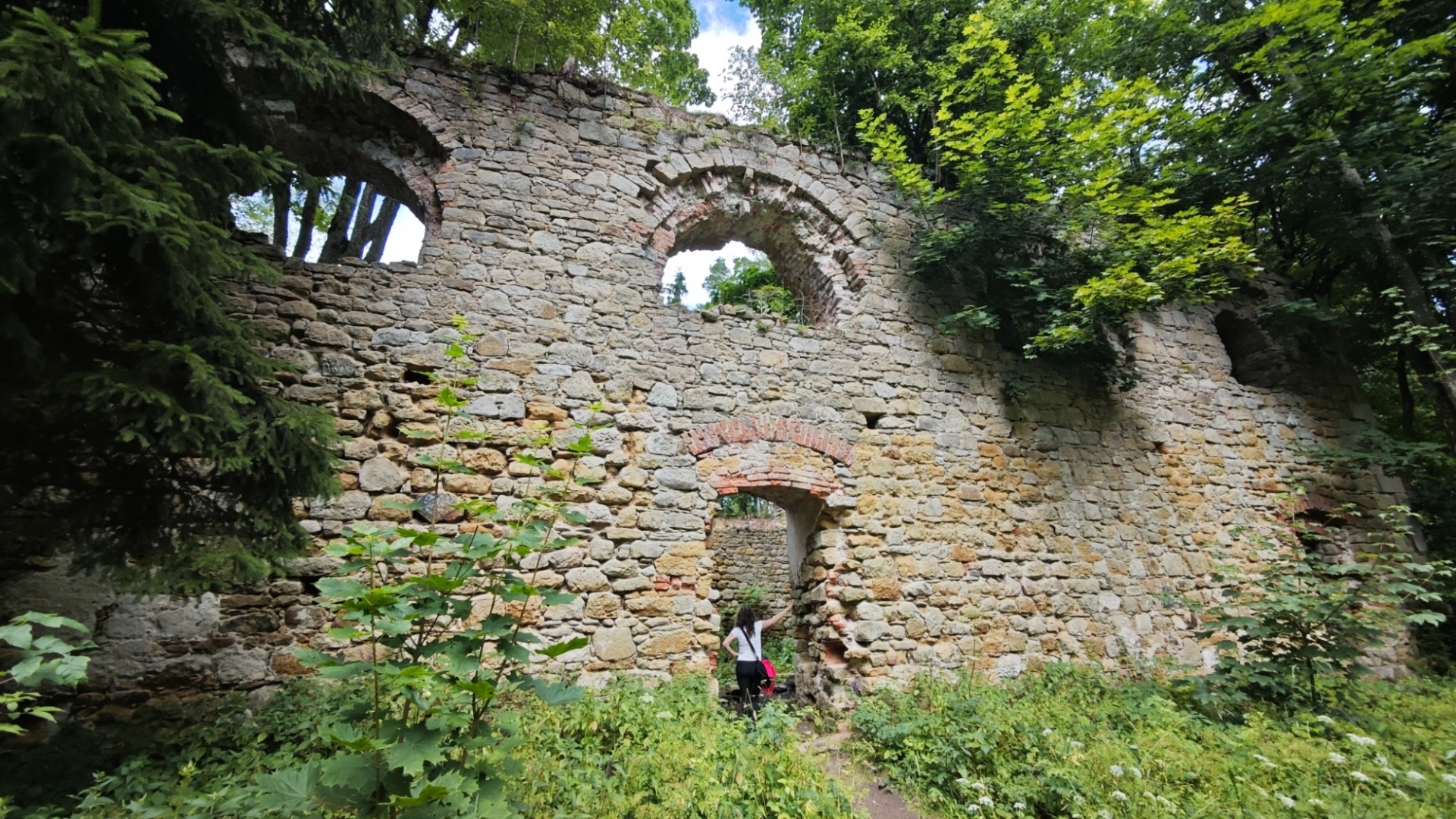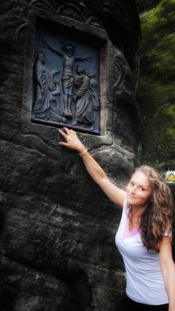 Sousední vrch u toho Křížového právě jednu takovou romantickou zčíceninu nabízí. Vystoupáme k zdem kostela Panny Marie, který nechal zrušit v 18. století Josef ll. Zvláštní symbiózu přírody s pozůstatky stavby využívají holky k ukázkám modelingu. Vyřádíme se dost, než opustíme bývalé kostelní prostory. Síla místa je stále patrná. Já navíc cestou trochu energie odsávám Monice, která se zdá, že jí má stále přebytek.