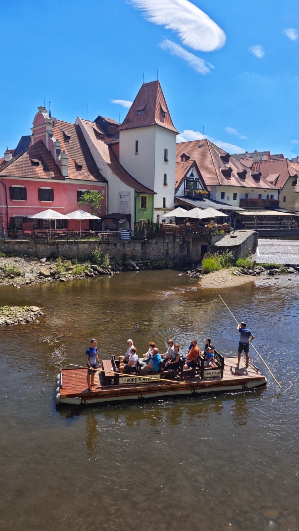 Prohlídka trvá 45 minut a tak jsme brzy zase venku na nádvoří. Jdeme se projít městem, Petra nás zatáhne do Muzea obchodu, pracovníků muzea obchodu, kdy se podařilo přenést čast sbírek z Bratislavy přenést do domu s nejstarší kupeckou historií v Krumlově. V muzeu, kam máme vstup zdarma, najdeme původní kupecký obchůdek a muzejní expozici s historickými pokladnami, zásobníky na kávu, počítacími stroji a spoustou dalších historických věcí. Čteme si staré reklamy a poutače z papíru, kartonu a také řadu smaltovaných a plechových reklamních tabulí. Projdeme na náměstí Svornosti a vracíme se k Vltavě na Jelení lávku. Jezem proplouvají rafty, kanoe a po nich i dřevěný vor. Po vzoru pltí na slovenském Dunajci se můžete svézt za 590 Kč, přičemž v ceně lodního lístku je komentovaná plavba a doprovod z meet pointu na přístaviště Parkán, nápoj na vor a vstup do Muzea voroplavby s vyhlídkou z věže kostela sv. Jošta. Jdeme na oběd do vyzkoušené restaurace V Oblouku a domlouváme se na prohlídce parku u zámku Červený Dvůr.