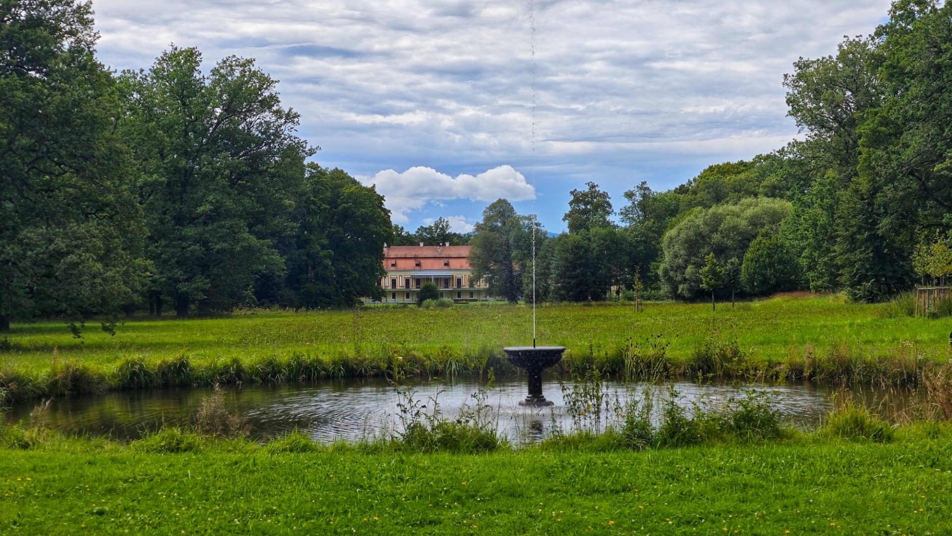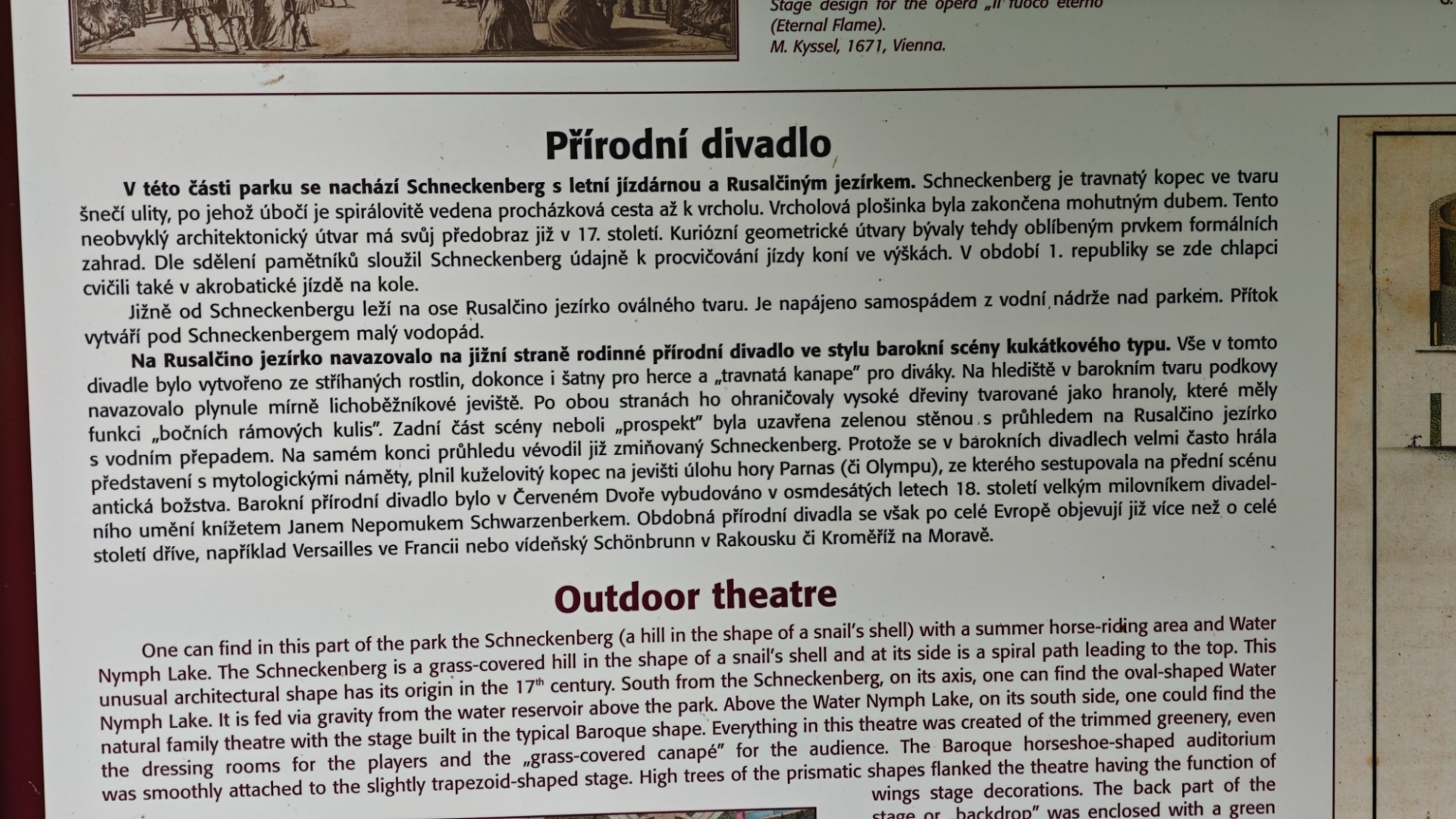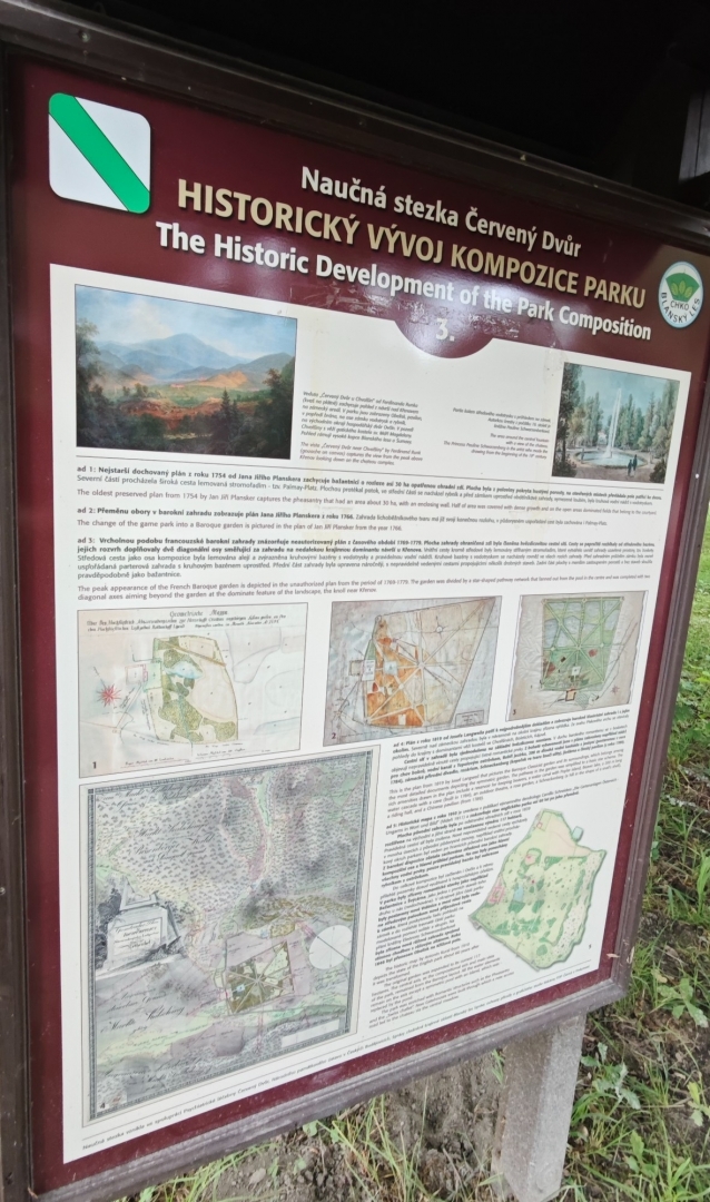 To se nám dnes sice nepovede, ale našim cílem je naučná stezka Zámeckým parkem, kdy si postupně projdeme velkou část parku. Jak ohromný a krásný zámecký park býval, jsme mohli vidět na obrázku v Krumlovském zámku. Nikam nespěcháme, holky si všechny informační cedule poctivě čtou. Míjíme bývalý vstup do parku, kamenný bazén a "Mauritzovnu". Já o kus dál lezu spirálovou stezkou na pahorek u jezírka a pak si všichni dáváme v Café Bažantnice zákusek s dobrou kávou. Přiblížil se večer a také studená fronta od západu. Pár kapek z nebe ale naši náladu z hezky prožitého dne zkazit nemůže.