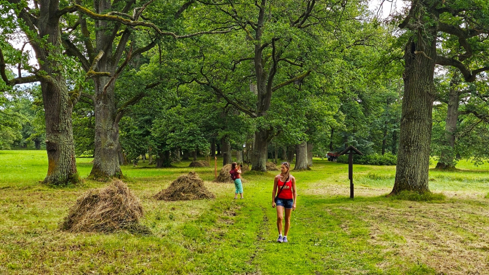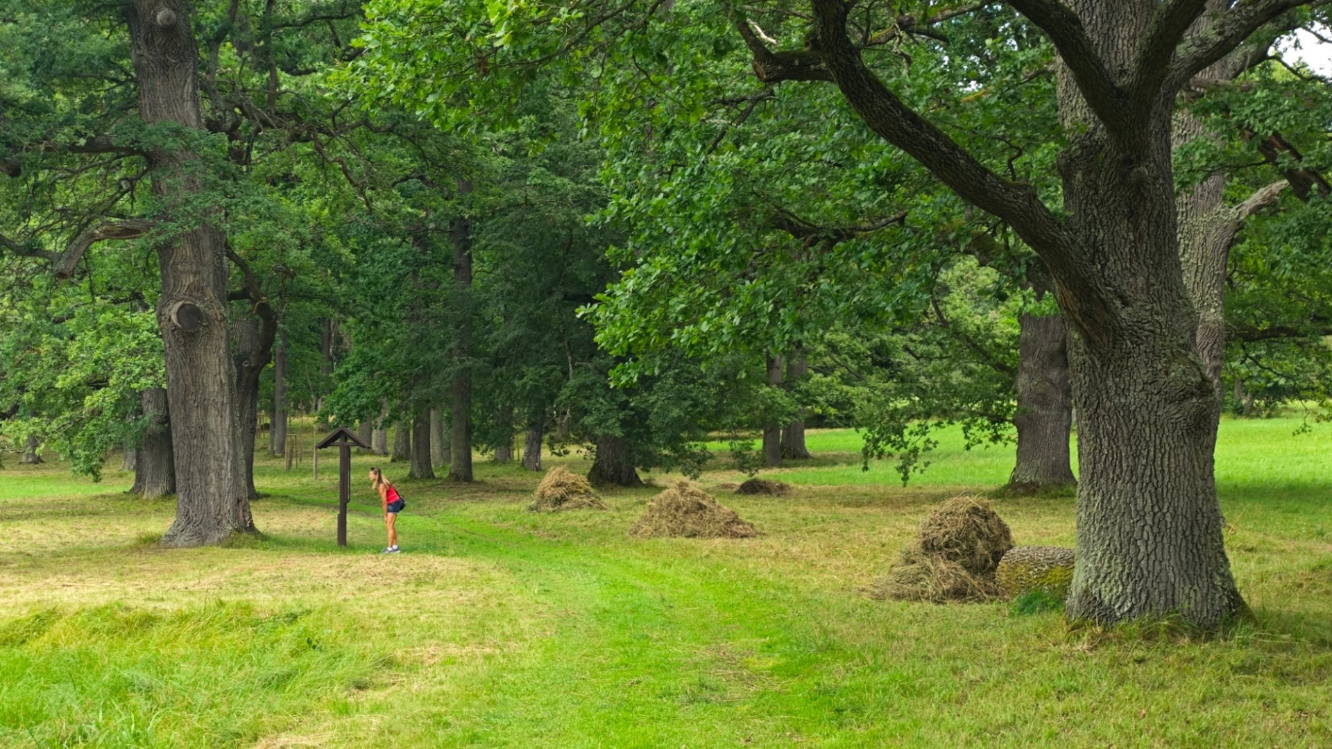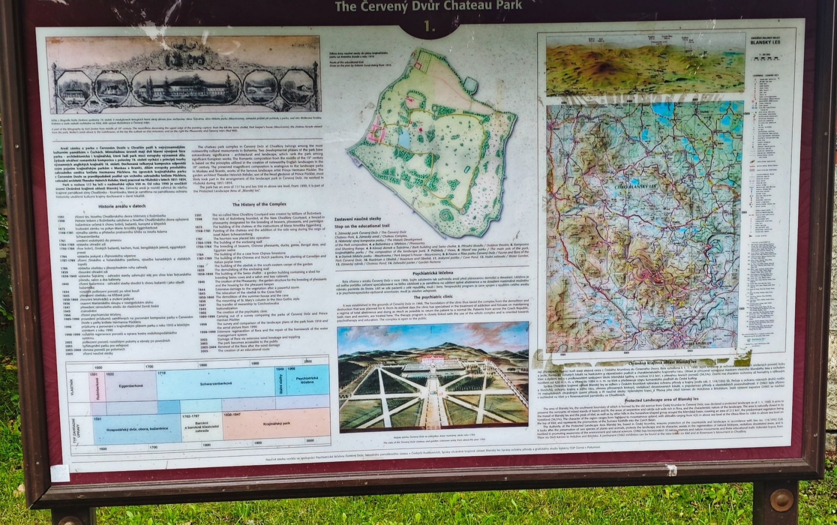 To se nám dnes sice nepovede, ale našim cílem je naučná stezka Zámeckým parkem, kdy si postupně projdeme velkou část parku. Jak ohromný a krásný zámecký park býval, jsme mohli vidět na obrázku v Krumlovském zámku. Nikam nespěcháme, holky si všechny informační cedule poctivě čtou. Míjíme bývalý vstup do parku, kamenný bazén a "Mauritzovnu". Já o kus dál lezu spirálovou stezkou na pahorek u jezírka a pak si všichni dáváme v Café Bažantnice zákusek s dobrou kávou. Přiblížil se večer a také studená fronta od západu. Pár kapek z nebe ale naši náladu z hezky prožitého dne zkazit nemůže.