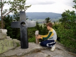 Tady je už převýšení srandovní, protože cesta od Albertova vede těsně pod hřebeny. Nahoře je vícero kamenných "rozhleden", ale i tak vrcholovou tyčku s nápisem BULOVÝ 952,8 M/M v pohodě najdeme.