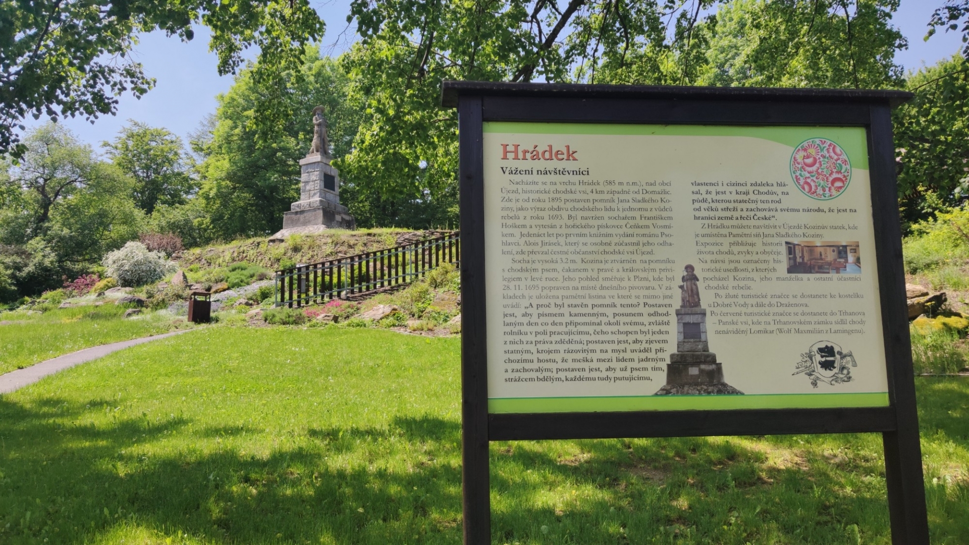 Než definitivně odjedeme domů, musí na pořad přijít trochu kultury. Na poslední vrchol Hrádek (585 m n. m.) nedaleko Újezda ani nemusíme vyjít, protože až na něj vyjedeme autem. Na vrcholu se nalézá socha Jana Sladkého Koziny, jednoho z vůdců chodského povstání proti vrchnosti reprezentované Wolfem Maxmiliánem Lamingenem z Albenreutu (Lomikar) v roce 1693. Jak asi každý ví, povstání bylo tvrdě potlačeno a Kozina byl popraven v Plzni 28.listopadu 1695. Pomník J. S. Koziny byl odhalen v roce 1895, tedy 200 let po popravě.