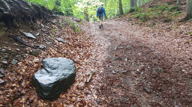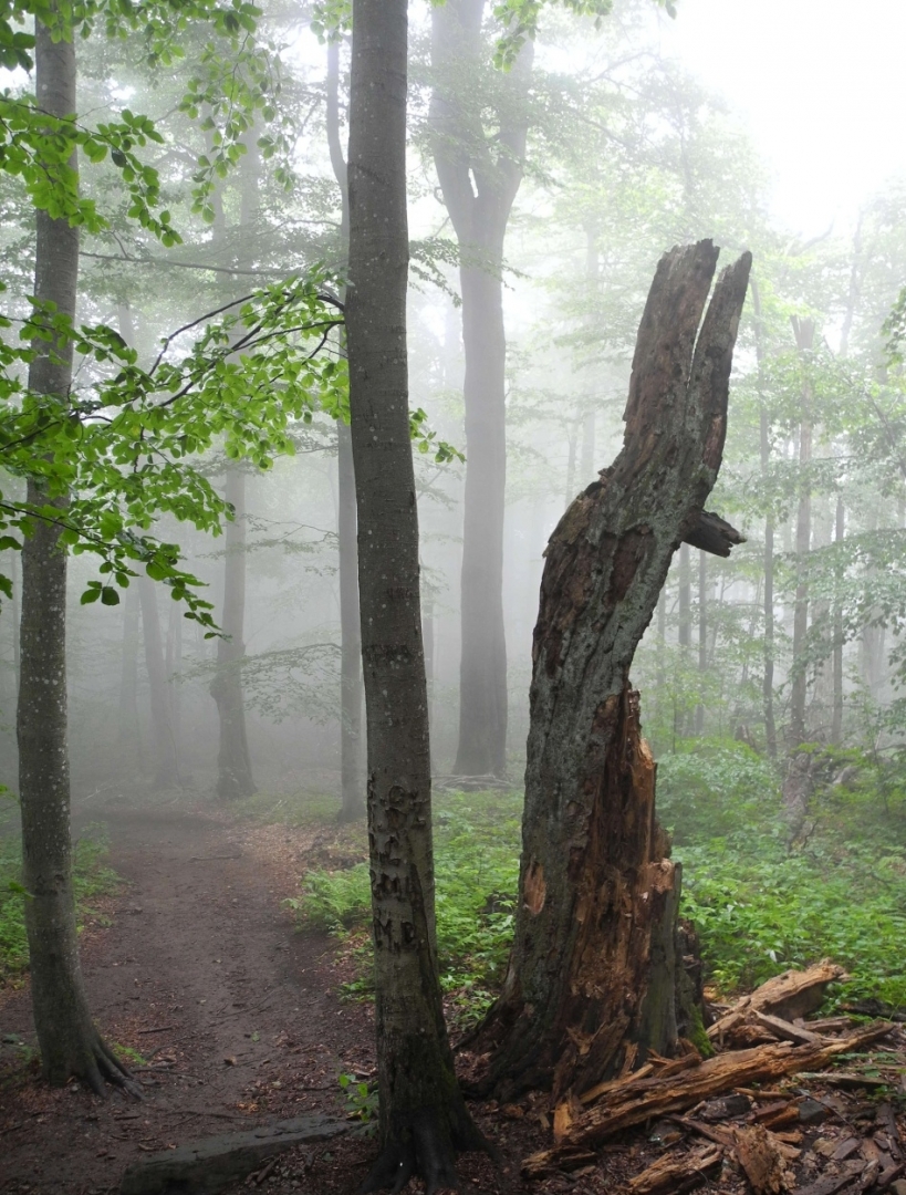 Užíváme si i další cestu po málo vyšlapané stezce. Klikatí se mezi mohutnými buky, jedlemi a kleny. Mladé stromky se často při svém růstu podivně kroutí, jako by neustále tančily. Chci si vybavit nějaké rusínské či východniarské melodie, ale v hlavě mi zní jen "najkrajšie stromy sú na Horehroní..." od krásné Kristíny.