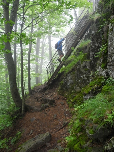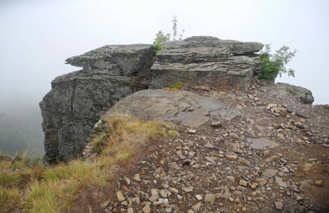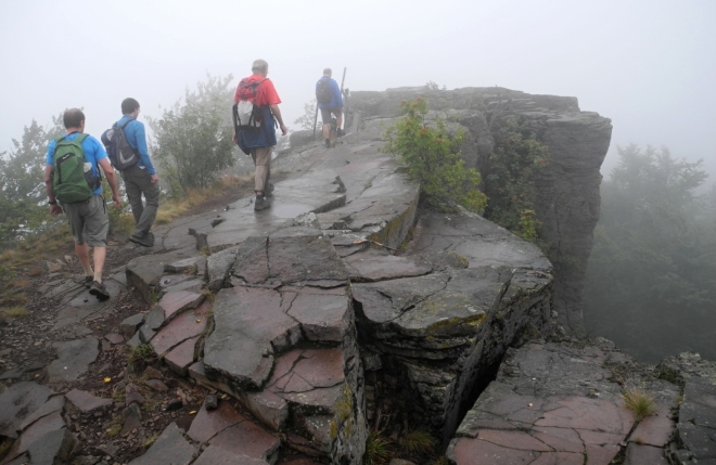 Než promyslím všechny možnosti, stojíme pod vysokou skalní stěnou. Výstupy na obě vrcholové skály Sninského kamene jsou zabezpečeny železnými žebříky. Nahoře překvapí kamenné plošiny, rovné tak, jako by je někdo vydláždil. Panující mlha jen částečně odkrývá výhledy, jenž k místu patří. Mrzí nás, že nevidíme pěticípé Morské oko. Na druhou stranu díky ní právě teď stojíme na plošině stolové hory, venezuelské Roraimy. Není těžké si ji vybavit. A tenhle ztracený svět se nám ani nechce opouštět.