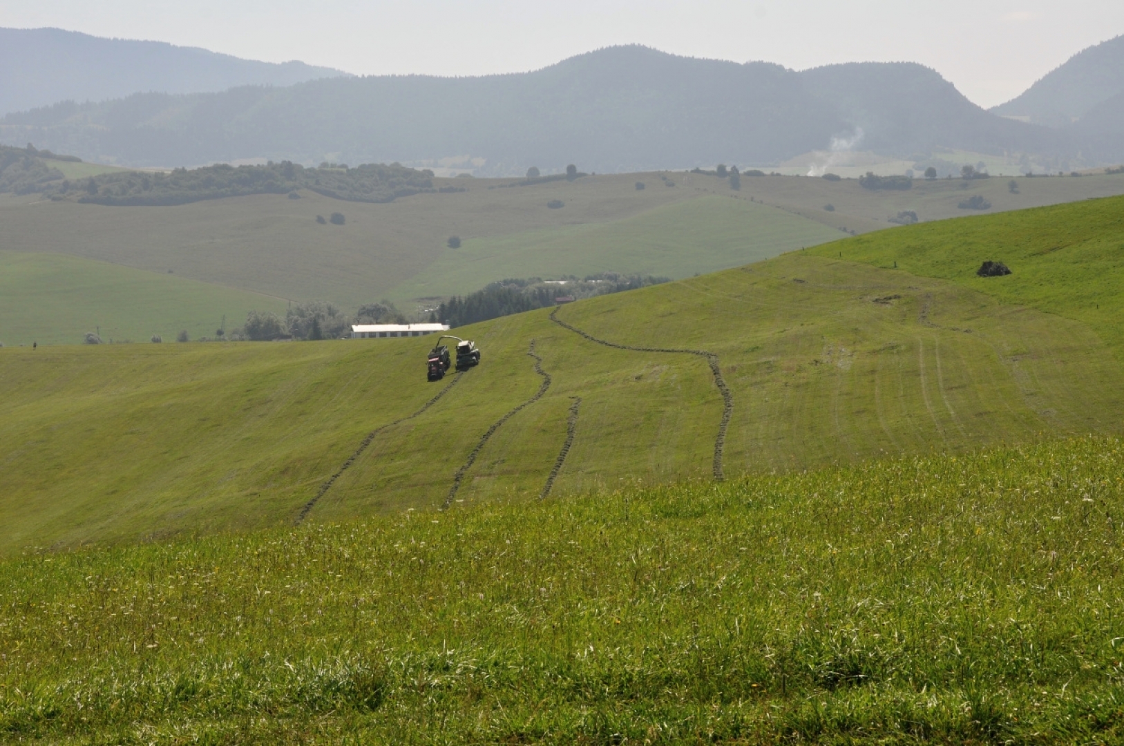 Cesta z obce stoupá vzhůru k Žaškovskému sedlu po lukách a hned testuje fyzičku. Vedro brzy promění naše trička v mokré kusy hadrů a tak na hezké pastvině, kde stojí několik salaší a kolem se pasou se, odpočíváme a sušíme.