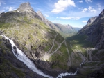 Střihem jsme se přesunuli přímo na Trollstigen, již jsme zahájili výjezd nahoru. První záběr věnujeme vodopádu Stigfossen, vysokému snad 239 metrů. Nepřehlédněte můstek uprostřed fotky.