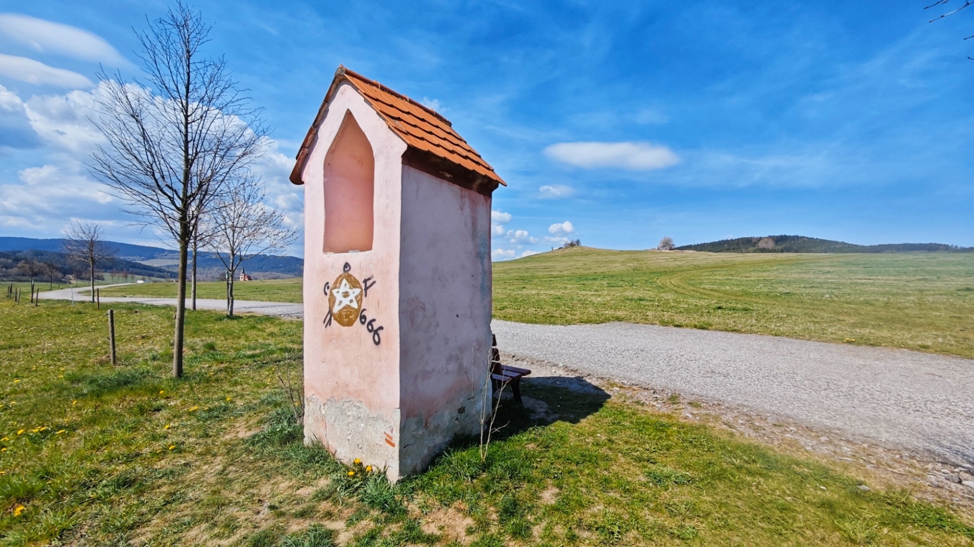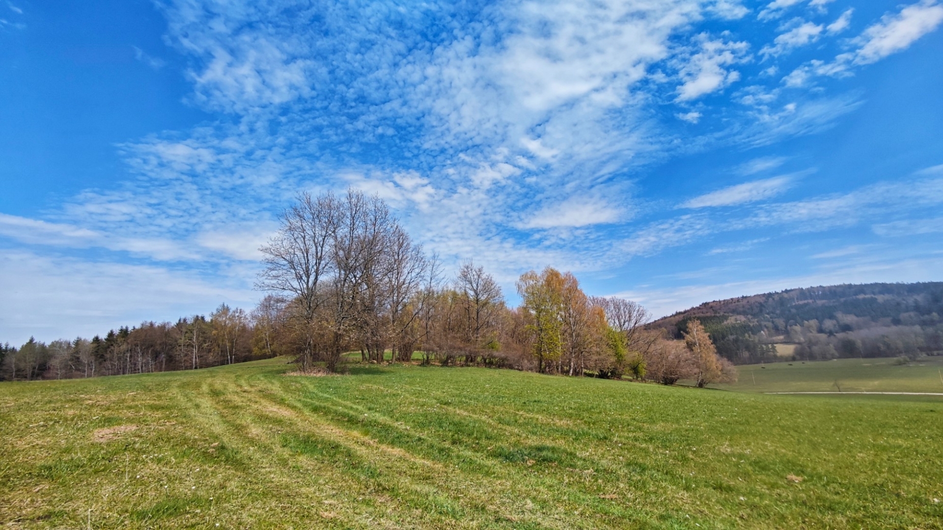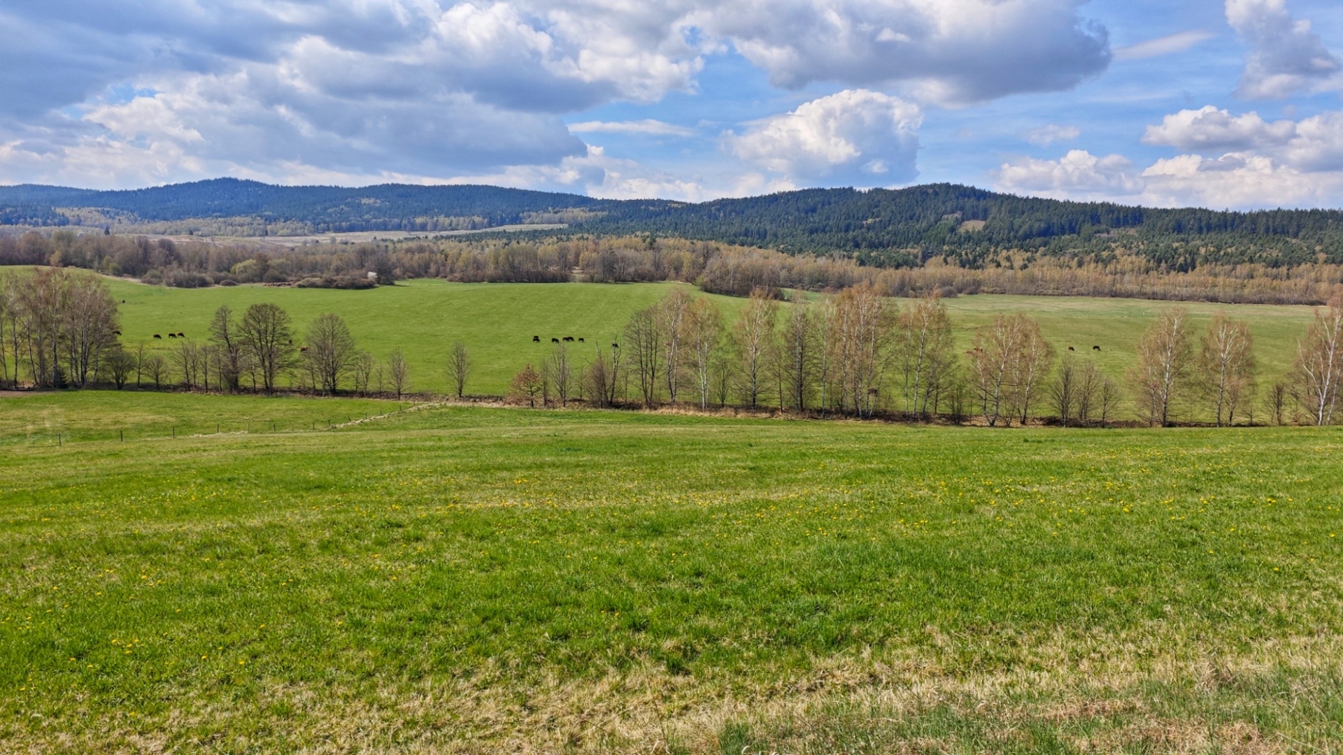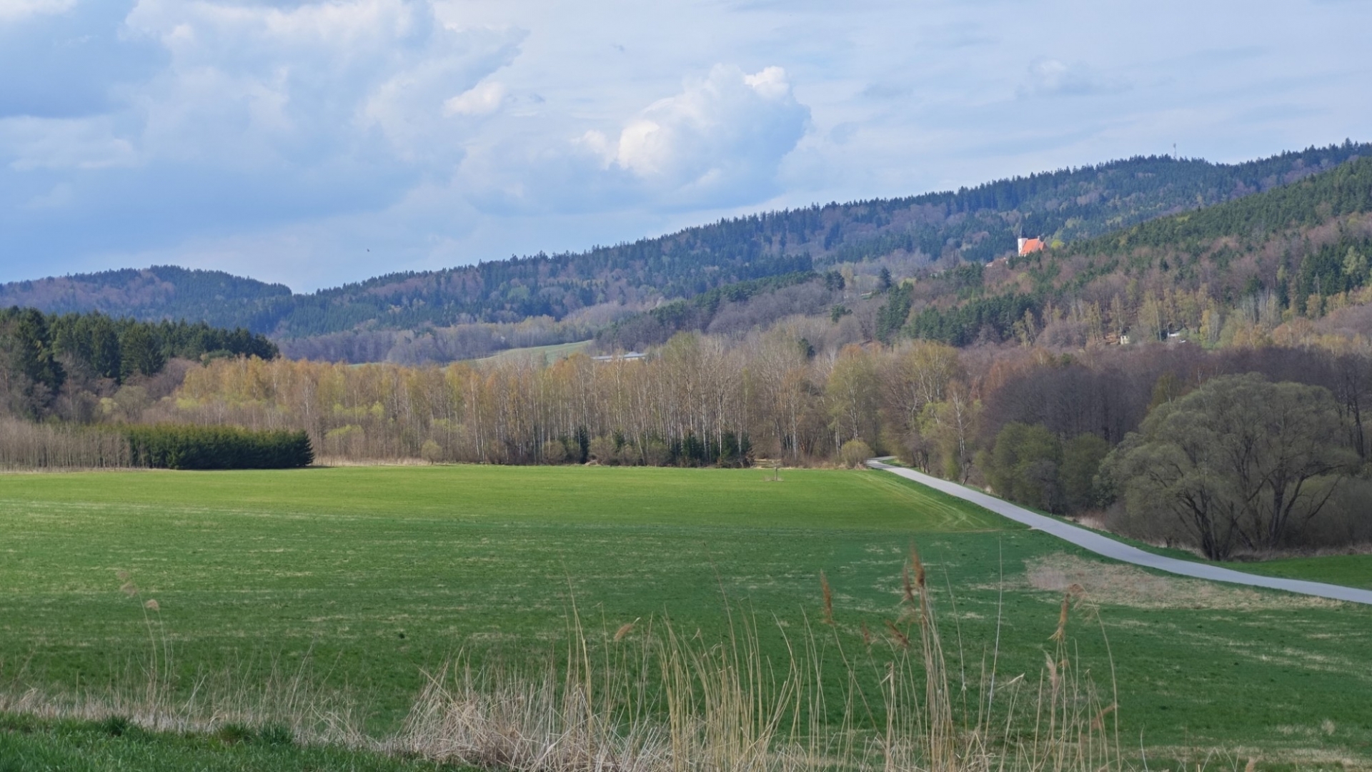 K Tisovce neodbočím, jedu k penzionu Adien a pod ním odbočím k Střemilským rybníkům. Pěkné místo s šesticí rybníků leží mimo VVP. Rád tudy jezdím, louky nad potokem v létě hrají všemi barvami. Luční kvítí vás svojí pestrostí uchvátí, ale musíte přijet ve správný čas. Druhá polovina dubna ještě nic takového nenabídne. Některé listnaté stromy se již začínají zelenat, ale pohled na kopce Želnavské vrchoviny i Blanského lesa, kterým budu projíždět, svěží zeleň neukazuje. Přijíždím k Chvalšinám a za náměstím odbočím k Červenému Dvoru.