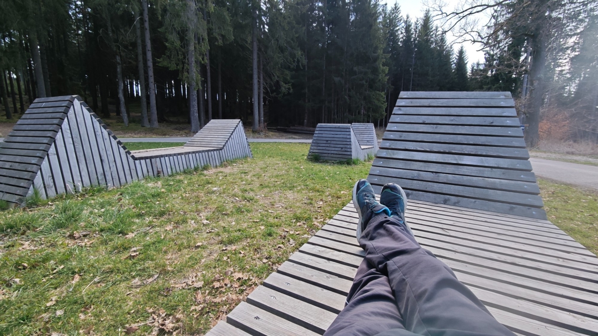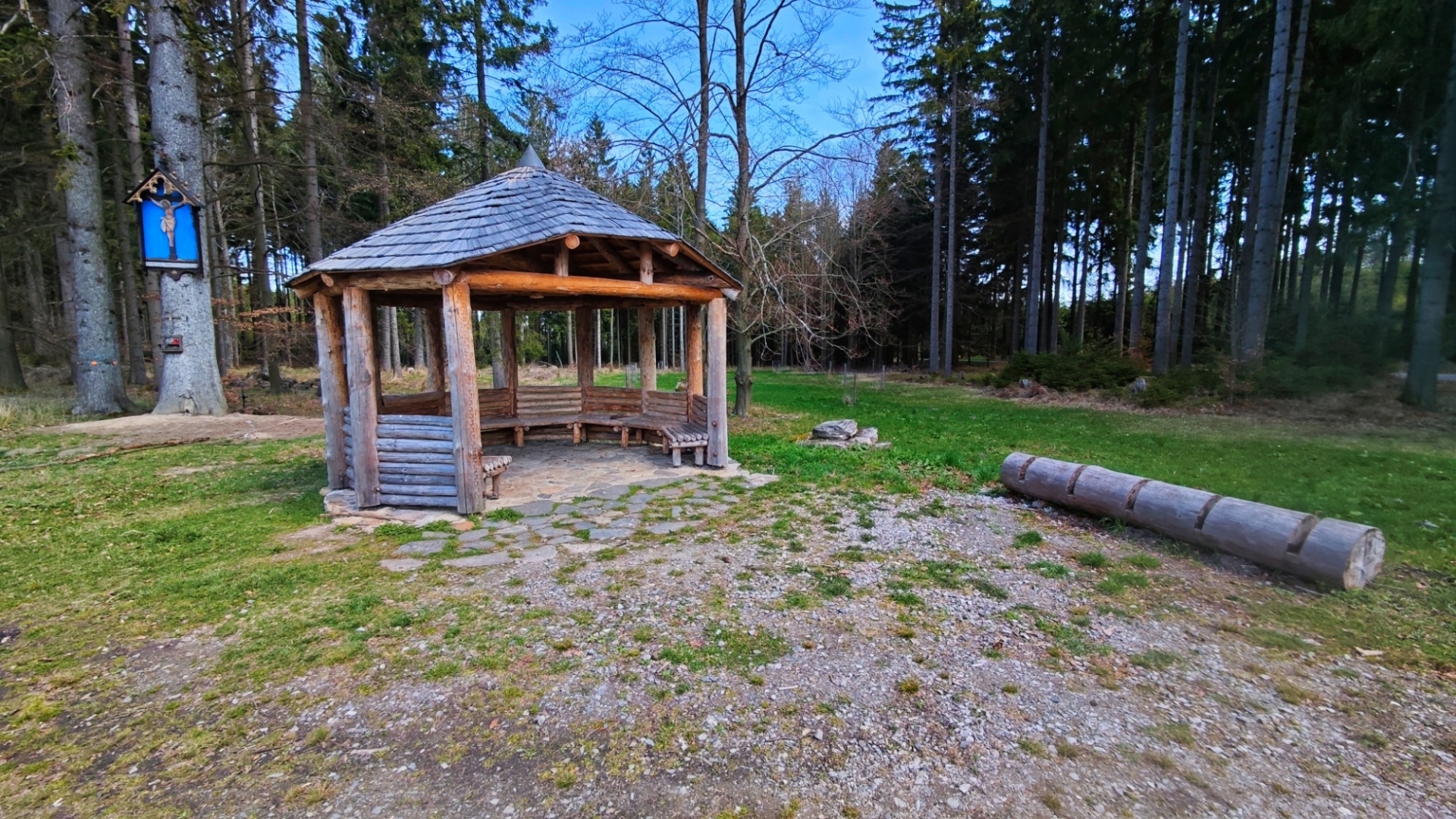 Rozcestí ukazuje 3 km dlouhou cestu vzhůru na Kleť, já jedu nad Krumlov k Modrému obrázku. Sjíždím na křižovatku lesních cest, kde jsou nová odpočívadla. Vyvalím se na slunce a na pár minut ulehnu do jedné z velkých dřevěných lavic, k tomu určených. Prohlížím si fotku Modrého obrázku s několika letopočty renovace obrazu, připomínajícího smrt knížecího hajného, kterého pytláci v roce 1787 pověsili hlavou do mraveniště a ten pak zemřel. Modrý obraz se poté stal orientačním bodem i turistickým cílem.