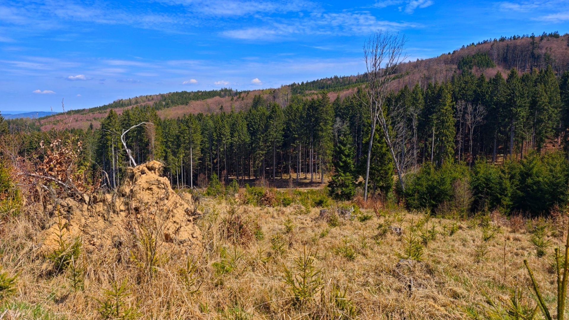 Jedu dál pod hřeben Albertova a Bulového (953 m n. m.). Opět pro bikery hodnotný traverz bučinami vede do údolí Křemžského potoka, já odbočím Dobročkovskou cestou a přes hřeben se překulím zpět k Březovíku, odkud dokončím pěknou 45 km dlouhou trasu s převýšením kolem 700 m.