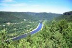 Za Ludvíkovicemi podle stejnojmenného vyschlého potůčku, stoupáme ke kapličce a přilehlému hřbitovu. Jen ho obcházíme a stoupáme na Spálenisko s dalším výhledem. Nad námi je Růžový hřeben s Růžovou vyhlídkou. Zde jsme již vysoko (433 m) a pohled dolů to dokazuje. Ze skalek vidíme, jak po Labi pluje několik raftů, kanoí a pár malých lodí. Před několika desetiletími jsem odsud fotil velké dopravní lodě, dnes břehy kaňonu lemují hromady oblázků a sucho posledních měsíců a nedostatek vody jejich plavbu neumožňuje.