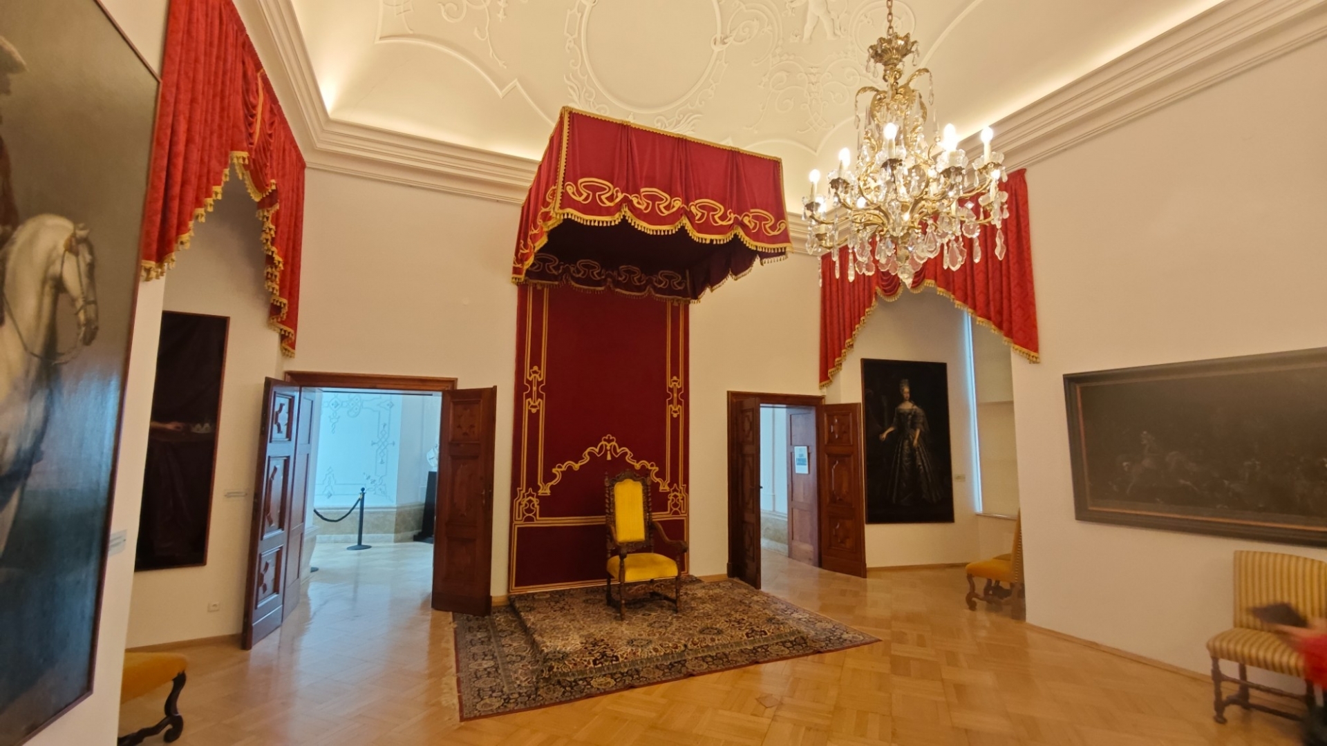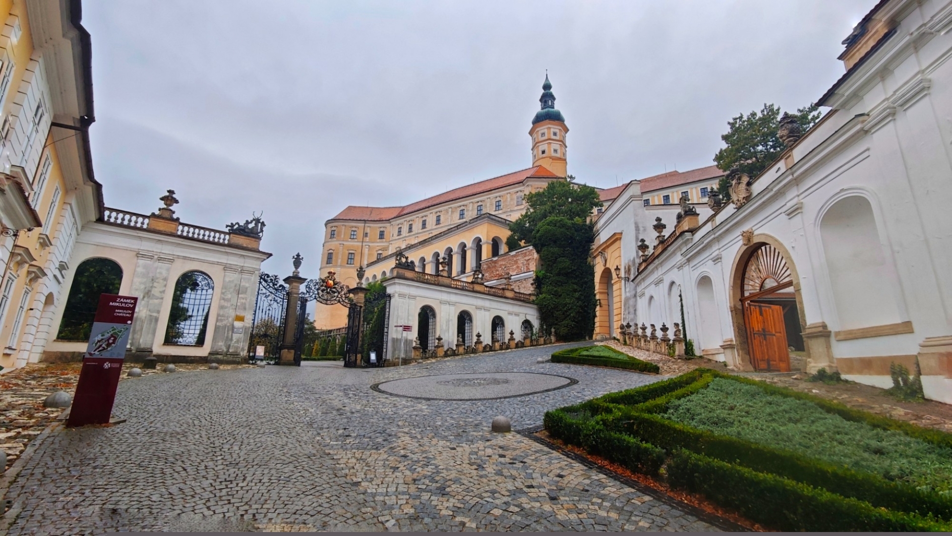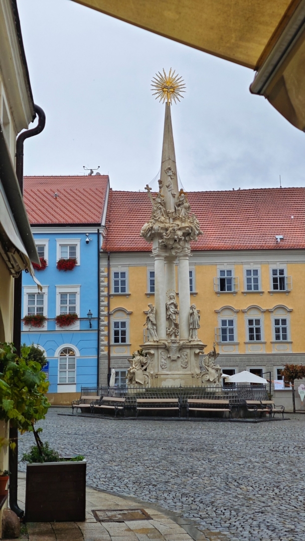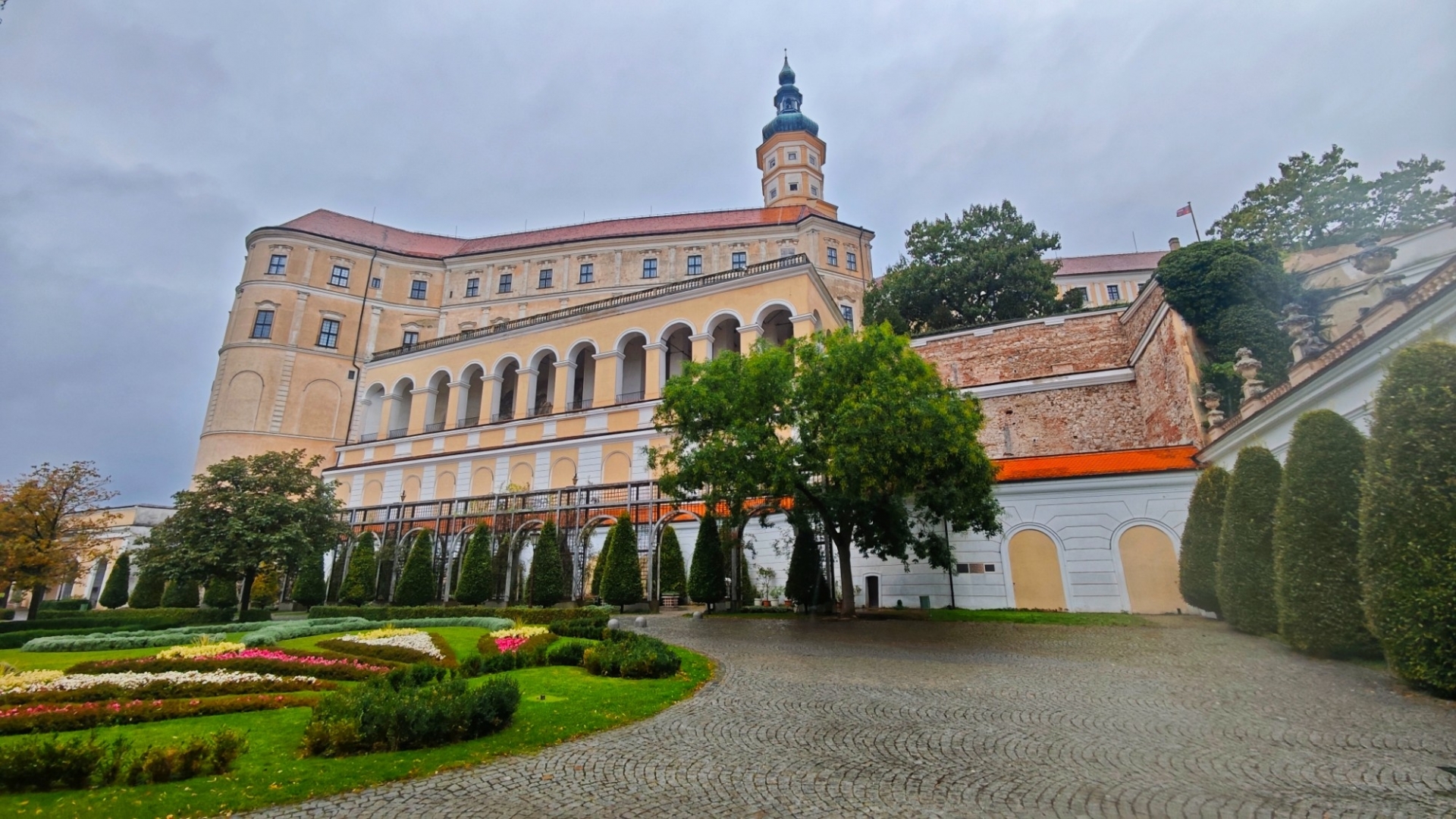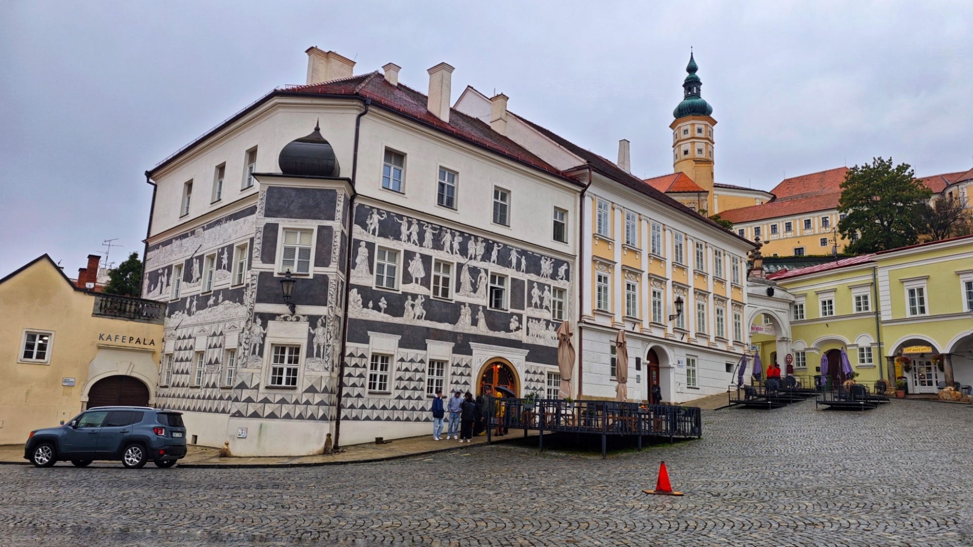 Kolem desáté parkujeme pod zámkem, kam míří naše první kroky. Kupuji si nový deštník, protože starý mám kdesi zahrabaný v kufru. Společně jdeme přes náměstí a já si všimnu, že tudy vede i dálková turistická trasa Via Czechia jižní. Centrum města bylo vyhlášeno památkovou rezervací. Naleznete zde množství patrových měšťanských domů se zdobnými fasádami, několik budov židovské čtvrti, včetně synagogy, areál bývalého piaristického kláštera a také dochovalé části městského opevnění s baštami. Horní straně náměstí fominuje kostel sv. Anny. Ten původní z roku 1623 ve svých zdech skrýval Svatou chýši, vzor pražské Lorety. Požár však kostel v roce 1784 zničil, ušetřena zůstala pouze jeho monumentální fasáda od slavného architekta Johana Bernarda Fischera z Erlachu, autora schönbrunnského paláce ve Vídni. V 19. st. byla ruina kostela přestavěna na rodinnou hrobku Dietrichsteinů. Vstup do ní dnes není možný a proto jdeme rovnou do Mikulovského zámku.