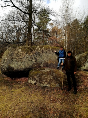 Nezdá se, že by u balvanu nějakou negativní energii pochytili. Courají se po lese tak dlouho, že jim musím jet po loučce naproti. A jak se mi to jeví, naopak mezi balvany našli nějaký zbytek energie pozitivní. Tak to na výpravách s Jíťou ale obvykle bývá.
