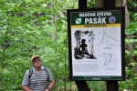 Dobře naladěni, byť Lukáš opět bez snídaně, na kterou vůbec nechodí, se proplétáme Brannou po naučné stezce Pasák. Sestupujeme k potoku Branná a za nádražím začínáme zvolna stoupat k přírodní památce Pasák. Tu nedoporučuji vynechat, neboť jde o zvlášť povedenou hříčku přírody. Ochraňuje skalní útvary patřící k nejzajímavějším místům v západní části CHKO Jeseníky. Ty vystupují při hraně pravého svahu potoka Hučavy a tvoří místy až 30 m vysokou skalní stěnu. Skalnaté okraje údolní hrany vznikly postupným zvětráváním horniny zvané paraamfibolit, která obsahuje proměnlivé množství uhličitanu vápenatého. Nám silně připomínají břidlici, podobné je i pravidelné "odlupování" plátů horniny. Podél puklin vzniklo několik nápadných útvarů jako skalní hřib zvaný Kovadlina nebo štíhlá věž - Pasák (18 m vysoká) členěná římsami, výčnělky a převisy, připomínající lidskou postavu. K té se váže pověst o zkamenělém pasákovi.