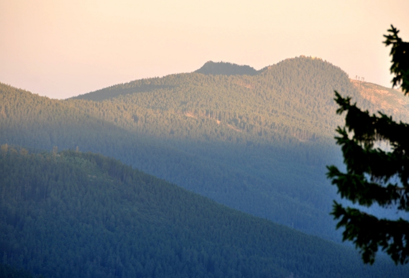 Západ slunce vychází neskutečně skvěle. Konečně se zlepšuje viditelnost a tak ve stále více krvácejícím obzoru směřuji Nikon na Javor, Falkenštejn a nakonec i oba vrcholy Ostrého, který vystrkujíc své bradavky rudnoucímu nebi skutečně připomíná prsa ležící ženy. Je to ona pověstná Matka Boží, které právě teď žhavá rudá koule pomalu mizí v hlubokém zalesněném klíně.