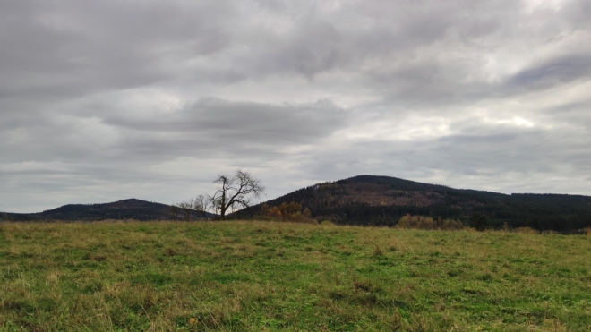 Podzim nabízí spousty barev, ale proč nenabídnout také něco jiného? Strom bez listí, zamračené nebe, horizont, jenž narušují kopce v pozadí. Stačilo popojít několik kroků po louce, aby kompozice vytvořila cosi zajímavého.