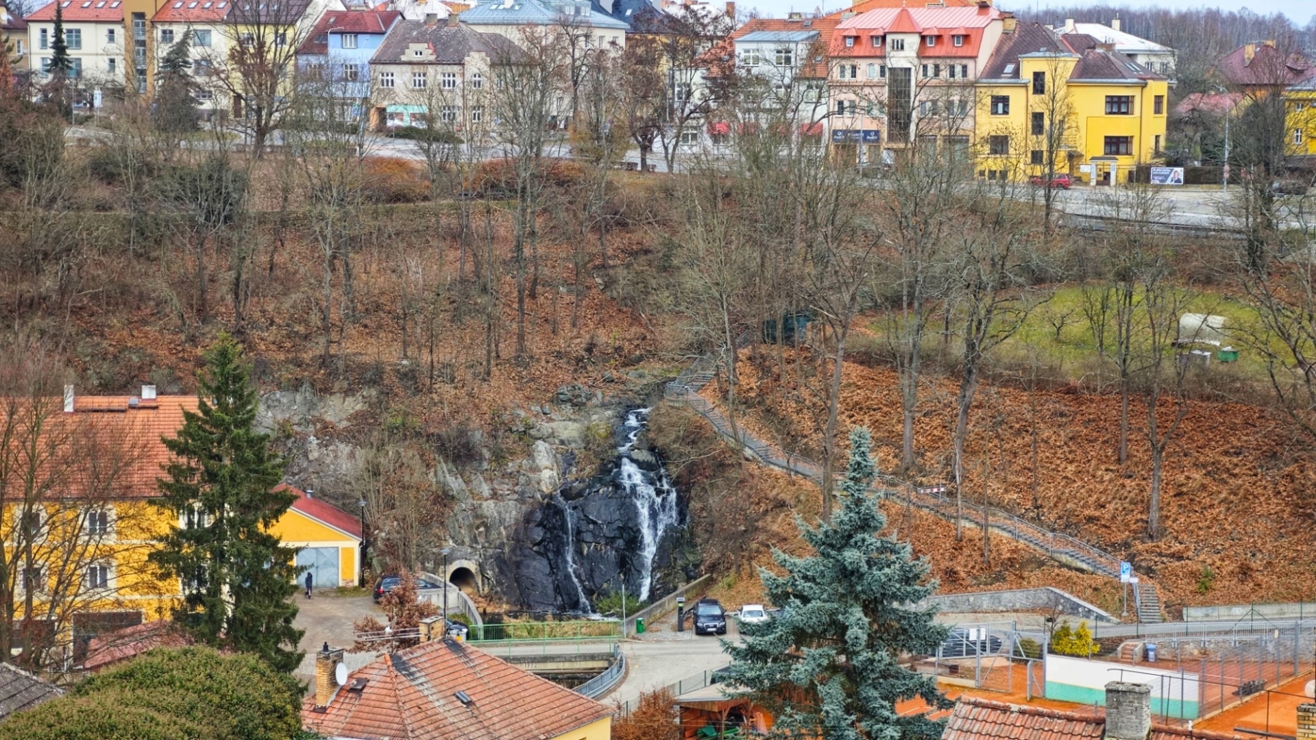 Jordánský vodopád z hradebního opevnění.