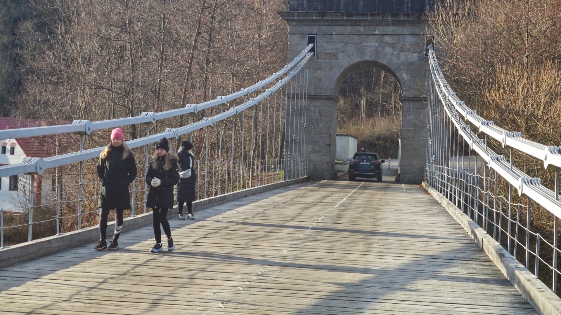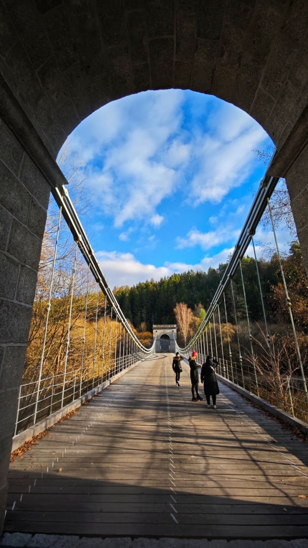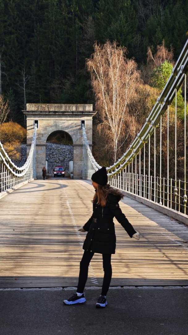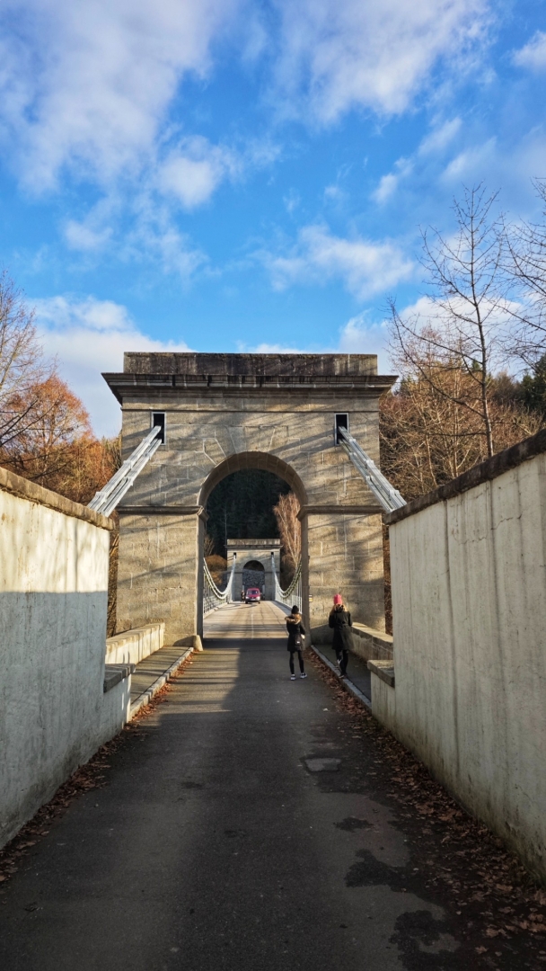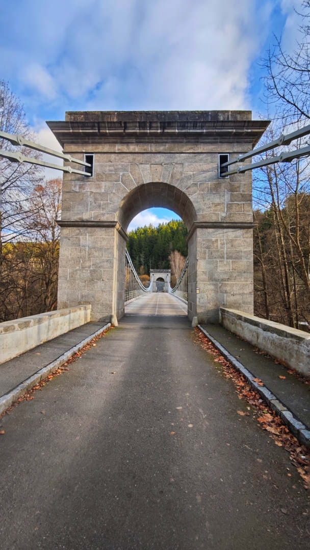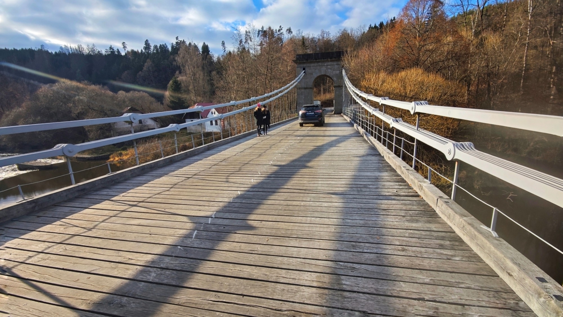 Průjezd osobním autům je sice umožněný, ovšem pouze do šířky 2 m. Mezi sloupy tvořícími zábrany projedeme jen tak tak. Odřená barva červenobíle natřených sloupků odhaluje, kolik aut se mezi ně nevešlo. Nebo vešlo, ale s odřenýma ušima. Vlastně zrcátkama. Já jedno na své straně pro jistotu sklápím. Charakteristické dunění při průjezdu po mostu vytváří dřevěné trámy, po nichž se jede. Parkujeme na opačné straně a jdeme nejprve projít po mostě, abychom poté skončili i pod ním. Slunce již roztrhalo oblačnost a hezky hřeje. Sestupujeme dolů zarostlým svahem, když se ozve Hanky zvučný smích. Jitce při přeskoku stoly ujela nožka a zabořila svůj milý čumáček do měkké hlíny za překážkou. Asi v zemi chvíli jako divoké prasátko hledala něco dobrého k snědku, jelikož jí prý trvalo hodnou chvíli, než vstala. O tuto zvláštní scénku jsme bohužel přišli a jen otisk obličeje v řídké trávě ji potvrzuje. Škoda, že Jíťa není známá jako Jára Cimrman, mohla zde mít ležící sádrovou sochu, jako on u železniční stanice Kaproun, kde byl vyloučen jakožto černý pasažér z dopravy.