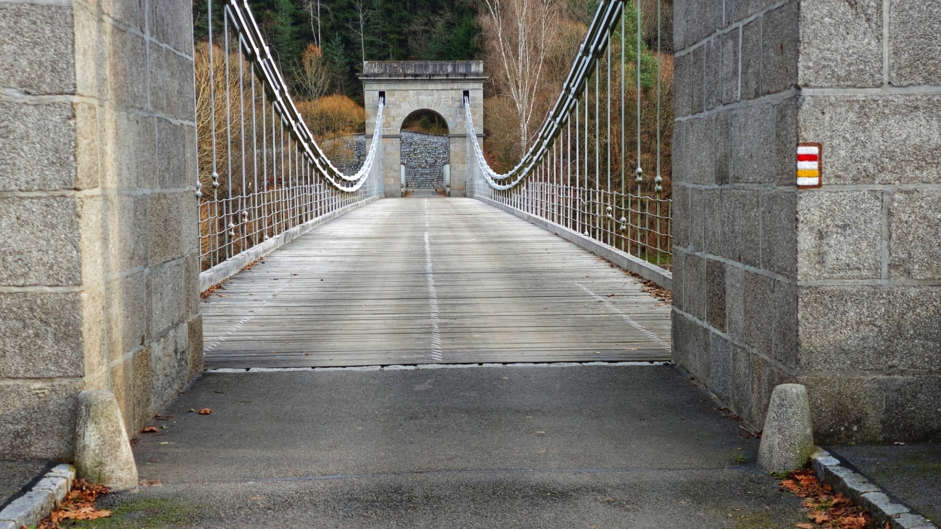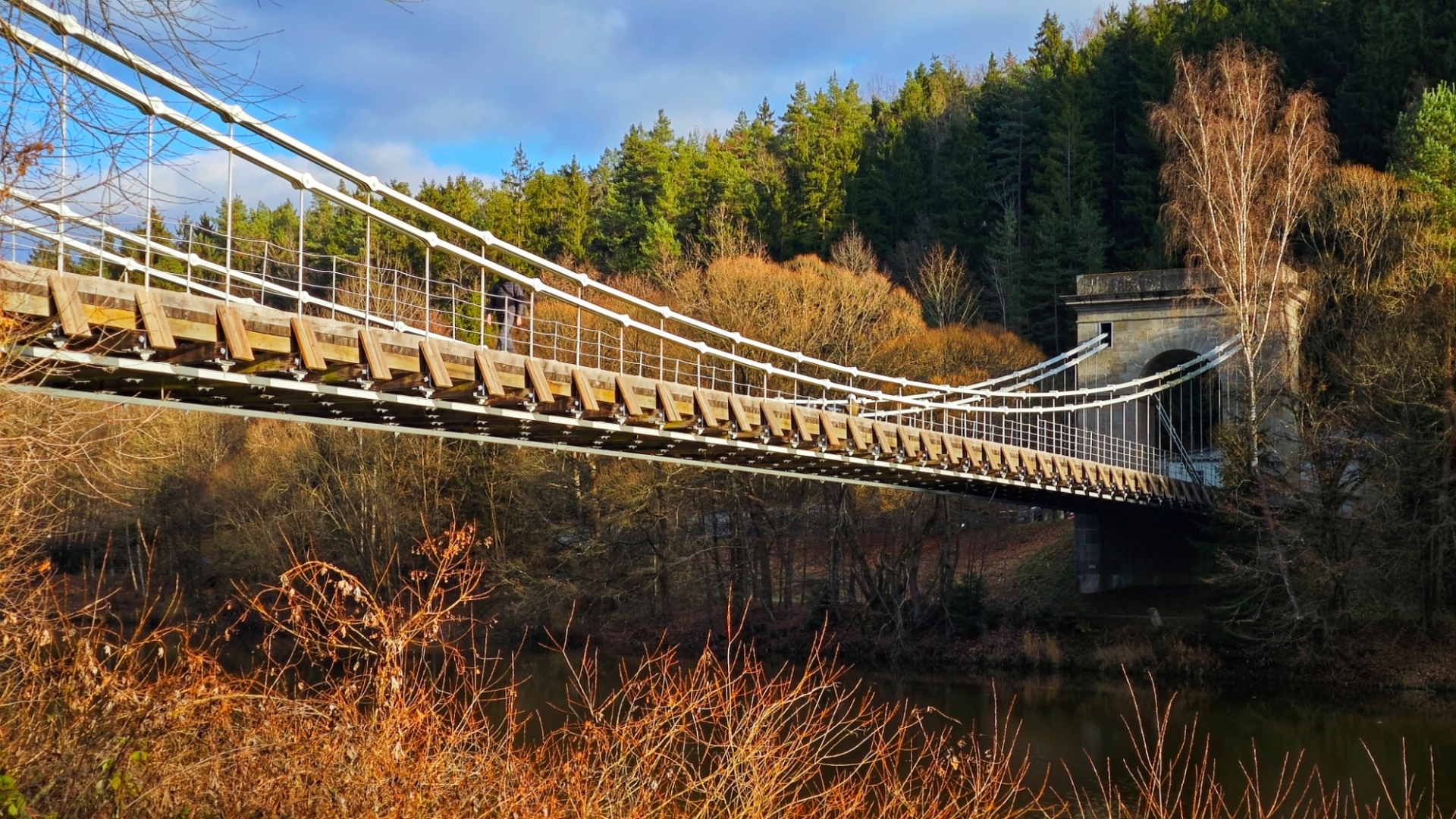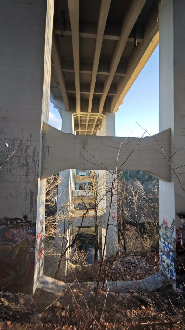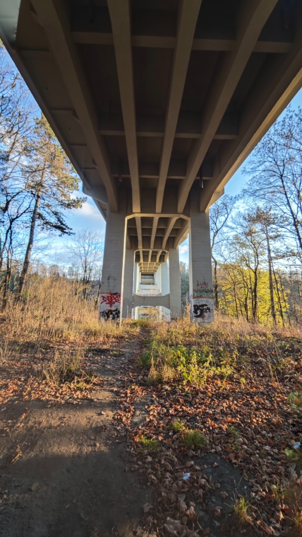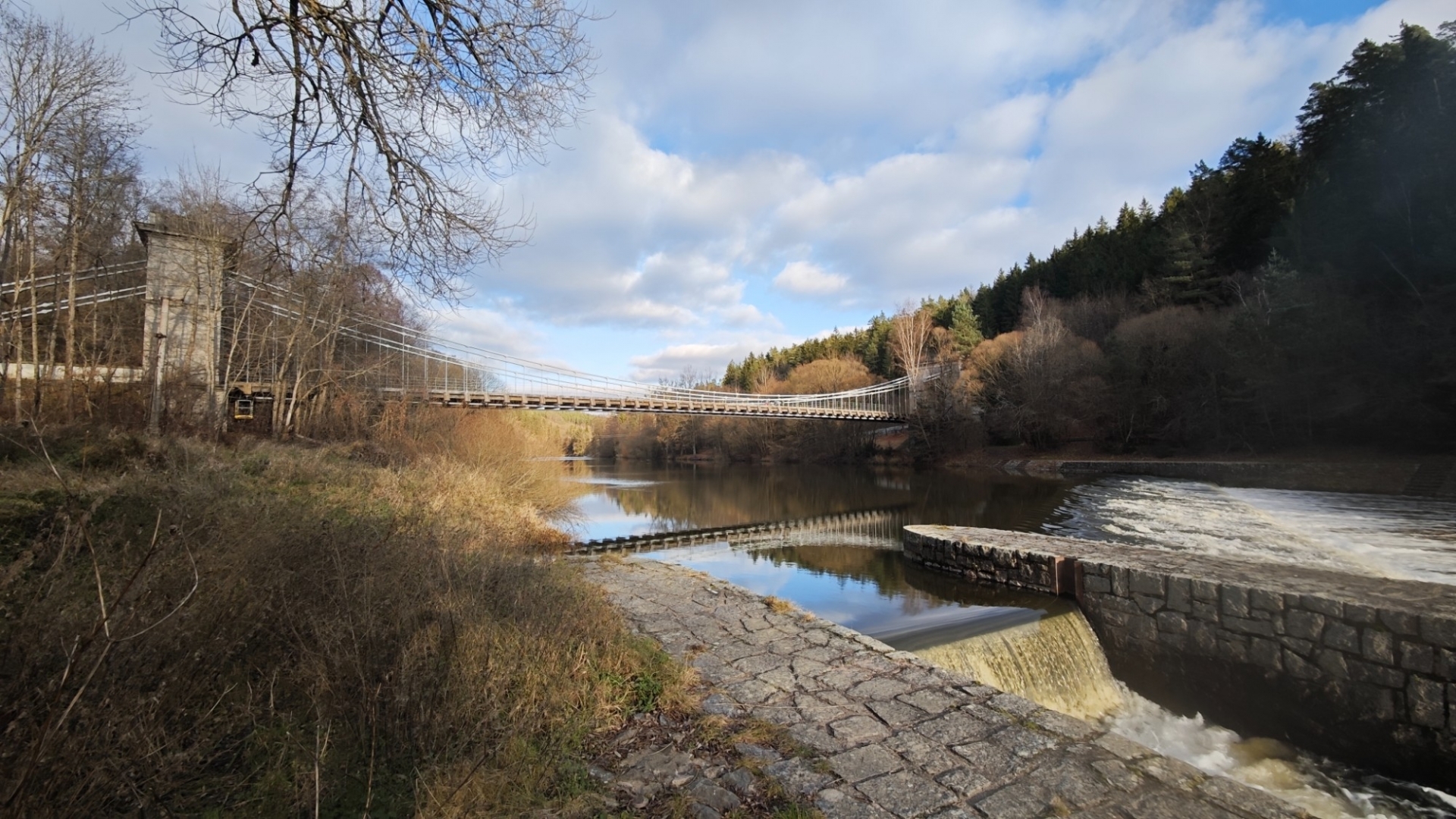 Průjezd osobním autům je sice umožněný, ovšem pouze do šířky 2 m. Mezi sloupy tvořícími zábrany projedeme jen tak tak. Odřená barva červenobíle natřených sloupků odhaluje, kolik aut se mezi ně nevešlo. Nebo vešlo, ale s odřenýma ušima. Vlastně zrcátkama. Já jedno na své straně pro jistotu sklápím. Charakteristické dunění při průjezdu po mostu vytváří dřevěné trámy, po nichž se jede. Parkujeme na opačné straně a jdeme nejprve projít po mostě, abychom poté skončili i pod ním. Slunce již roztrhalo oblačnost a hezky hřeje. Sestupujeme dolů zarostlým svahem, když se ozve Hanky zvučný smích. Jitce při přeskoku stoly ujela nožka a zabořila svůj milý čumáček do měkké hlíny za překážkou. Asi v zemi chvíli jako divoké prasátko hledala něco dobrého k snědku, jelikož jí prý trvalo hodnou chvíli, než vstala. O tuto zvláštní scénku jsme bohužel přišli a jen otisk obličeje v řídké trávě ji potvrzuje. Škoda, že Jíťa není známá jako Jára Cimrman, mohla zde mít ležící sádrovou sochu, jako on u železniční stanice Kaproun, kde byl vyloučen jakožto černý pasažér z dopravy.