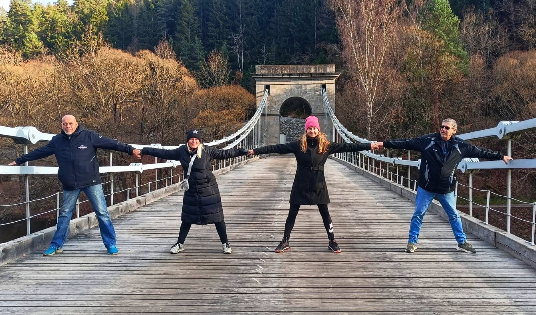 Dalším zlatým hřebem programu bude průjezd po řetězovém mostu přes Lužnici. Do hlubokého údolí řeky odbočujeme kousek za Malšicemi. Serpentiny nás lesem vedou k vzácné technické památce. Je téměř zázrak, že do dnešních dnů přežila. Jedná se o poslední empírový řetězový most v České republice, který je ojedinělým mostem tohoto druhu v celé Evropě. Cestu dobře znám, vždyť jsem při svých revizích jednotného času tudy jezdíval pravidelně i čtyřikrát ročně. Zkracoval si tak cestu z Malšic do Stádlece, kde bývala zemědělská škola na zámku. To dřive nebývalo výjimkou, v devadesátkách jsem se dostával do mnoha zajímavých míst, včetně zámků, které patřily státu. Dnes se většina navrátila do soukromích rukou.