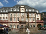 Vrátili jsme se do centra a vydali se na náměstí. Zašel jsem do infocentra, kde jsem vzal cyklistickou mapu, která nám vystačila na další tři dny, než jsme ji v Durlachu zahodili. Pak mě napadlo, kde asi naše cyklostezka zabočovala. Konečně jsme jeli správně, nicméně do šíleného a dlouhého kopce, naštěstí většinou schováni ve stínu před úporným sluncem. Dostali jsme se alespoň nad údolí. Hned jsme si však malou část sjeli k trati, která také stoupala z města. Škoda, že cyklostezka nevede podél trati, to by byla jiná jízda.