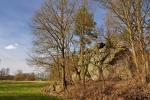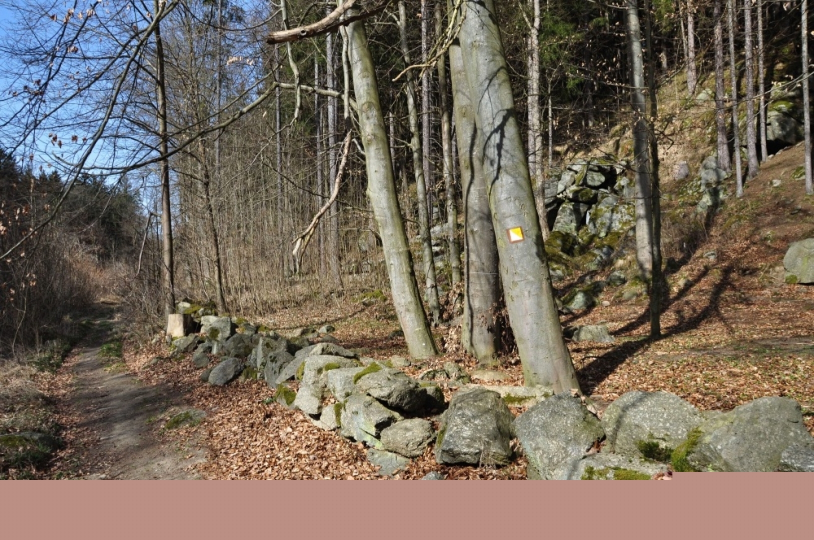 Rozcestník několika značek nás posílá tentokrát na žlutě označenou naučnou stezku. Ta vede kolem kamenité zídky, která nás bude doprovázet až do Varvažova. Překonáváme padlé stromy a v podmáčeném terénu hledáme, často marně, naši vlčí stezku. Postup vpřed se zpomalil, ale to je nám celkem jedno. Jen to slunce kdyby tolik netýralo naše hlavy. Přece jen ještě nejsme na vysoké teploty uvyklí.