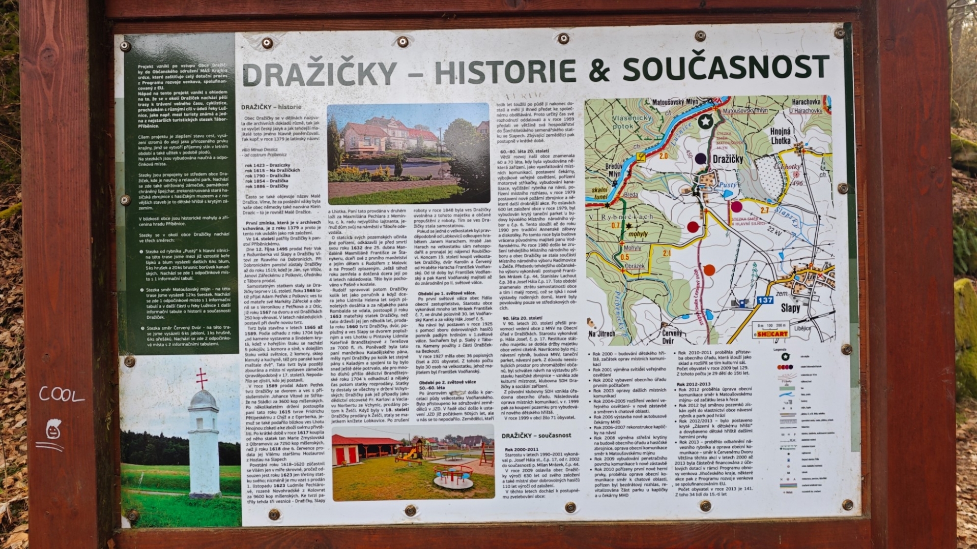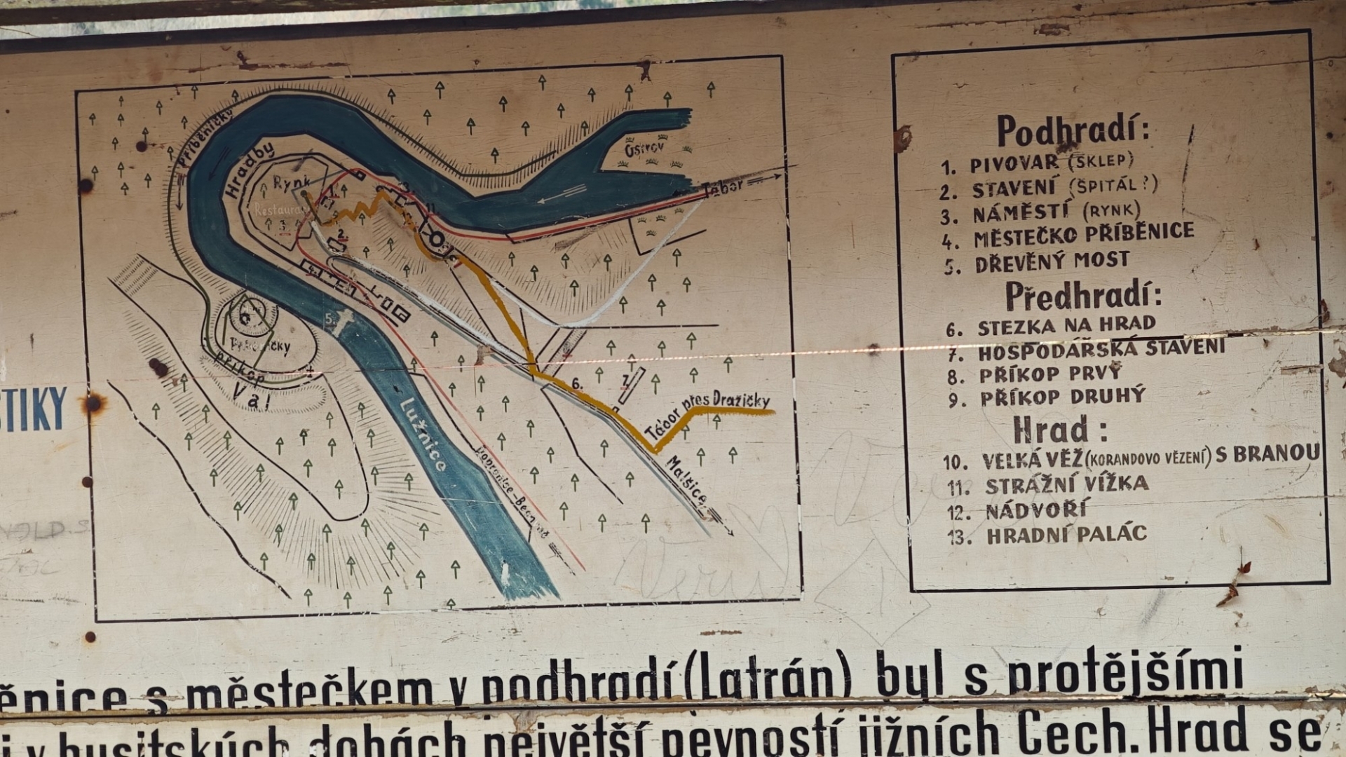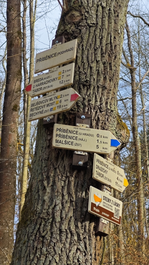 Lezeme svahem prudce vzhůru na skalní ostroh, kde se dochovala část osmiboké věže a torza hlavních budov. Ještě zabloudíme nad hluboký příkop, který hrad měl chránit po řed nájezdníky, a po modré a žluté se vydáváme k rozcestí Pod Příběnicemi. Ty ovšem na mapě již nenajdete. Zbyly jen louky a hluboký les, kterým kráčíme do údolí Příběnického potoka a pak stoupáme k nedalekému mohylovému pohřebišti, které je největším a nejzachovalejším v Čechách. Na místě bychom našli téměř sto mohyl z období halštatského až slovanského. Vyjdeme ven z lesa a pohledem hledáme Dražičky. Leží pod loukou vlevo od nás.