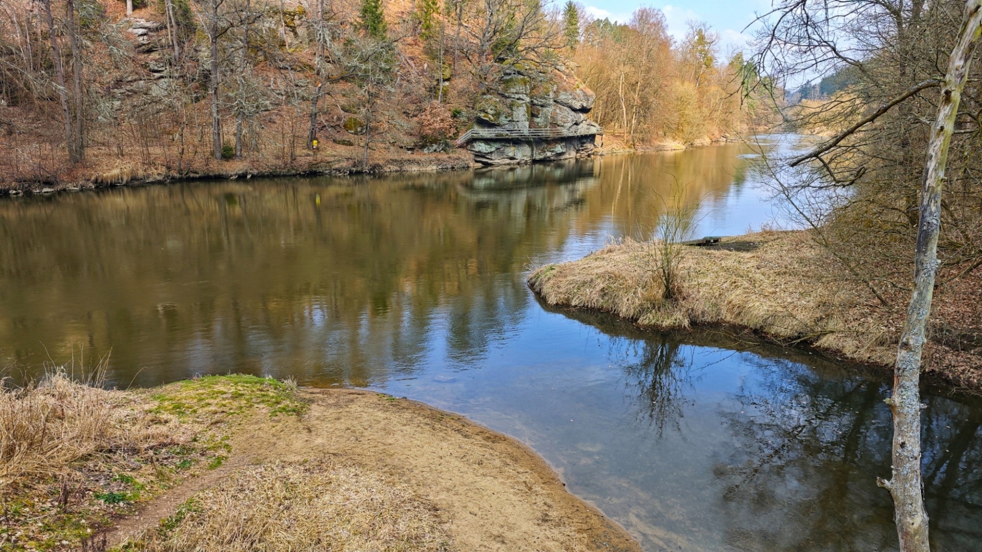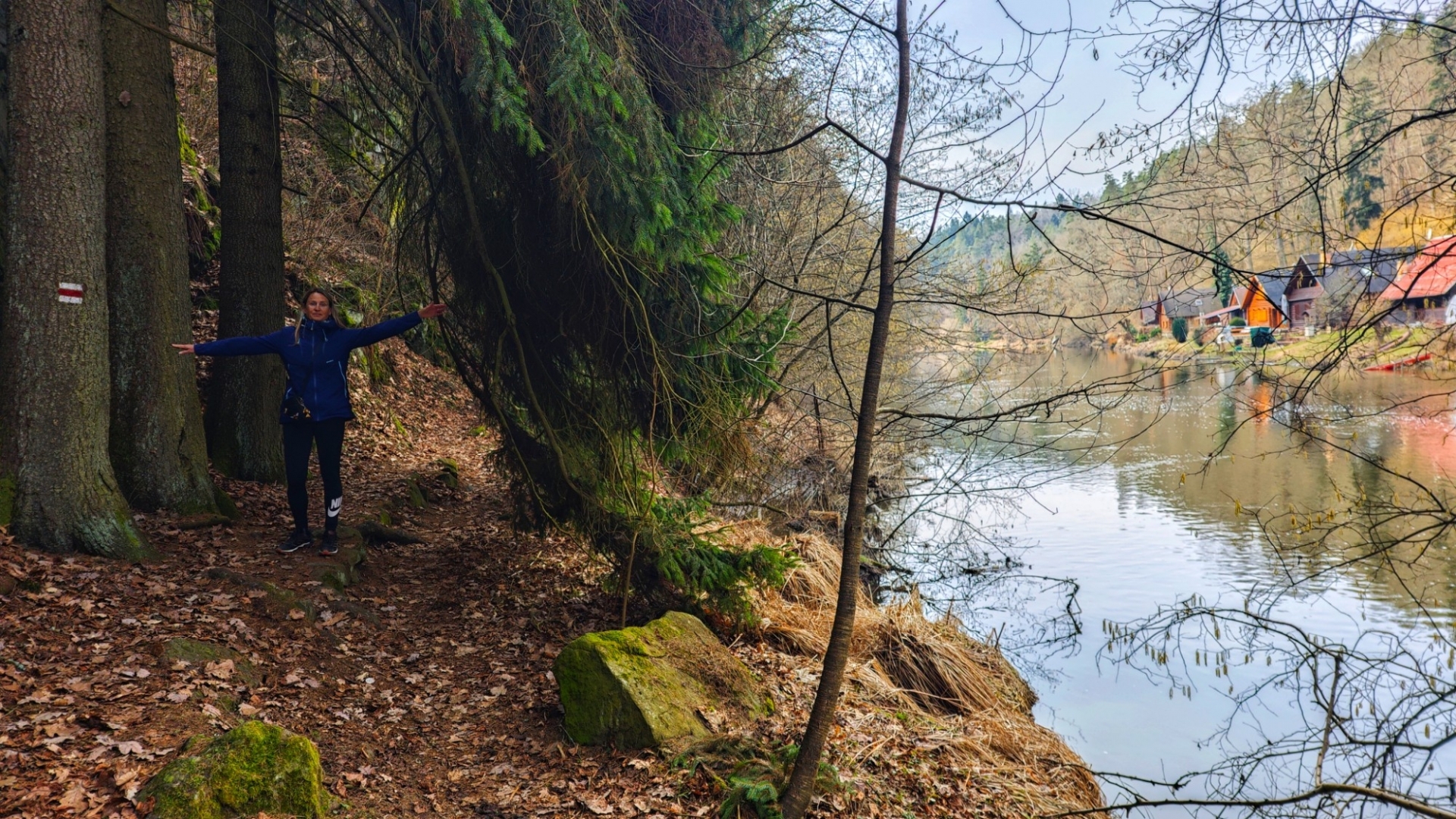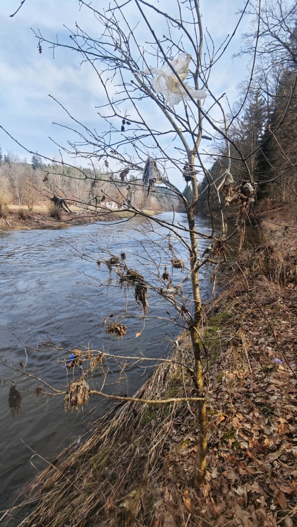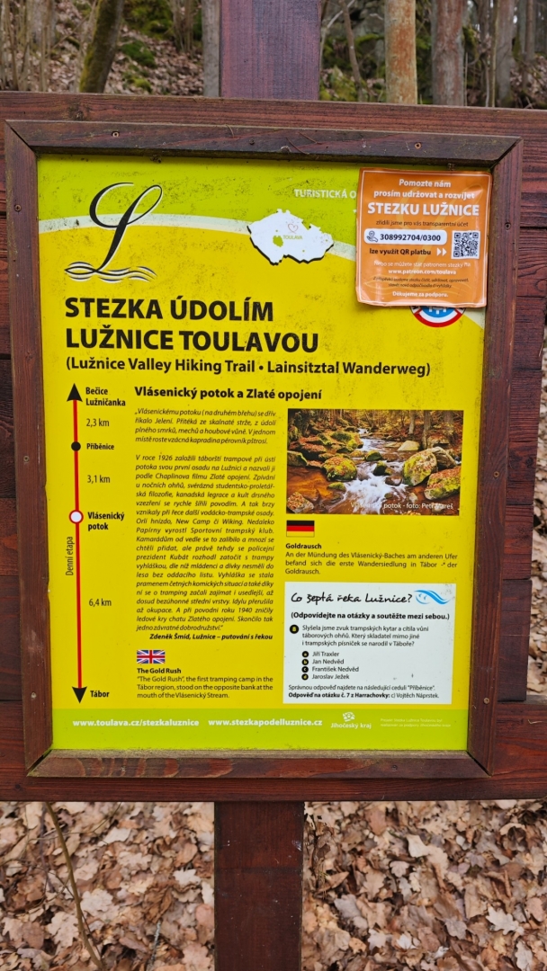 Kolem Lužnice jdeme k chatové osadě, kde rozkvetly desítky sněženek. Plakát na stromů nás upozorňuje, že zde byla spatřena neznámá šelma, zřejmě puma. Tahle zpráva ovšem médii proběhla již někdy počátkem zimy. Unaveni jdeme zpět k autu do Nuzic. Asi šestikilometrový okruh nebyl až tak snadný, jak se zprvu zdálo.