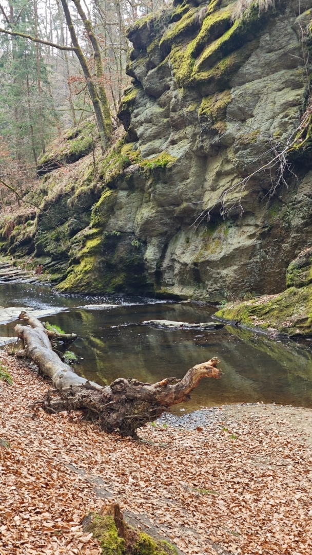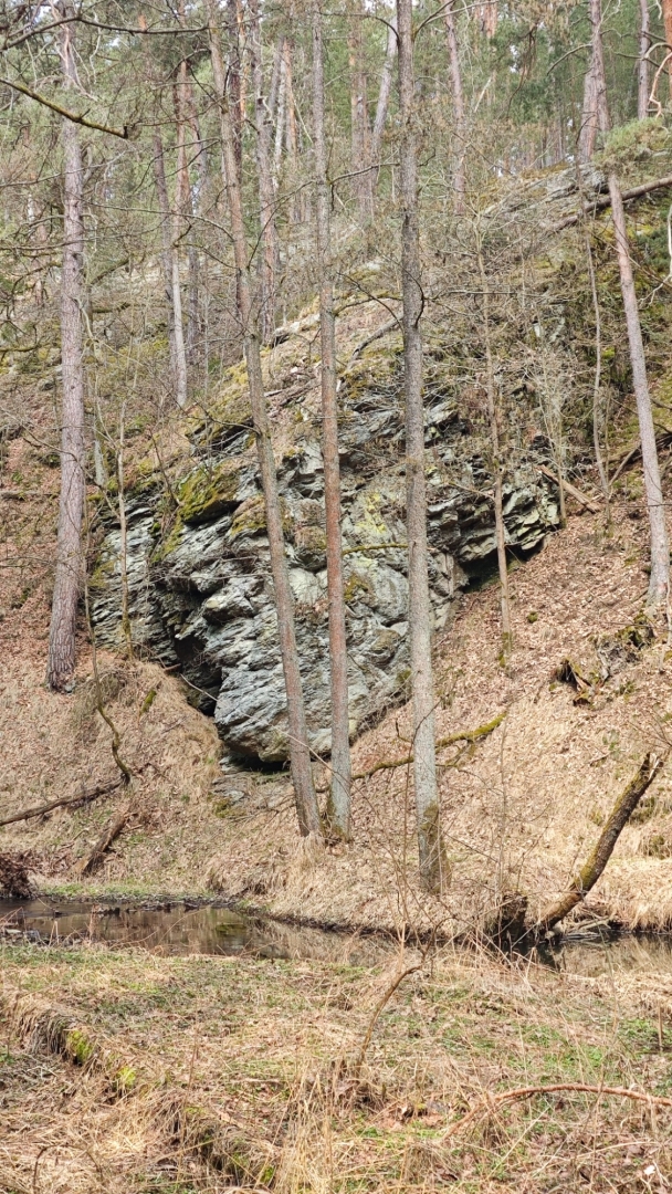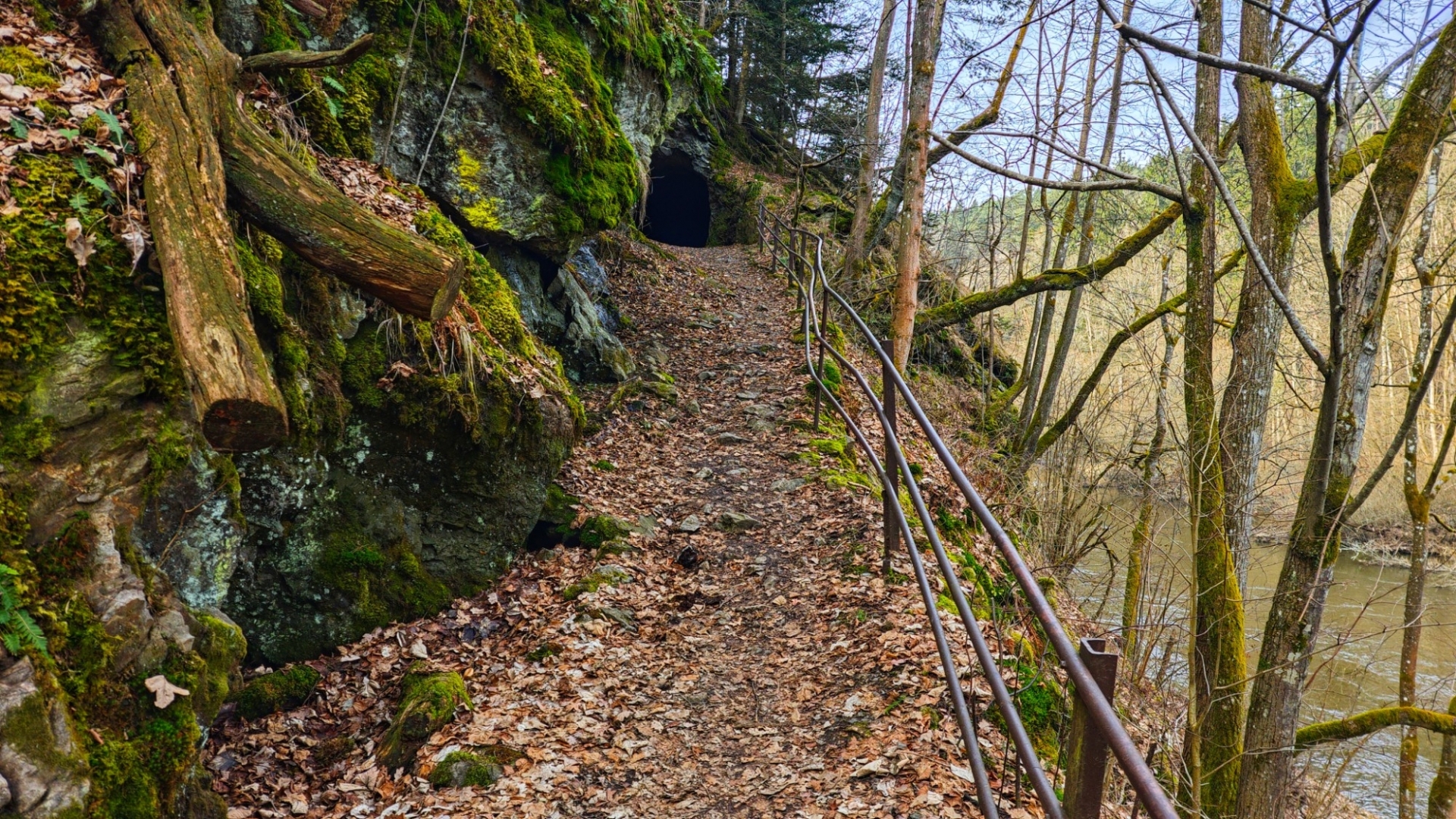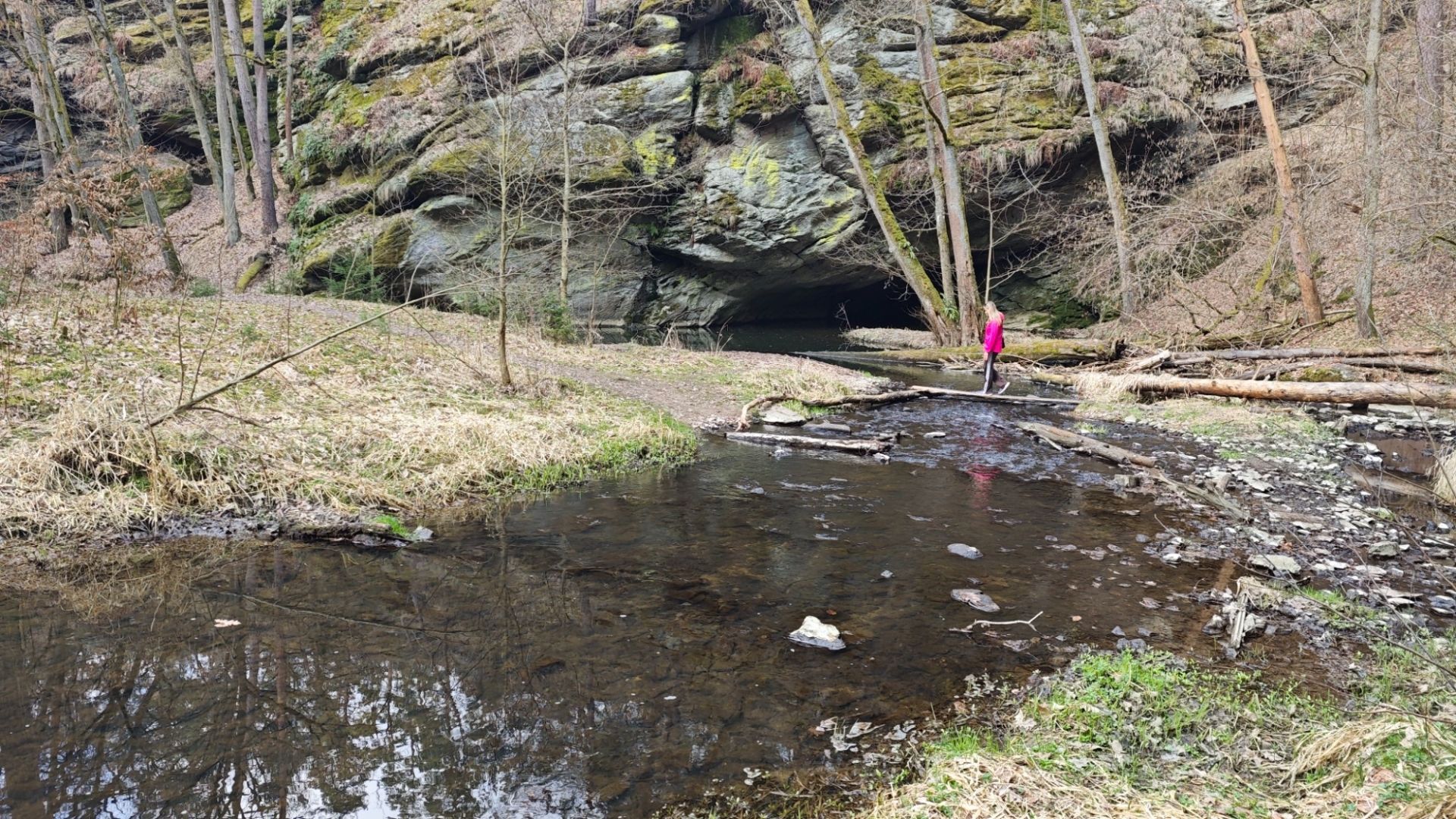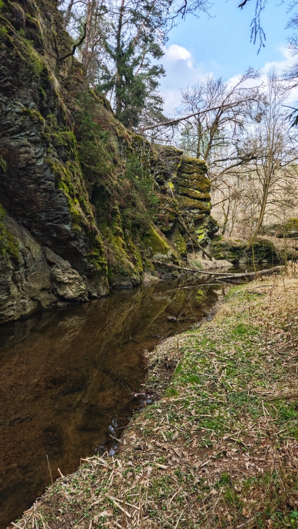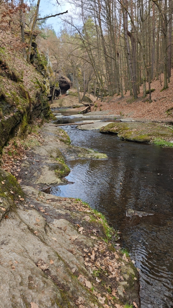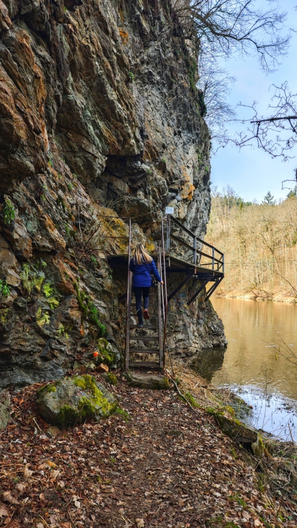 U rozcestí Breda na chvilku nastavujeme. Na louce za řekou vidíme další bývalý mlýn z 14 století, co pamatuje pořádný kus historie. Blížíme se k Candátí skále, skrze kterou vede tunel. Jedna z atrakcí na stezce zaujme Hanku, jež začíná děkat modelku. Před tunelem i uvnitř jí to moc sluší. Je docela možné, že zprůchodnění stezky pro turisty záviselo právě na proražení skály v testech 1938 - 1939. Je dlouhý 32 m, široký 2 m, vysoký 2,5 m a v roce 2009, zde byla odhalena pamětní deska se základními informacemi. Hezkým místem je i údolí Příběnického potoka, kde se snažím objektivem mobilu na chviličku zastavit čas. Kolem rozkvetl jaterník podléška. Trojlaločné listy svým tvarem připomínají játra a právě tomu odpovídá české jméno jaterník i vědecké jméno Hepatica (hepar jsou latinsky játra). Druhové jméno podléška je odvozeno z toho, že bylinka často roste pod lískami. Ani jasně modré květy mne nenechají býti chladným. Klesám na kolena a snažím se co nejvěrněji zachytit jejich krásu.