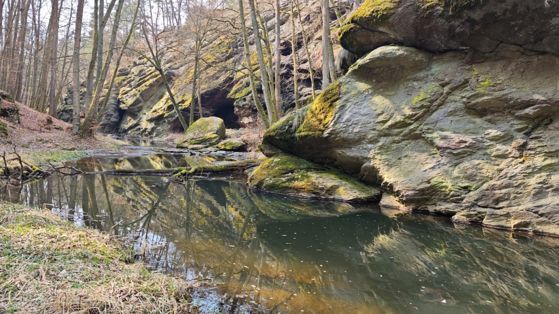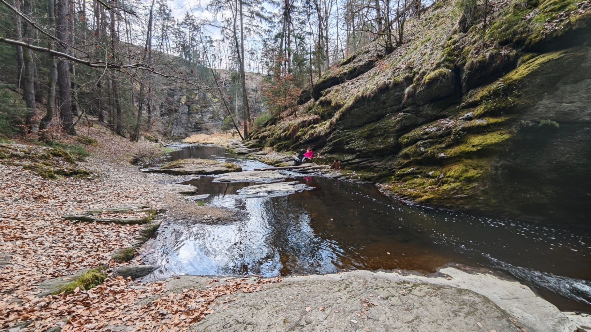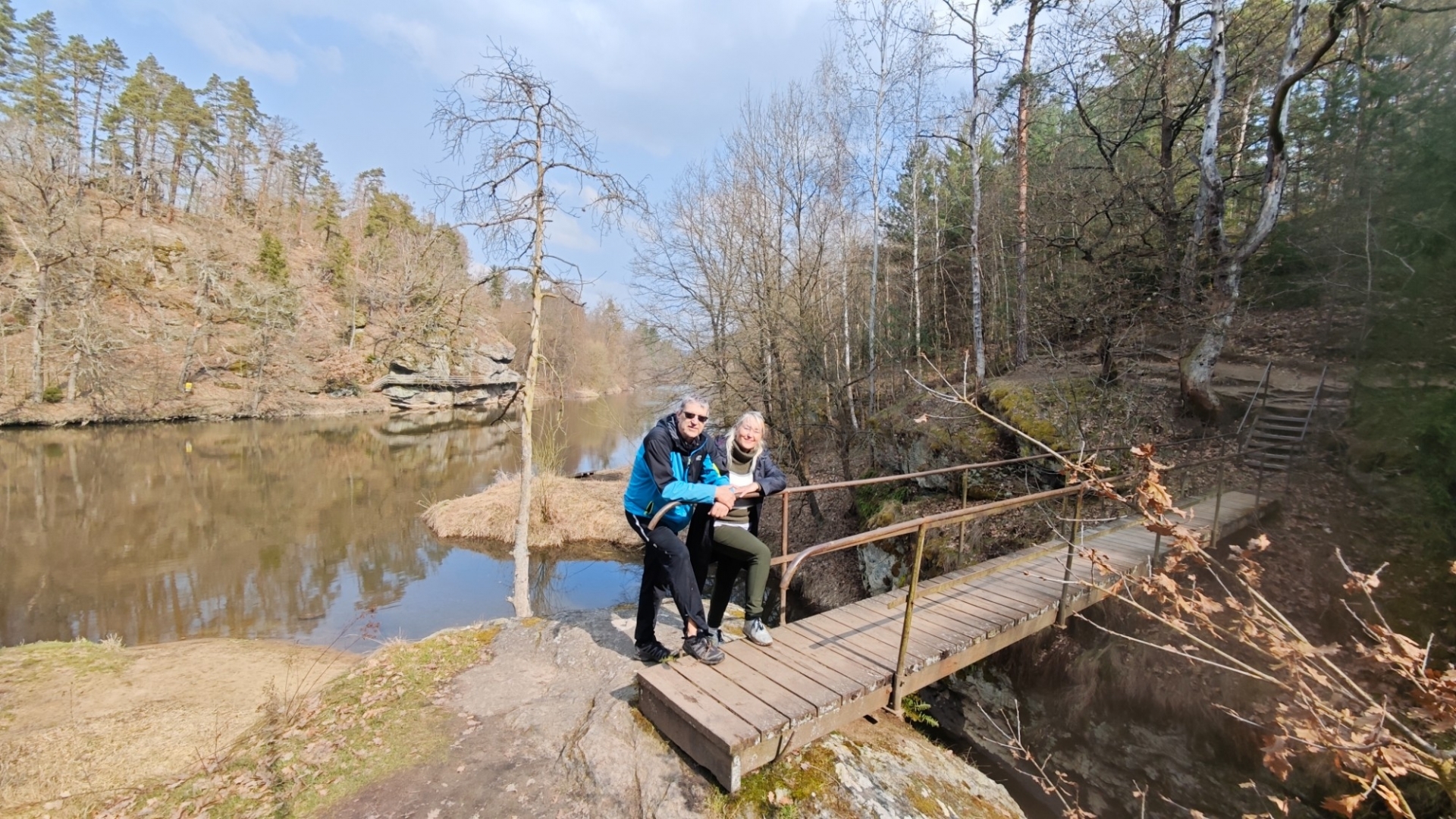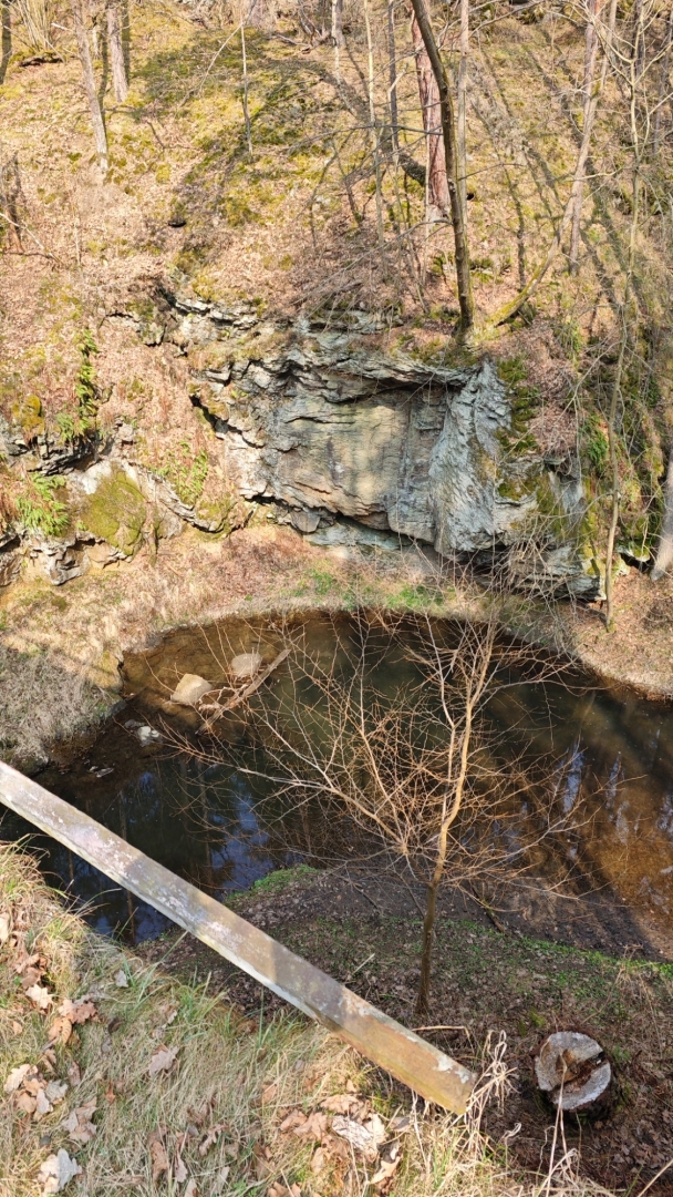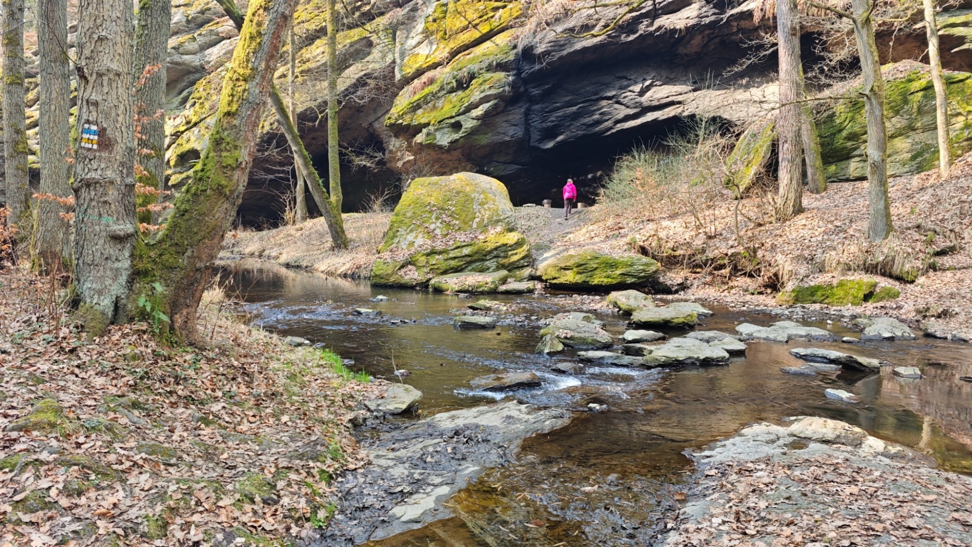 U rozcestí Breda na chvilku nastavujeme. Na louce za řekou vidíme další bývalý mlýn z 14 století, co pamatuje pořádný kus historie. Blížíme se k Candátí skále, skrze kterou vede tunel. Jedna z atrakcí na stezce zaujme Hanku, jež začíná děkat modelku. Před tunelem i uvnitř jí to moc sluší. Je docela možné, že zprůchodnění stezky pro turisty záviselo právě na proražení skály v testech 1938 - 1939. Je dlouhý 32 m, široký 2 m, vysoký 2,5 m a v roce 2009, zde byla odhalena pamětní deska se základními informacemi. Hezkým místem je i údolí Příběnického potoka, kde se snažím objektivem mobilu na chviličku zastavit čas. Kolem rozkvetl jaterník podléška. Trojlaločné listy svým tvarem připomínají játra a právě tomu odpovídá české jméno jaterník i vědecké jméno Hepatica (hepar jsou latinsky játra). Druhové jméno podléška je odvozeno z toho, že bylinka často roste pod lískami. Ani jasně modré květy mne nenechají býti chladným. Klesám na kolena a snažím se co nejvěrněji zachytit jejich krásu.