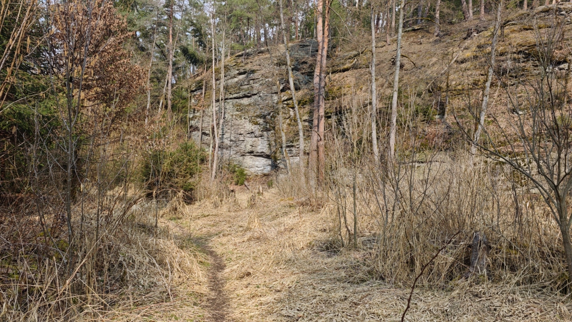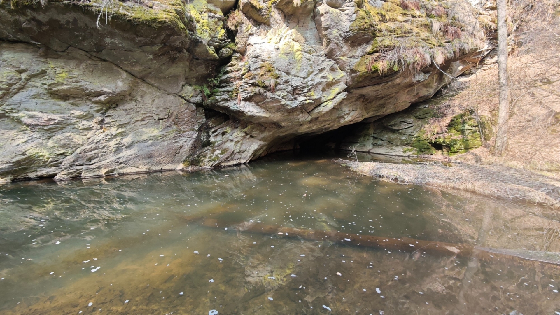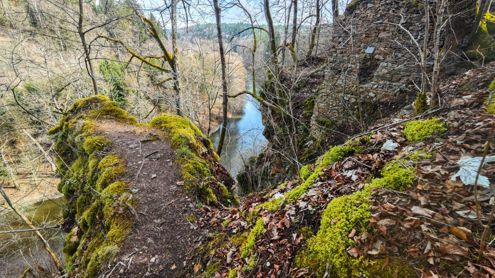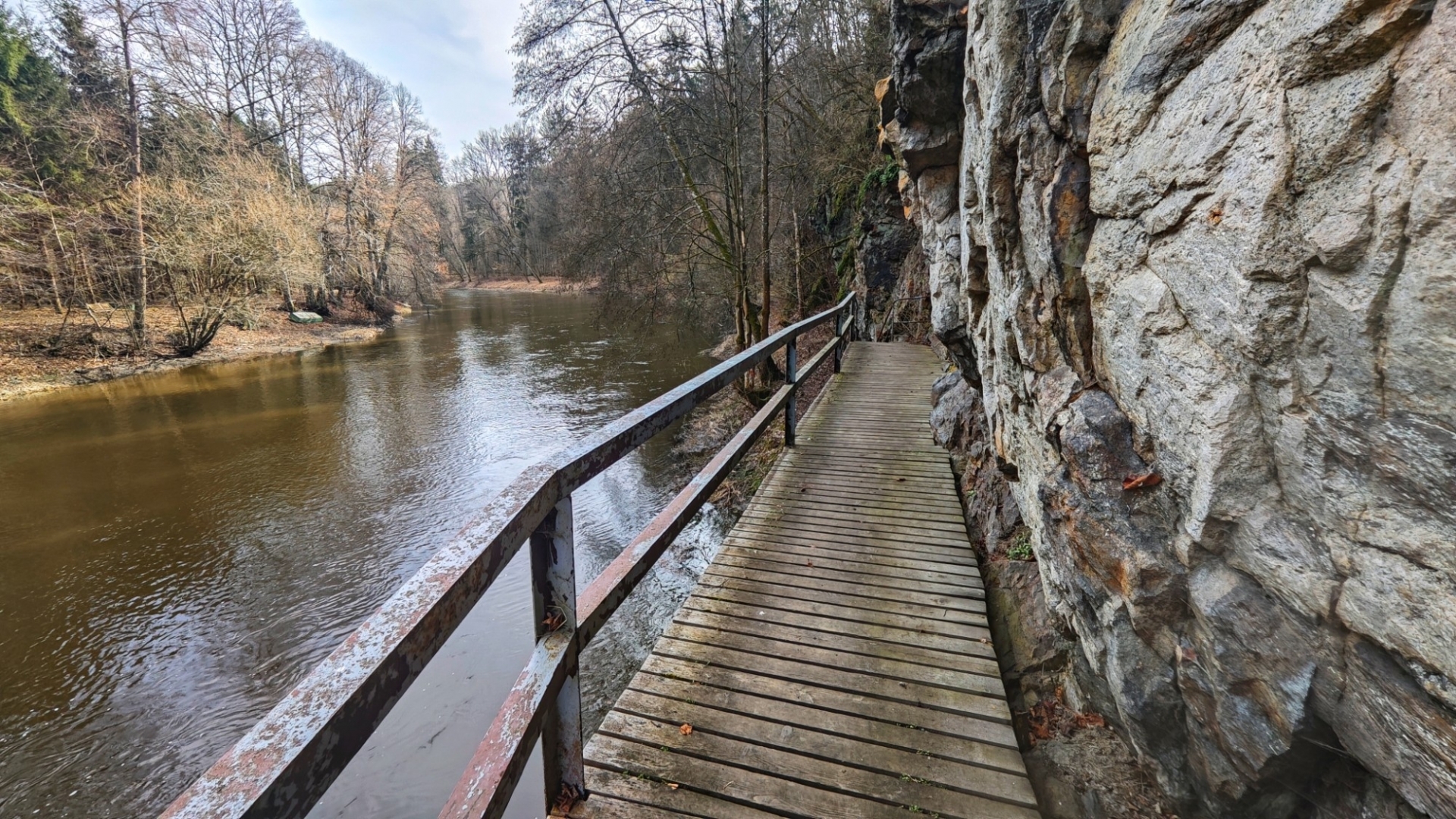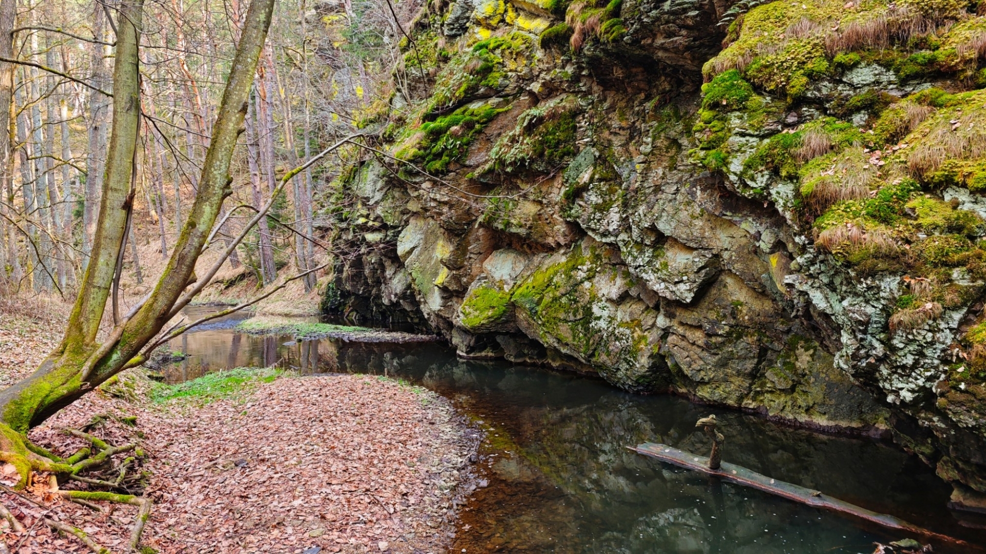 U rozcestí Breda na chvilku nastavujeme. Na louce za řekou vidíme další bývalý mlýn z 14 století, co pamatuje pořádný kus historie. Blížíme se k Candátí skále, skrze kterou vede tunel. Jedna z atrakcí na stezce zaujme Hanku, jež začíná děkat modelku. Před tunelem i uvnitř jí to moc sluší. Je docela možné, že zprůchodnění stezky pro turisty záviselo právě na proražení skály v testech 1938 - 1939. Je dlouhý 32 m, široký 2 m, vysoký 2,5 m a v roce 2009, zde byla odhalena pamětní deska se základními informacemi. Hezkým místem je i údolí Příběnického potoka, kde se snažím objektivem mobilu na chviličku zastavit čas. Kolem rozkvetl jaterník podléška. Trojlaločné listy svým tvarem připomínají játra a právě tomu odpovídá české jméno jaterník i vědecké jméno Hepatica (hepar jsou latinsky játra). Druhové jméno podléška je odvozeno z toho, že bylinka často roste pod lískami. Ani jasně modré květy mne nenechají býti chladným. Klesám na kolena a snažím se co nejvěrněji zachytit jejich krásu.