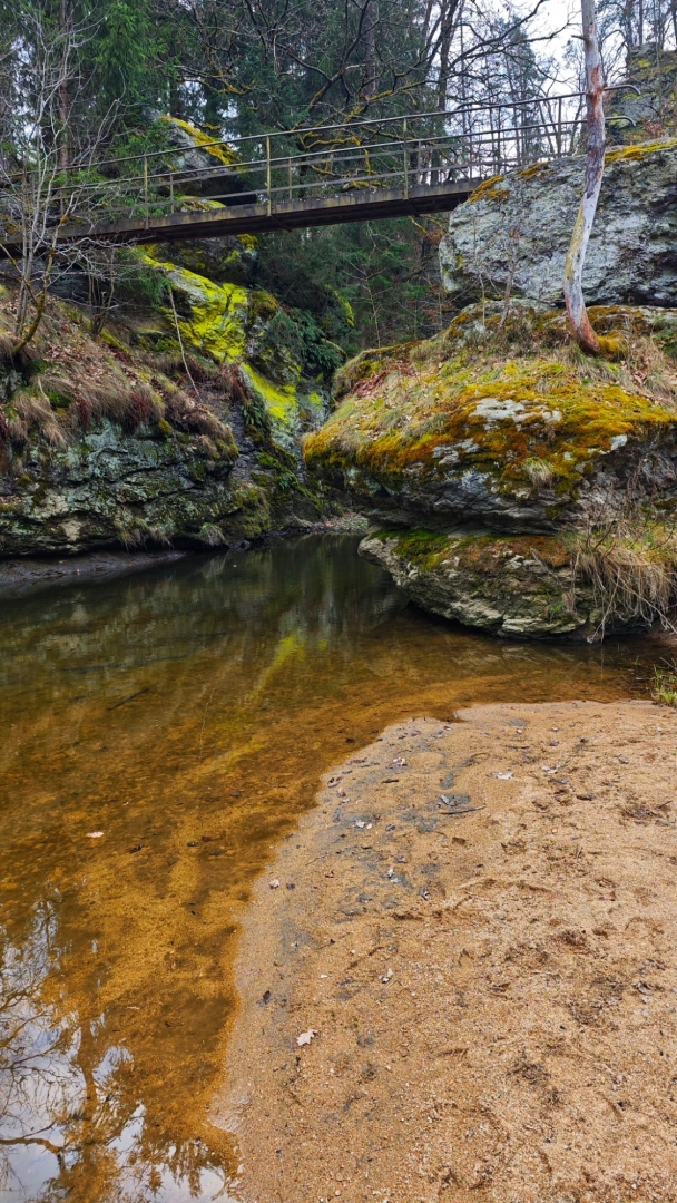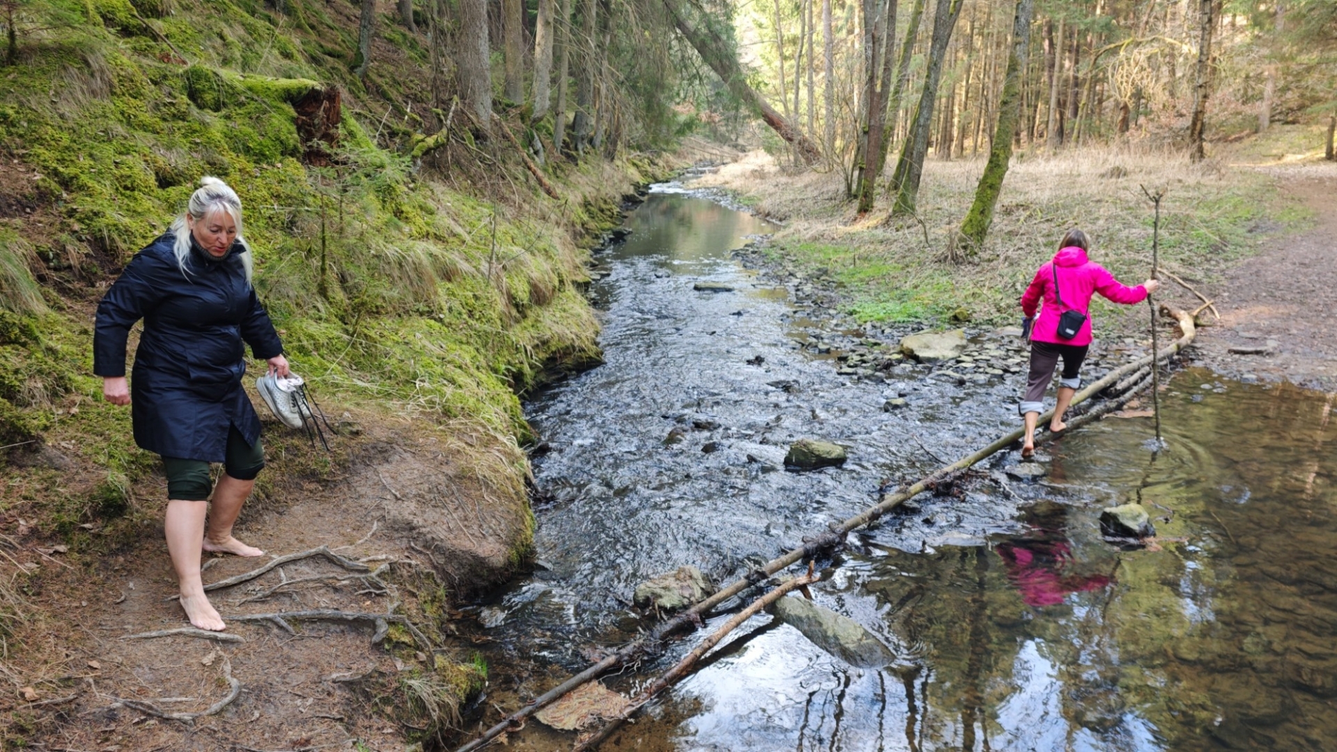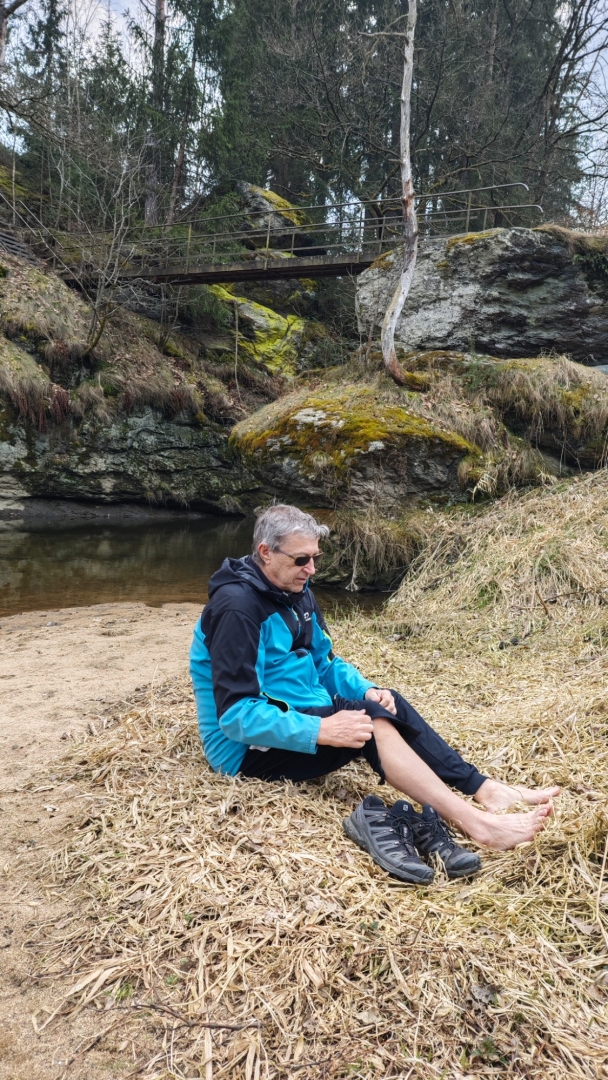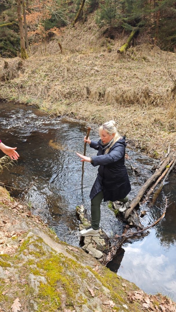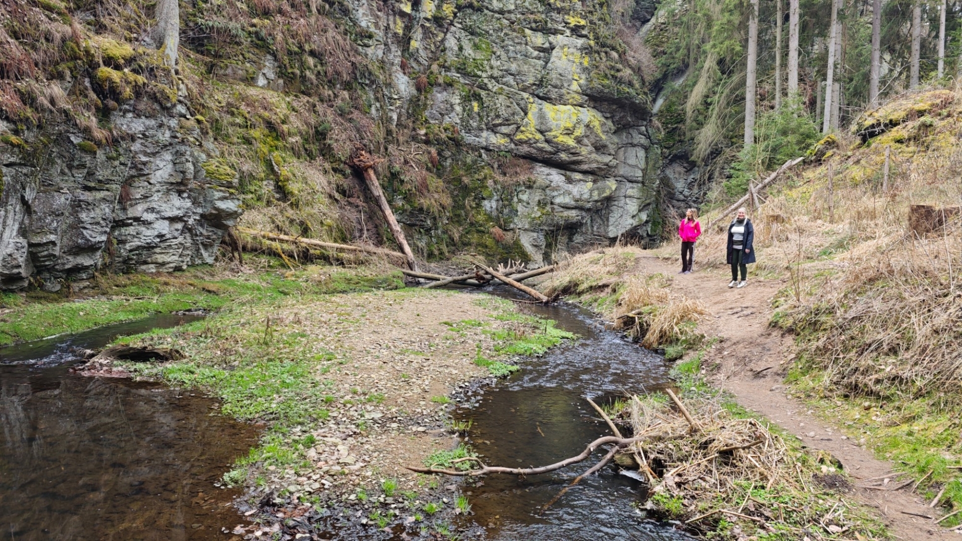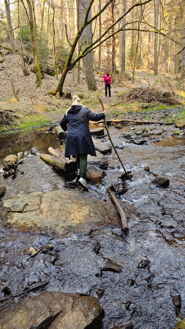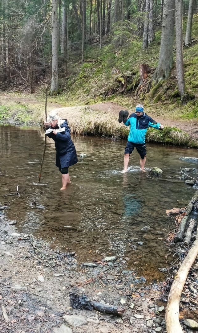 Skály v blízkosti potoka nutí stezku mnohokrát překonat meandry a balancovat po kmenech, větvích či kamenech v korytu není dost dobře možné. Z mapy napočítáme pět brodů, které jdou krátce za sebou. Ani si do trekových bot neberu ponožky, nemá to cenu. Jsem zvědavý, co tomu řekne moje nedoléčená viróza. Ale v ledové vodě, která působí jako Preisnitzova léčebná kúra, mi hned přestává téct z nosu. Ani jeden z první pětice přechodů nejde než přebrodit. Hanka je většinou před námi, jde svižně, pak jdu já a nakonec Jitka, která si ledovou vodu nejvíc užije, protože jde pomalu a opatrně. Užíváme si nepohodlí, jestli to tak jde nazvat. Kolem nás nestále mění potok směr, často kvůli skalám, které by bylo těžké překonávat přelézáním.