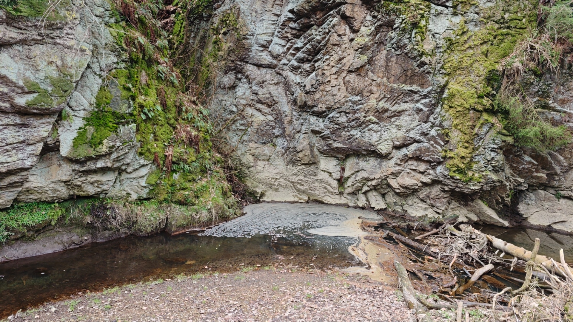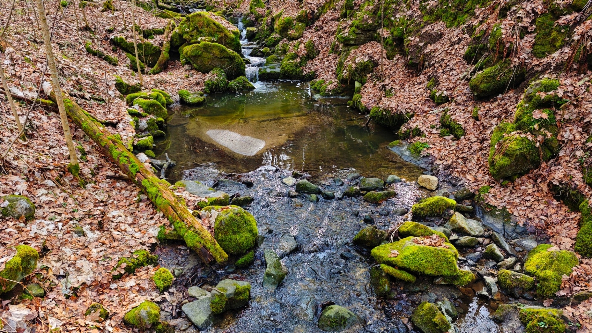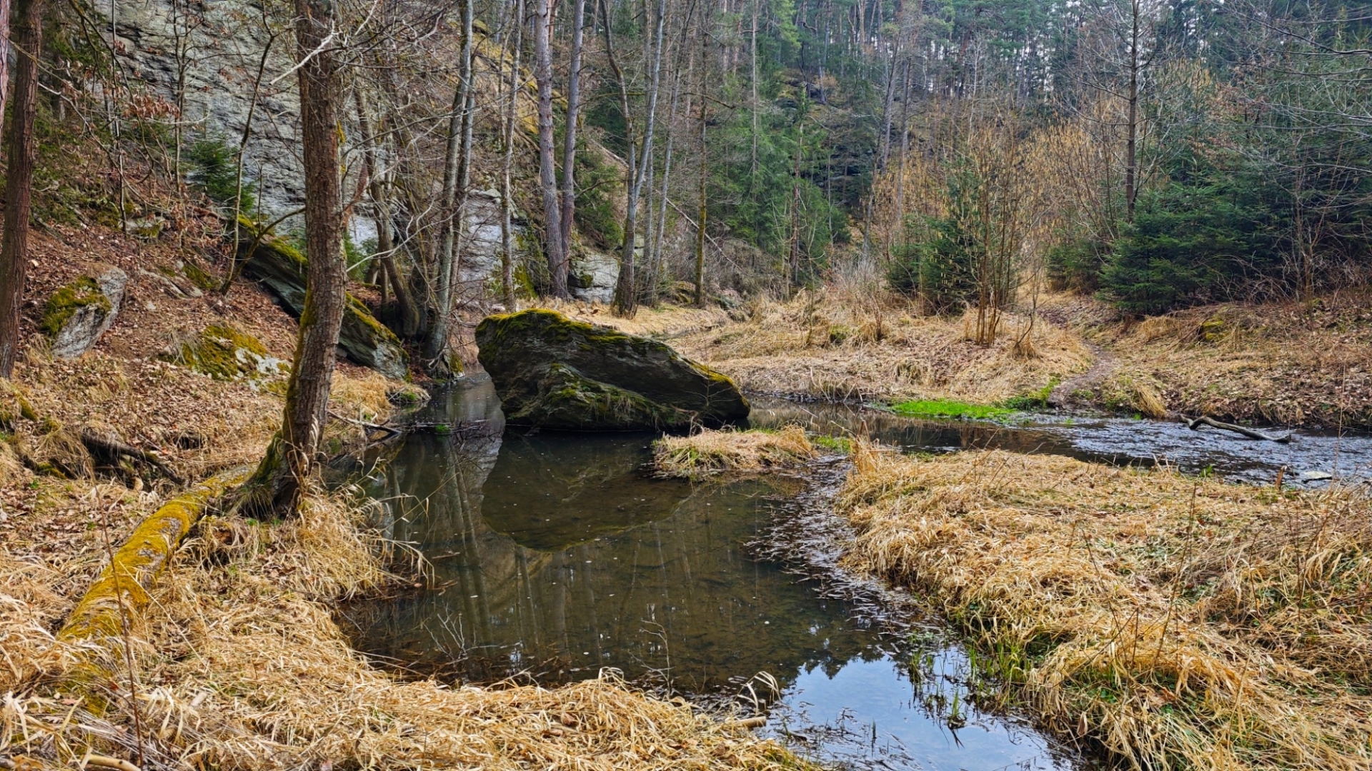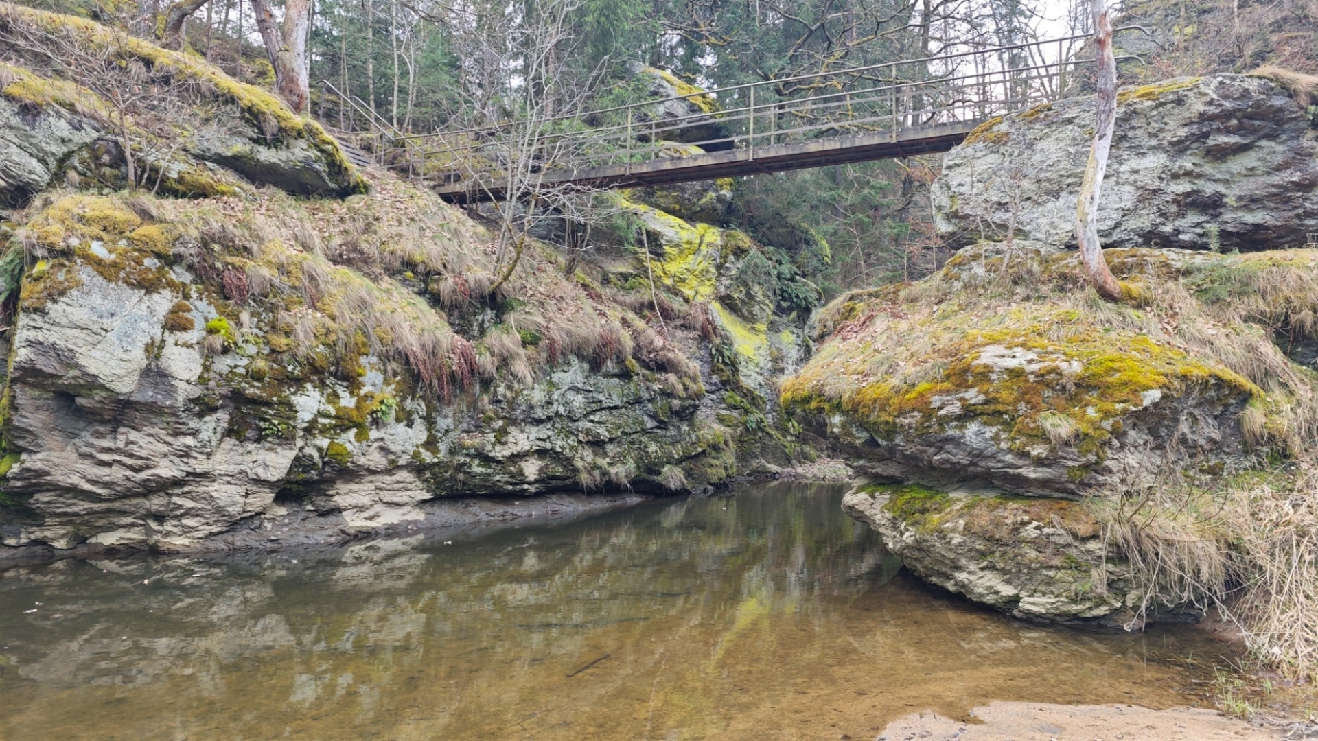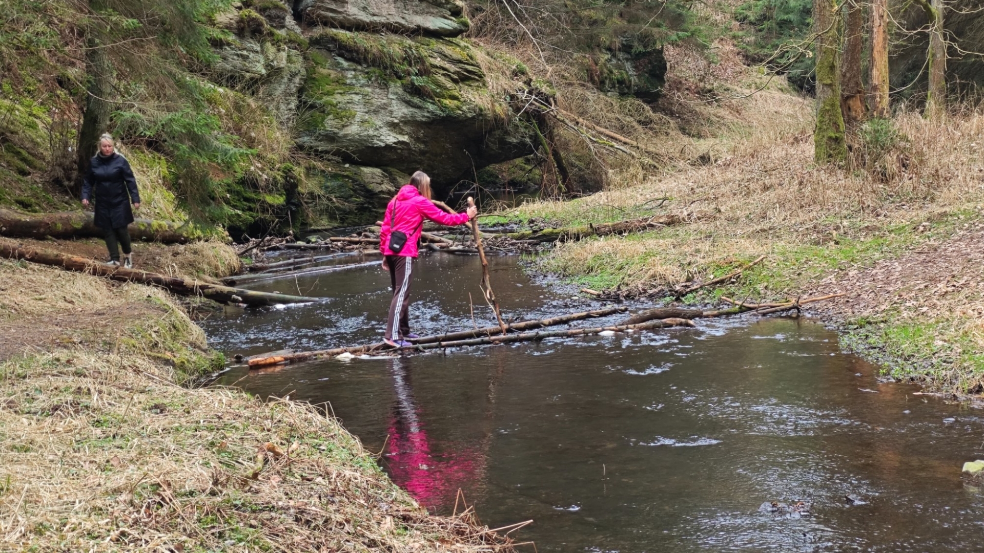 Skály v blízkosti potoka nutí stezku mnohokrát překonat meandry a balancovat po kmenech, větvích či kamenech v korytu není dost dobře možné. Z mapy napočítáme pět brodů, které jdou krátce za sebou. Ani si do trekových bot neberu ponožky, nemá to cenu. Jsem zvědavý, co tomu řekne moje nedoléčená viróza. Ale v ledové vodě, která působí jako Preisnitzova léčebná kúra, mi hned přestává téct z nosu. Ani jeden z první pětice přechodů nejde než přebrodit. Hanka je většinou před námi, jde svižně, pak jdu já a nakonec Jitka, která si ledovou vodu nejvíc užije, protože jde pomalu a opatrně. Užíváme si nepohodlí, jestli to tak jde nazvat. Kolem nás nestále mění potok směr, často kvůli skalám, které by bylo těžké překonávat přelézáním.