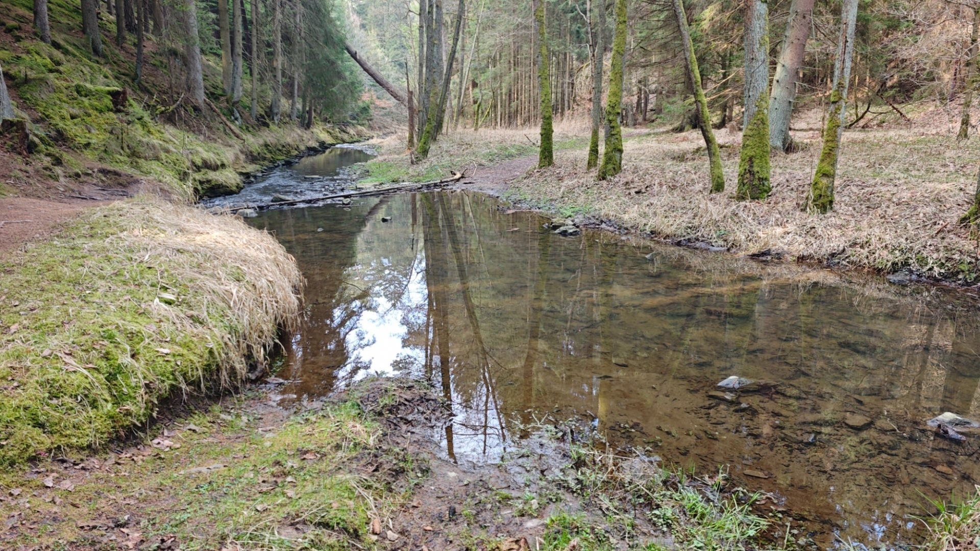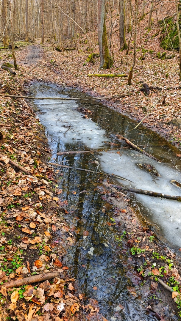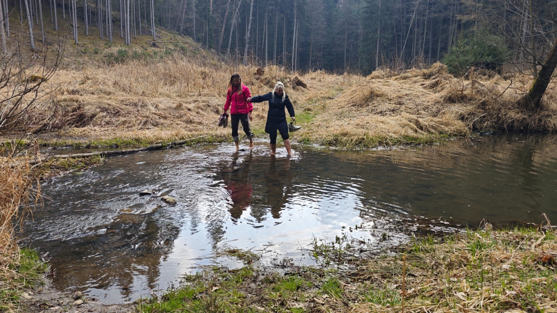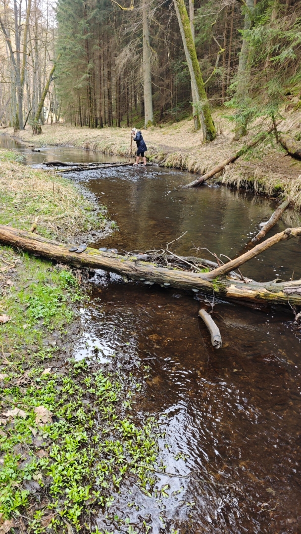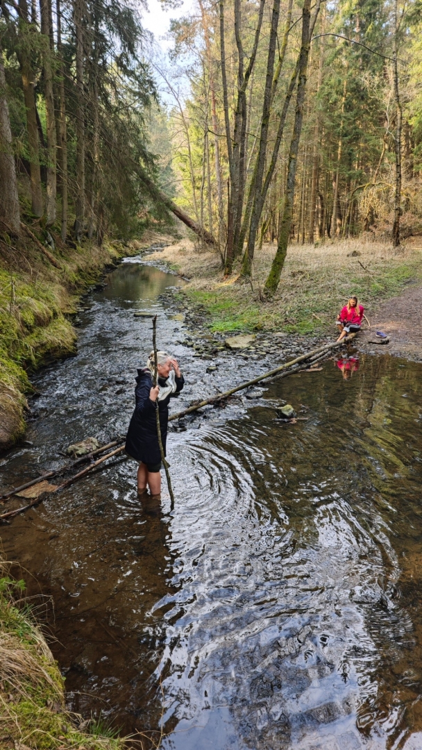 Vlastně moc netuším, jak to bude dnes zjara. Po sestupu se potok tváří mile, jdeme na můstek, kterým se přechází k Hodonicím, ale hned první brod nás ujistí, že projít k soutoku s Lužnicí až tak snadné nebude. Musíme si totiž zout botky, ponožky a pěkně ledovou vodou přebrodit na opačnou stranu potoka. Bereme do ruky mohutnou větev, jež nám bude sloužit jako hůl.
