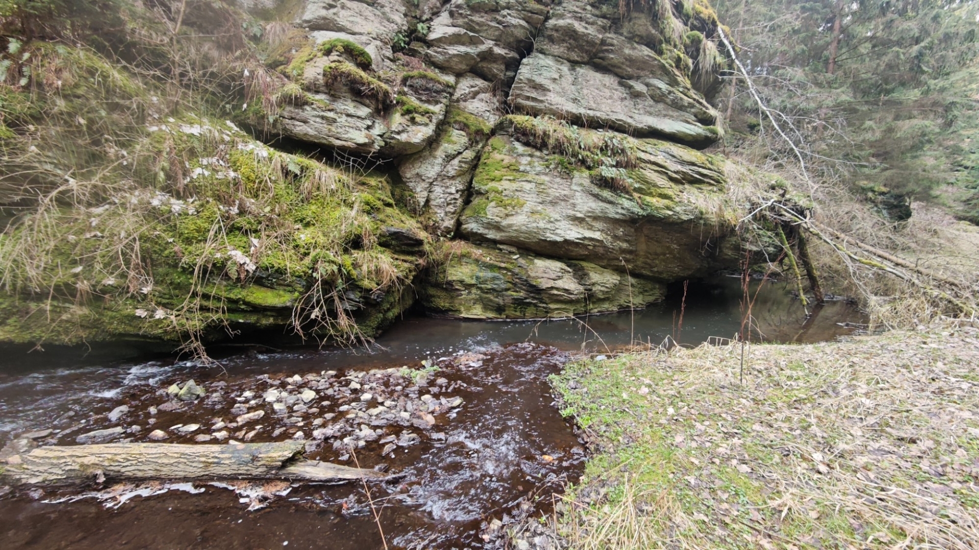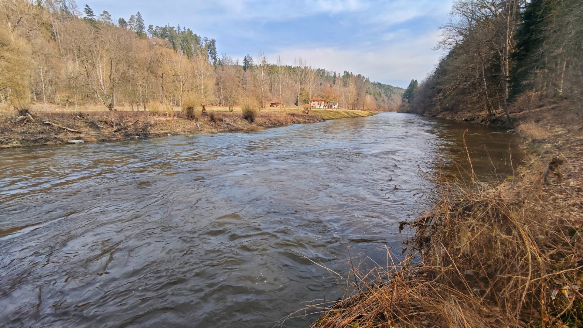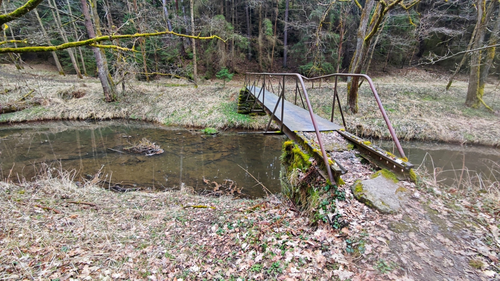 Vlastně moc netuším, jak to bude dnes zjara. Po sestupu se potok tváří mile, jdeme na můstek, kterým se přechází k Hodonicím, ale hned první brod nás ujistí, že projít k soutoku s Lužnicí až tak snadné nebude. Musíme si totiž zout botky, ponožky a pěkně ledovou vodou přebrodit na opačnou stranu potoka. Bereme do ruky mohutnou větev, jež nám bude sloužit jako hůl.
