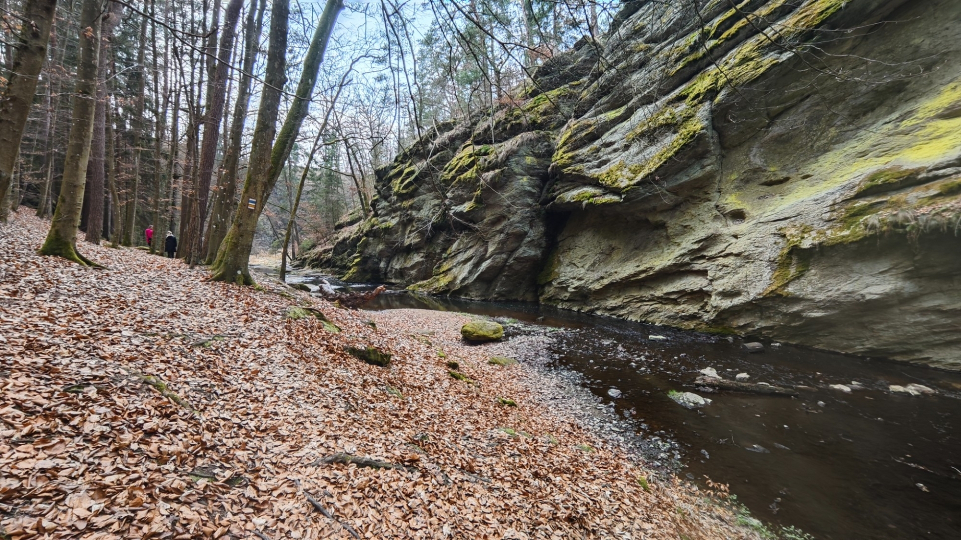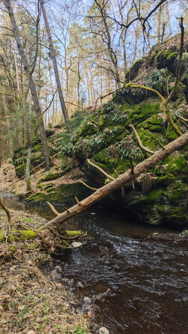 Za hlavní cestou pokračuje žlutá strmým sestupem k dalšímu z brodů, ale my výhodně obcházíme lesní cestou další ze zátočin Židovy strouhy, kudy je sestup pohodlný. Další přechody již zvládáme po kamenech, kládách či můstcích. Kaňon ohraničený skalními stěnami spolu s dalšími meandry mi připomene výlet Rychlých šípů do skal. Byly to právě jejich kreslené příběhy, které mě v dětství přiblížily přírodě. Díky za ně, ale i za mnoho knih, jež mne tvarovaly, patří "Jestřábovi" Jaroslavu Foglarovi.