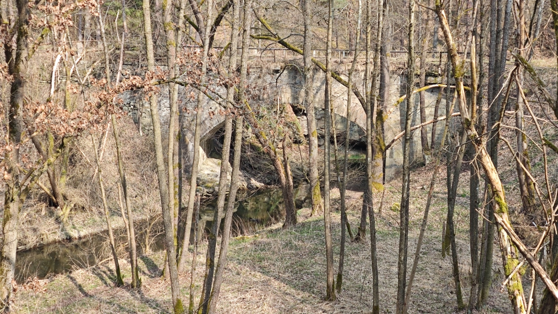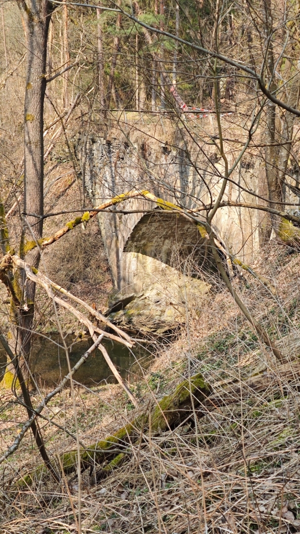 Potkáváme osamělého jedince a já mu hned sděluji, že dnes se kolem Židovy strouhy mohou vydat jen blázni. Moc ho moje hláška nerozesměje, naopak se zdá, že si to bere osobně. Dostáváme se k mostu, kterým přecházíme na hlavní silnici. Po starém kamenném mostě kdysi vedla silnice z Týna nad Vltavou do Bechyně.. Dnes je památkově chráněný. Moje snaha o nějakou trochu slušnou fotku vyjde vniveč. Slézat kvůli ní prudkým svahem dolů nebudu.