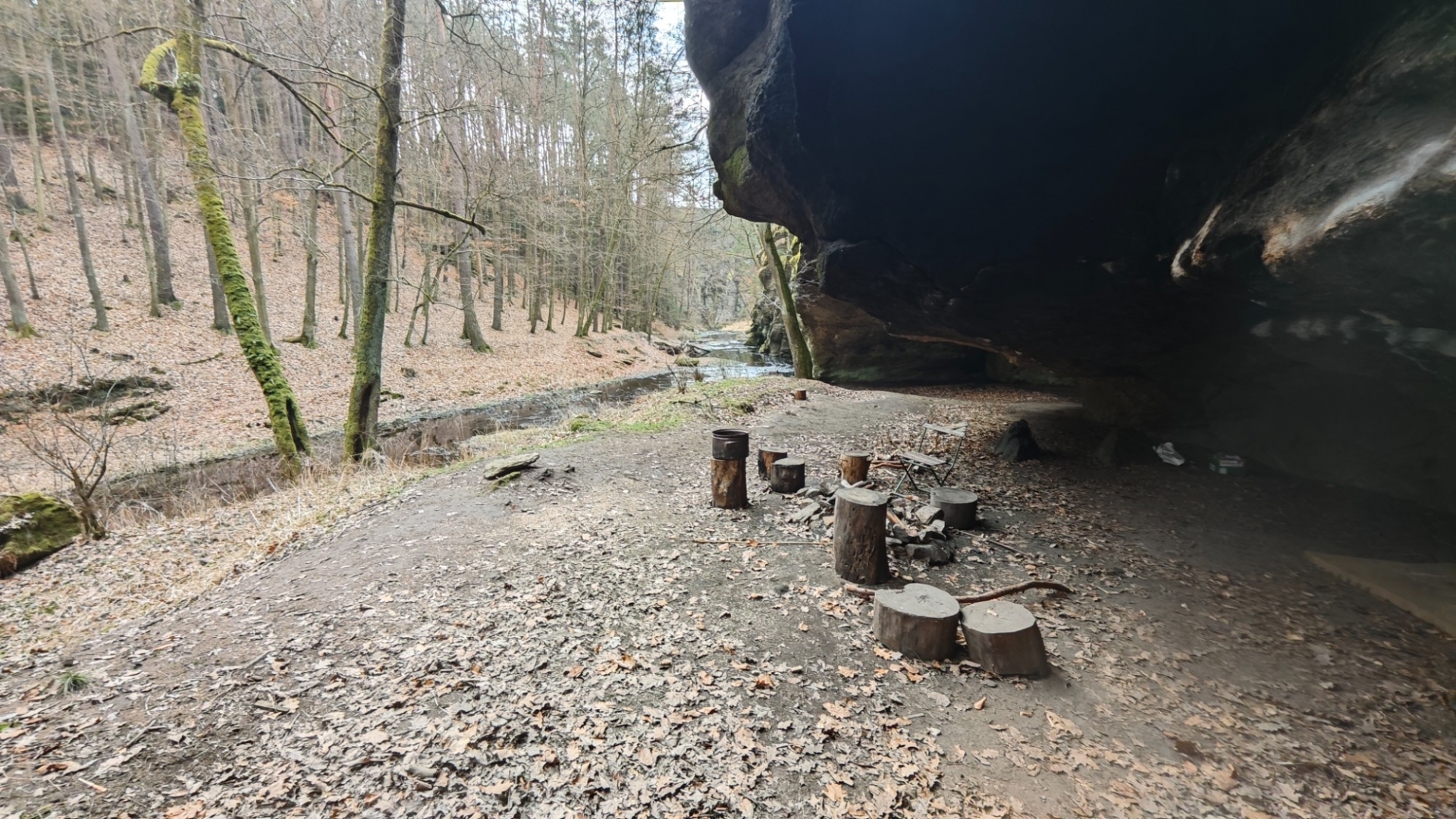 Bivak pod převisem je nedaleko soutoku Židovy strouhy a Lužnice.