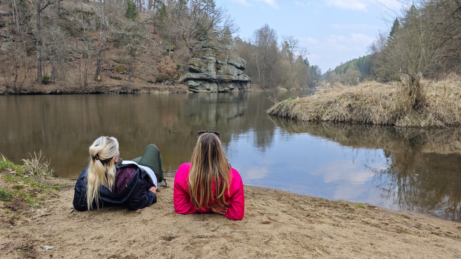 Hanka nás vede pod skalní převis, kde si s rodinou asi před rokem rozdělali oheň. Místo vhodné k přespání trampové často navštěvují. Já ho ze svého vandrování neznám, přece jen naše kroky vedly především na Šumavu. Dojdeme na můstek, který naposledy přetne Židovu strouhu. Stojíme u soutoku s Lužnicí. Písečný násep obsazují holky a já tvořím jeden z posledních obrázků. Hezké místo. Naproti vidíme poškozenou visutou lávku, po které jsme společně již párkrát přešli. Naše trasa z Kolodějů nad Lužnicí do Bechyně a zpět jednou pro část party skončila v hospodě na bechyňském náměstí, kam jsem pro ně musel z Kolodějů dojet. Vzpomínky a historii na podobné výlety na mnoho dalších míst máme s Jitkou a Hankou společné. Jen s kamarádem Luďkem již bohužel zavzpomínat nemůžeme. Život si občas vybere svoji daň.