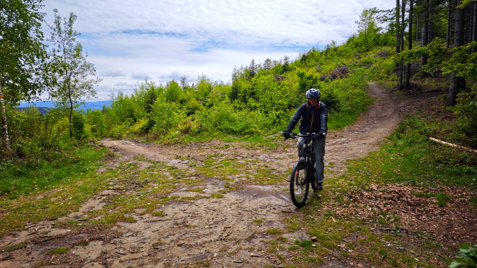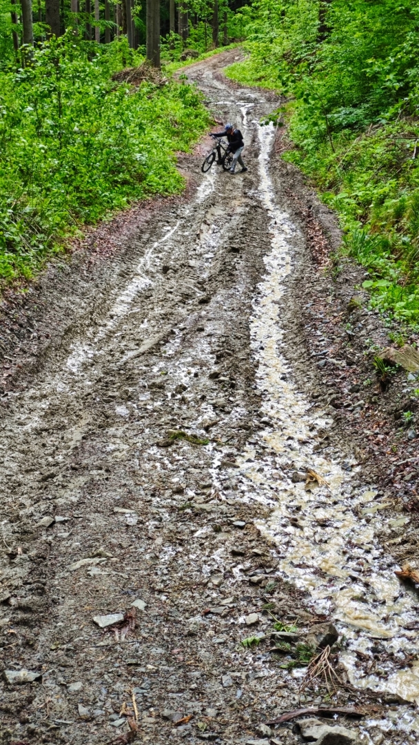 Mírné stoupání na Dinotice je příjemné, hezké údolí stejnojmenného potoku se postupně zužuje a zdvihá do hor. V Javorové dolině se vše změní. Cesta se dělí a začne rychle nabírat výšku. Horší je, že je rozježděná od těžkých aut, která tady vyjela hluboké koleje. Vidíme uhlazenou stopu, jak dolů táhla kmeny stromů. Jílovitý povrch včerejší vydatný déšť proměnil v mazlavou, kluzkou hmotu. Jirka vede kolo již od rozcestí, aby nepřehřál motorek, já jedu vzhůru, dokud z kola nespadnu. Zablácená cesta stále nabírá na strmosti. Výš počkám na Jirku, protože nevím, jestli to nevzdá. Sám o tom uvažuji, ale hřeben není zase tak daleko. Dále vedeme kola a jsme stále víc zablácení. Walk+ elektrokol sice jde využít, ale zadní kolo často podkluzuje.