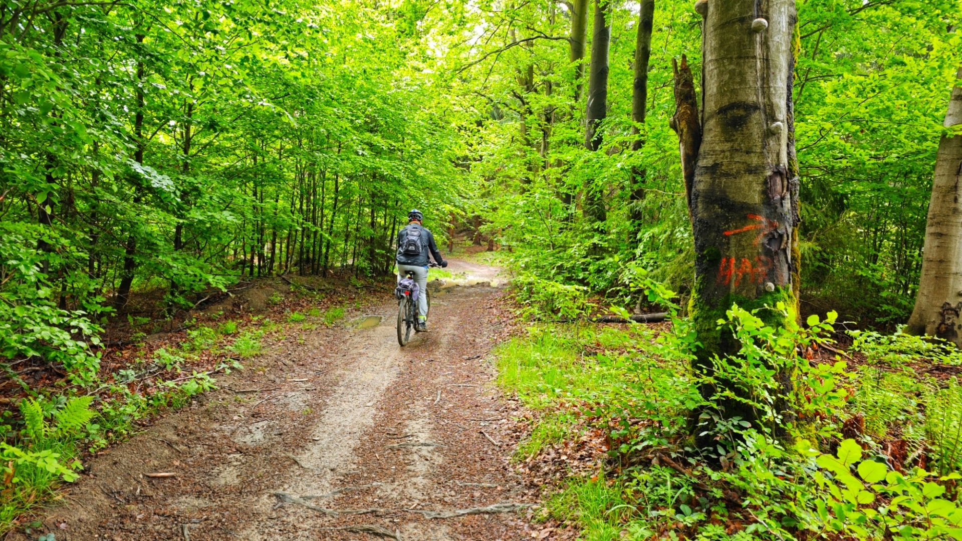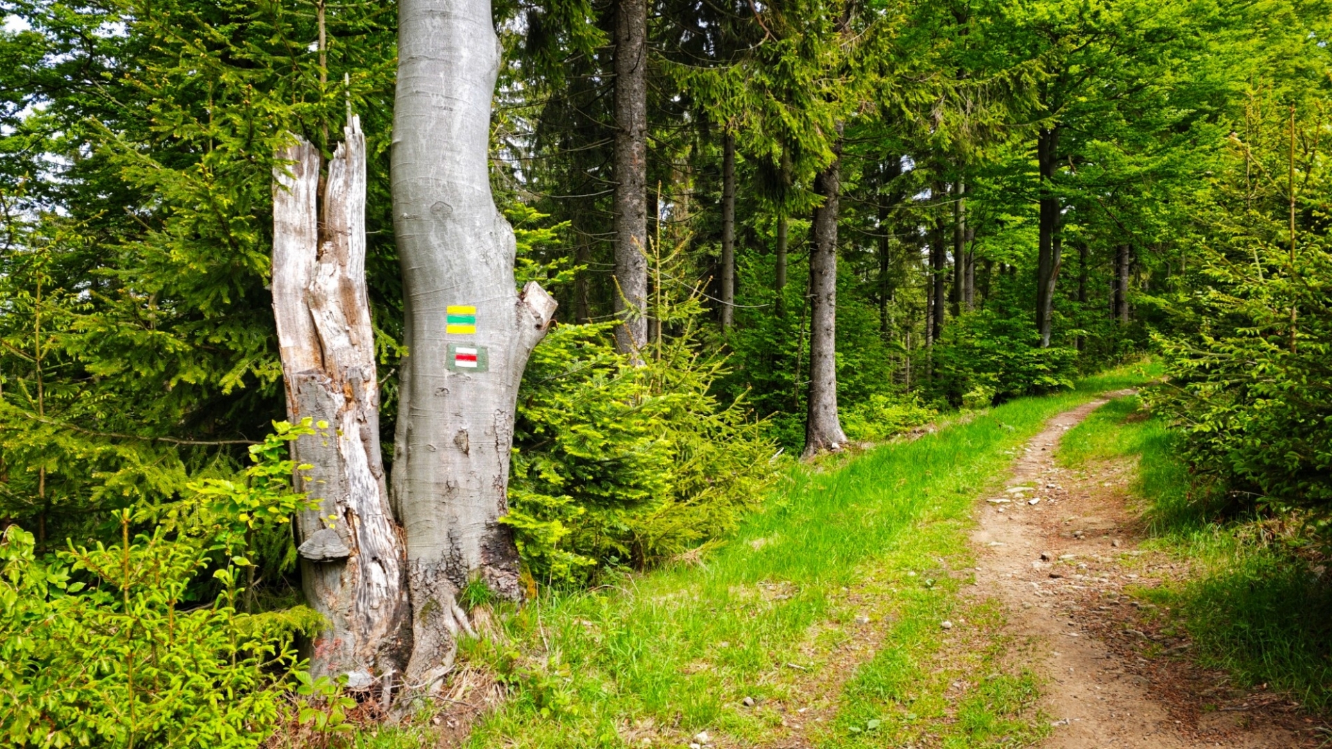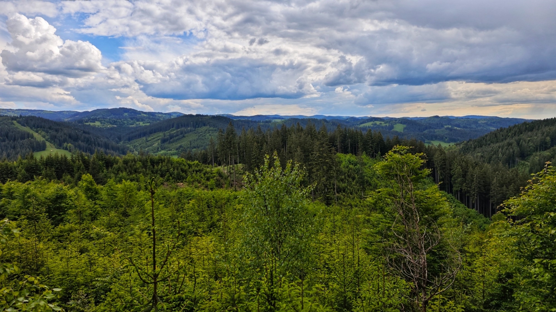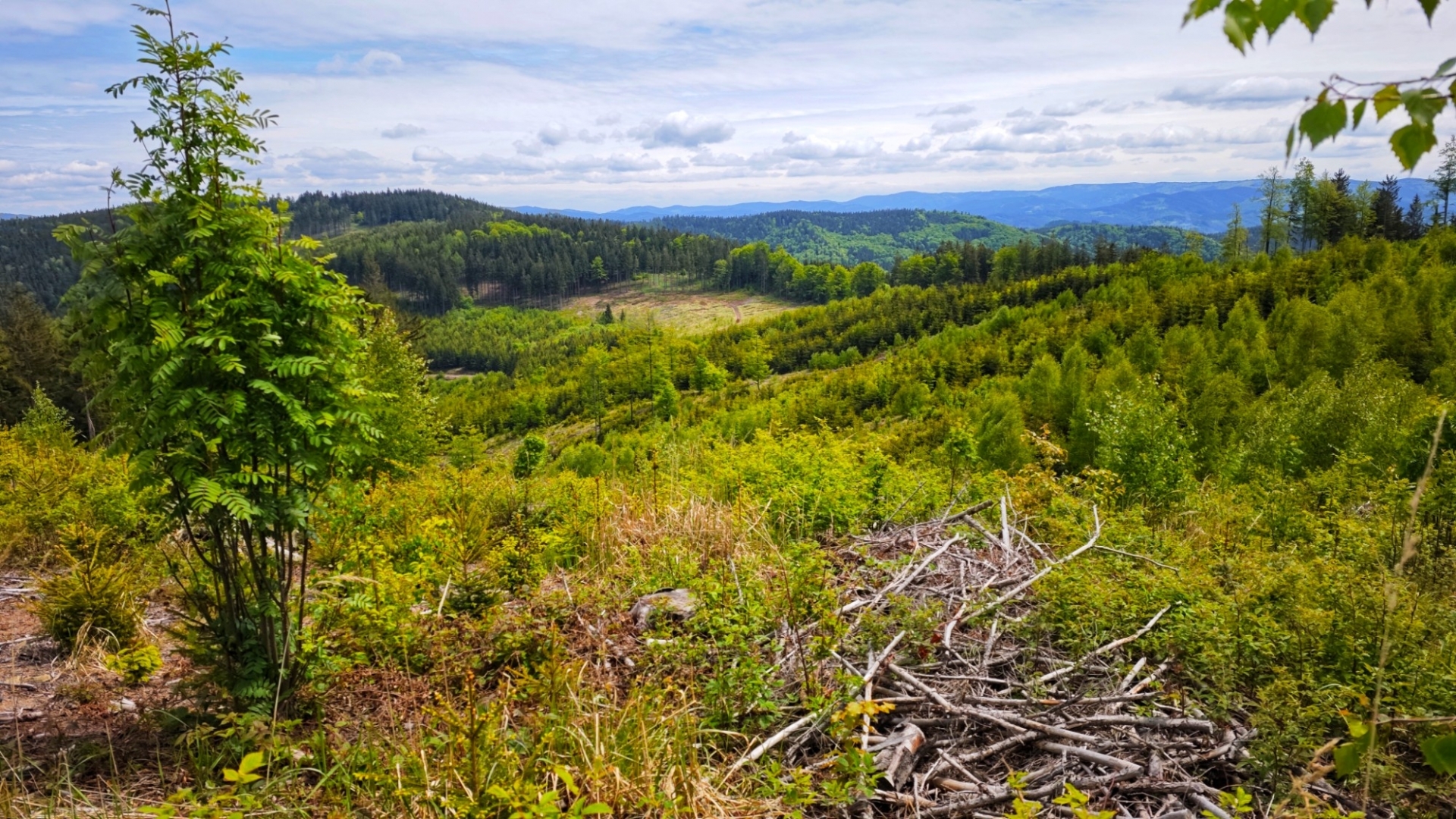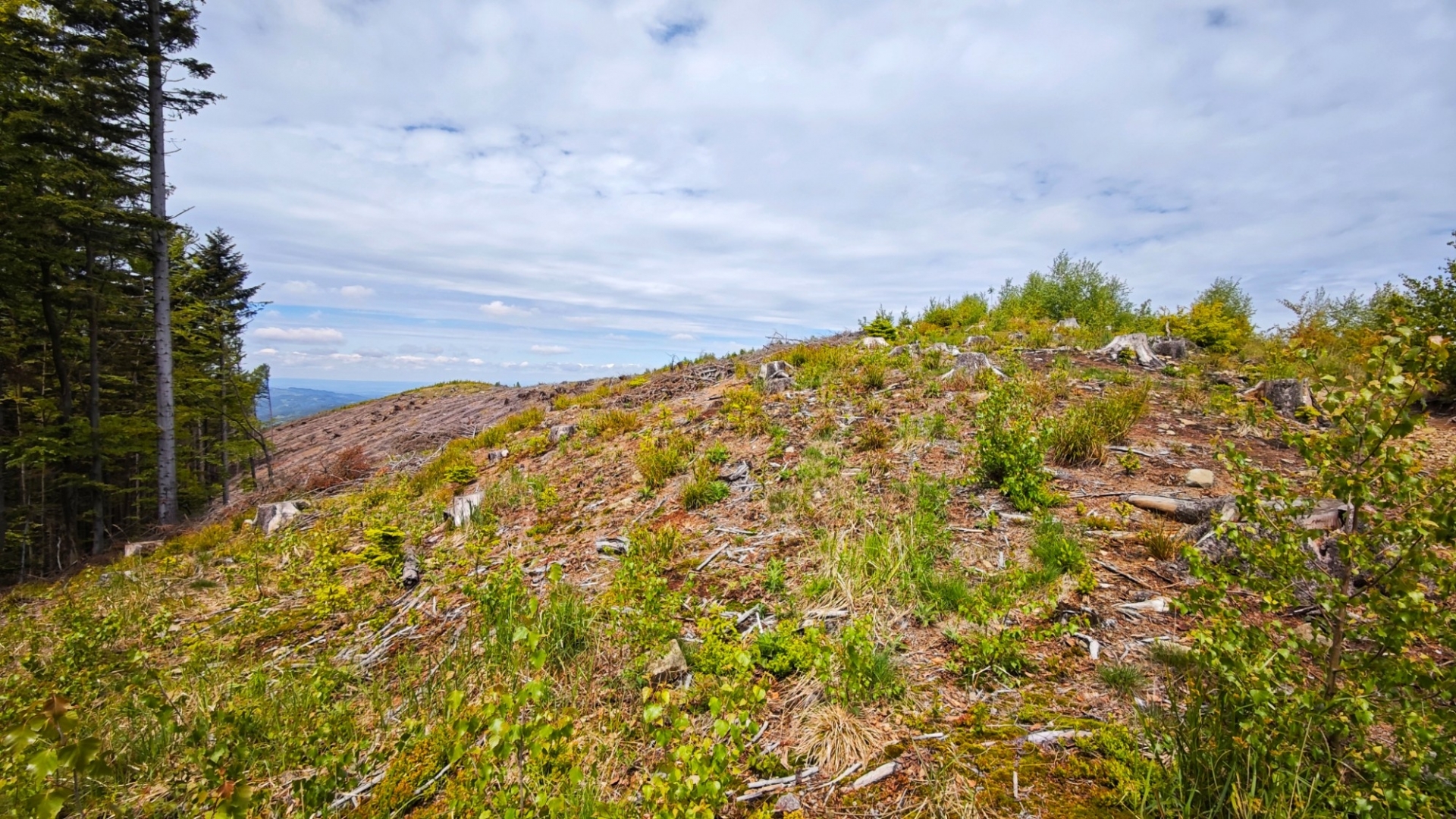 Největších nánosů bahna se nesnažím zbavit drbáním zad a boků o vzrostlý smrk, ale prostě se je odstraním v loužích, jichž je na cestě po včejšku dost. Ty hlubší louže si pak i projíždím, abych ulevil od bláta i svému biku. Jsme na vytoužené hřebenovce kousek za vrcholem Ptáčnice (830 m n. m.). Je to velká úleva jet po stezce, kterou nezničili dřevorubci. Jsme na trase Via Czechia centrální, kde si to jen tak netroufnou. Ovšem před výjezdem na hřeben po cyklotrase č. 6120, ale i treku po zelené důrazně varuji. Po dešti to rozhodně nezkoušejte.
