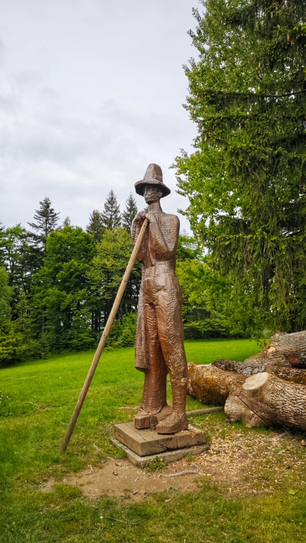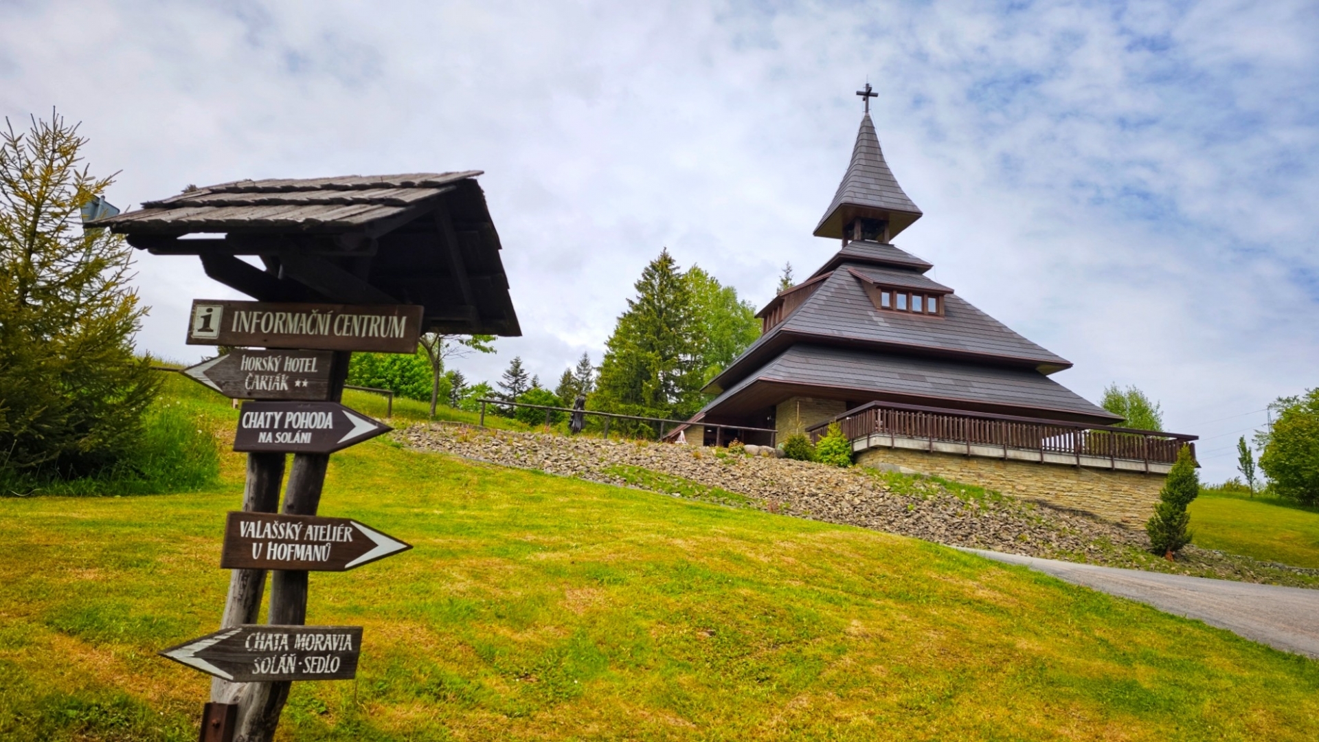 Za vrcholkem Leští již klesáme k Čarťáku na Soláň. Horský hotel má venkovní terasu zavřenou a tak jdeme špinaví dovnitř. Než si nás stačí obsluha pořádně všimnout, jdu se opláchnout na WC, kde se snažím očistit i zamatlané kalhoty. Z bot bahno opadalo cestou. Dáme si oběd, já z obřího bramboráku s masem sním polovinu a druhou si nechám zabalit. Potom projedeme kolem dřevěné zvonice z roku 2006 a dřevěných soch po NS Přes hřeben Soláň. U kóty 851 m se rozhodneme nepokračovat dál hřebenem přes Kotlovou až na Benešky a složitě sjíždíme lesem přes několik samot k nově vyasfaltované hlavní cestě, spojující Velké Karlovice s Rožnovem pod Radhoštěm. Po ní jsme u našeho penzionu cobydup.