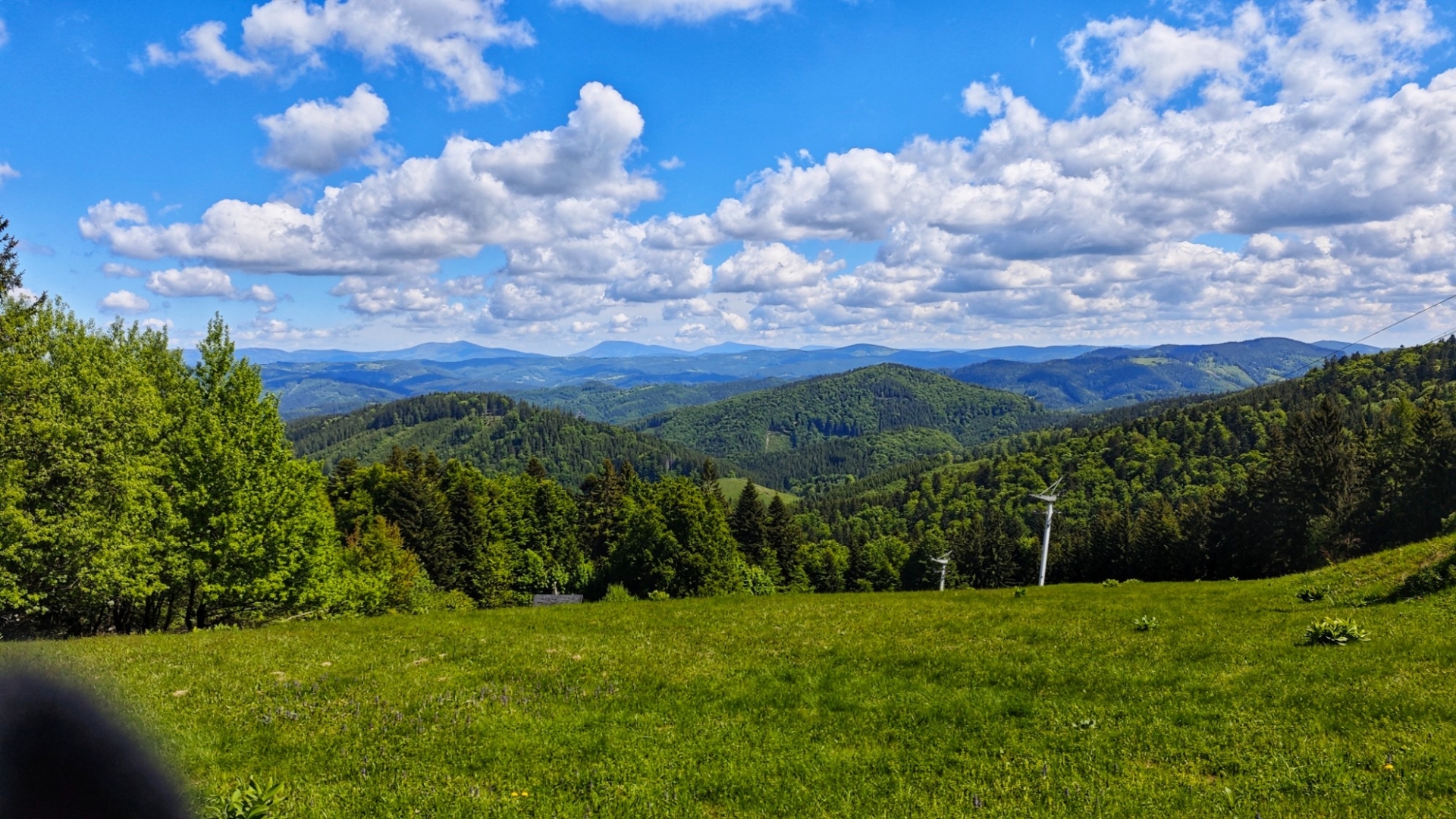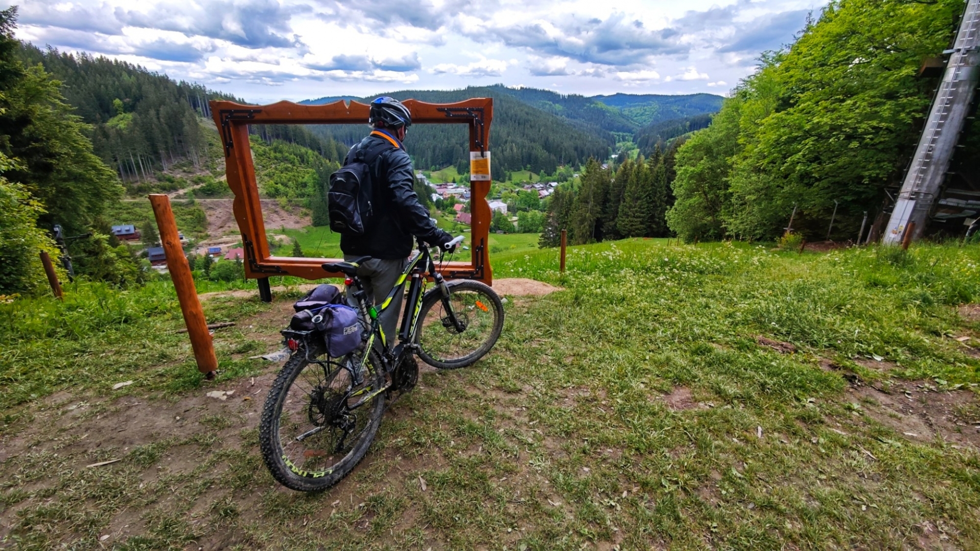 Já s Jirkou nasedáme na elektrokola a jedeme dolů kolem Vsetínské Bečvy. Celé široké údolí je zastavěné a my postupně projedeme Velké Karlovice, Karolínku, Nový Hrozenkov a teprve za Halenkovem odbočíme po cyklotrase k hřebenu Vsetínských vrchů. Ty ještě patří do většího celku Beskyd. Stále je chladno, jedu dobře oblečený a v rukavicích na běžky. Květen je letos mimořádně chladný, oteplení alespoň o 2°C bych přivítal. Ale to by jistě v Grónsku roztály ledovce.